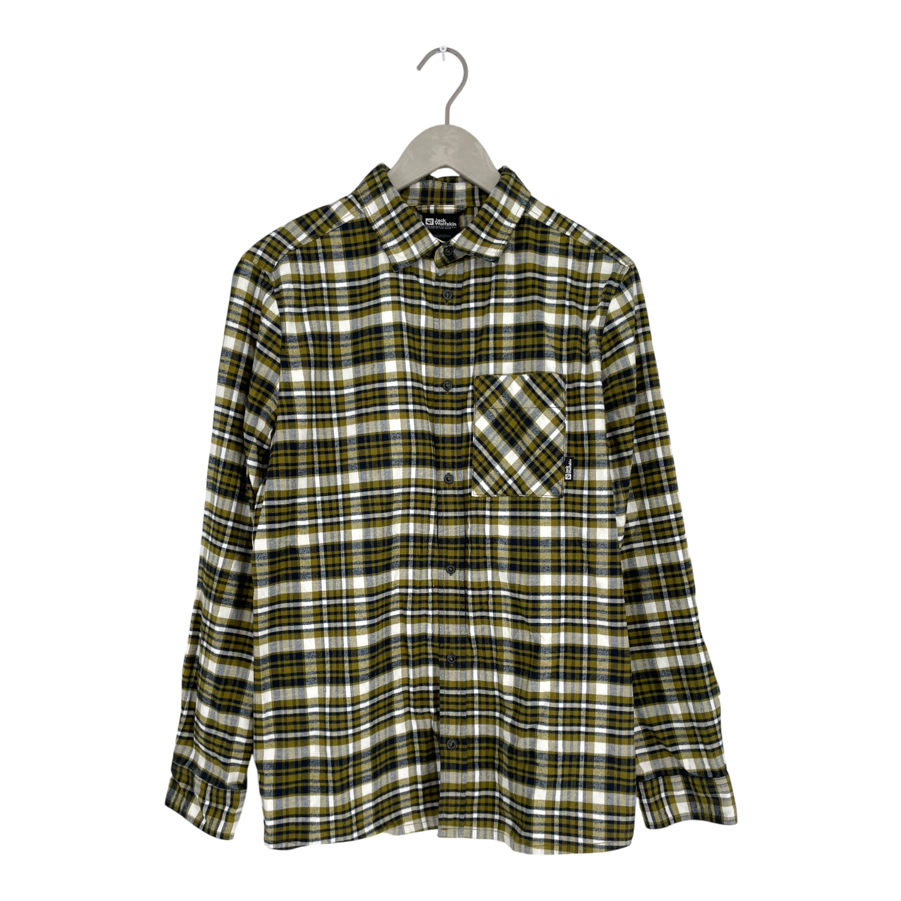 Jack Wolfskin long-sleeved flannel shirt with collar and one pocket.