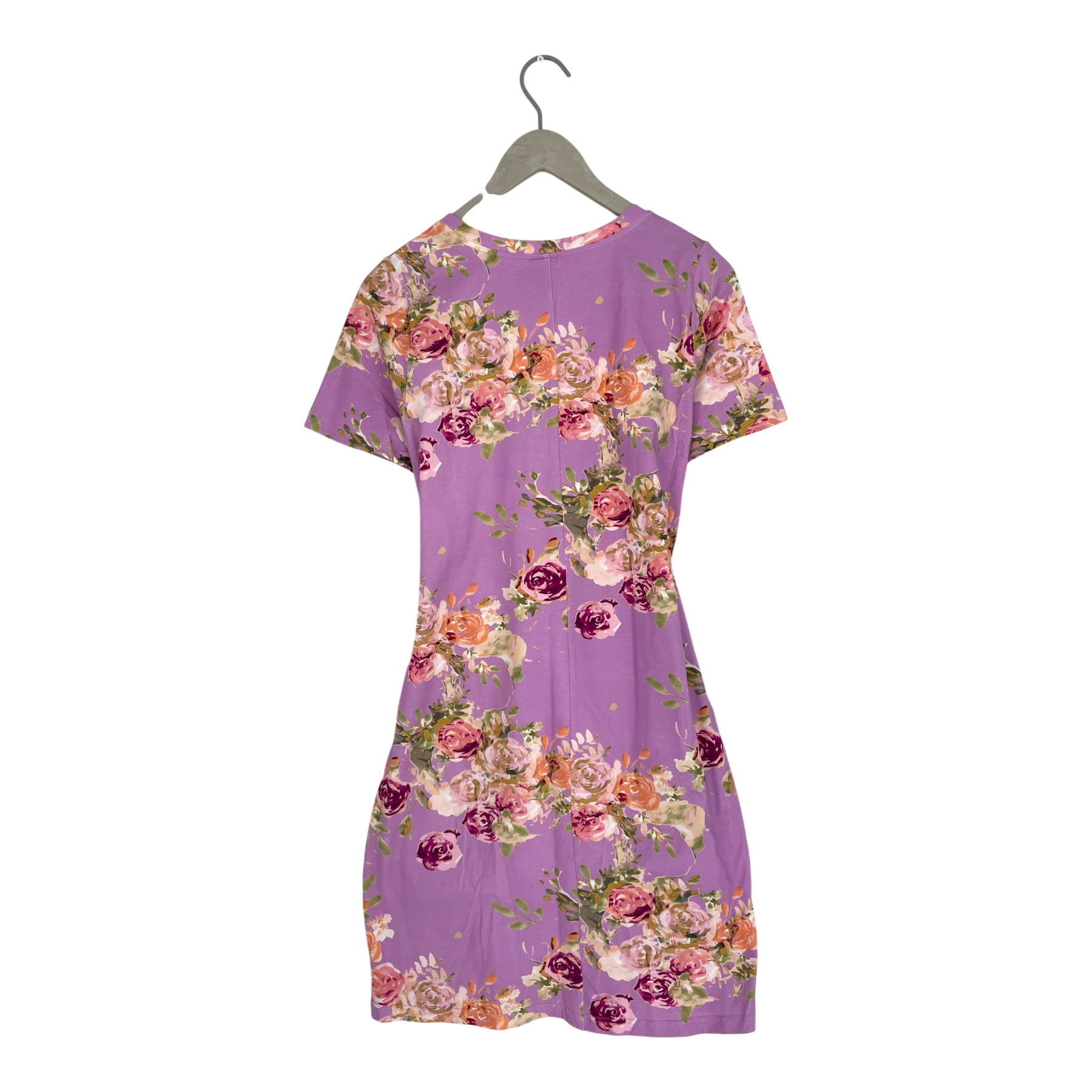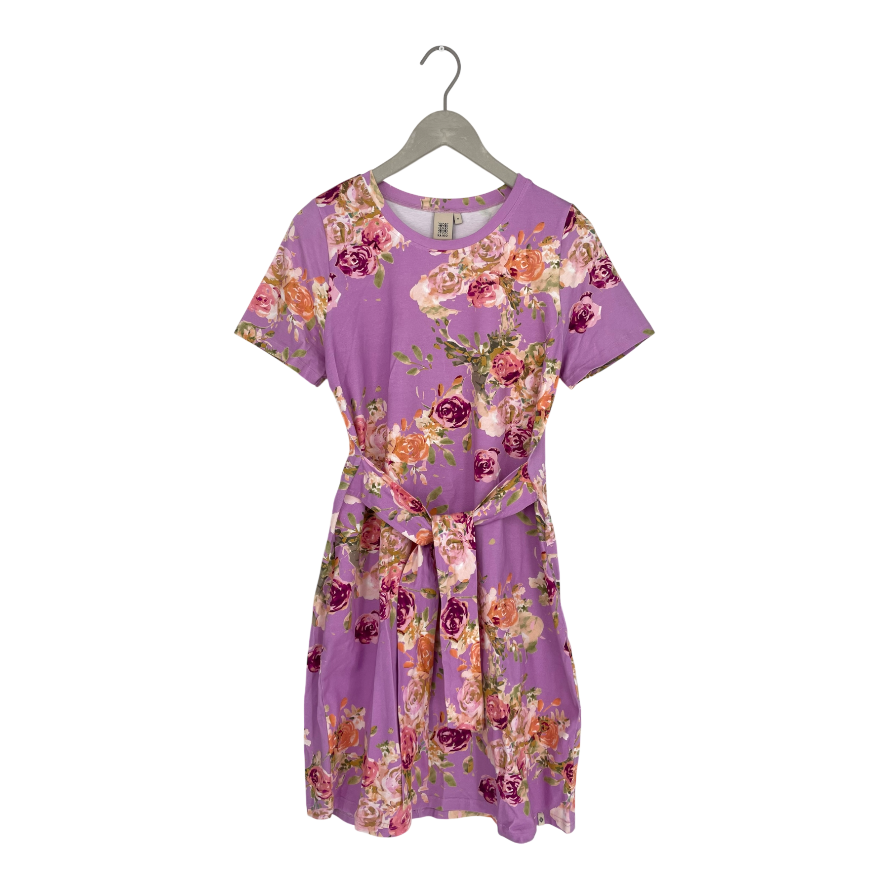Kaiko belted dress in Rose yard print has a slim figure-hugging fit. Wide ribbons at the waist can be tied at the front or back. The dress has a rounded neckline, and the hem reaches down approximately to the knees.