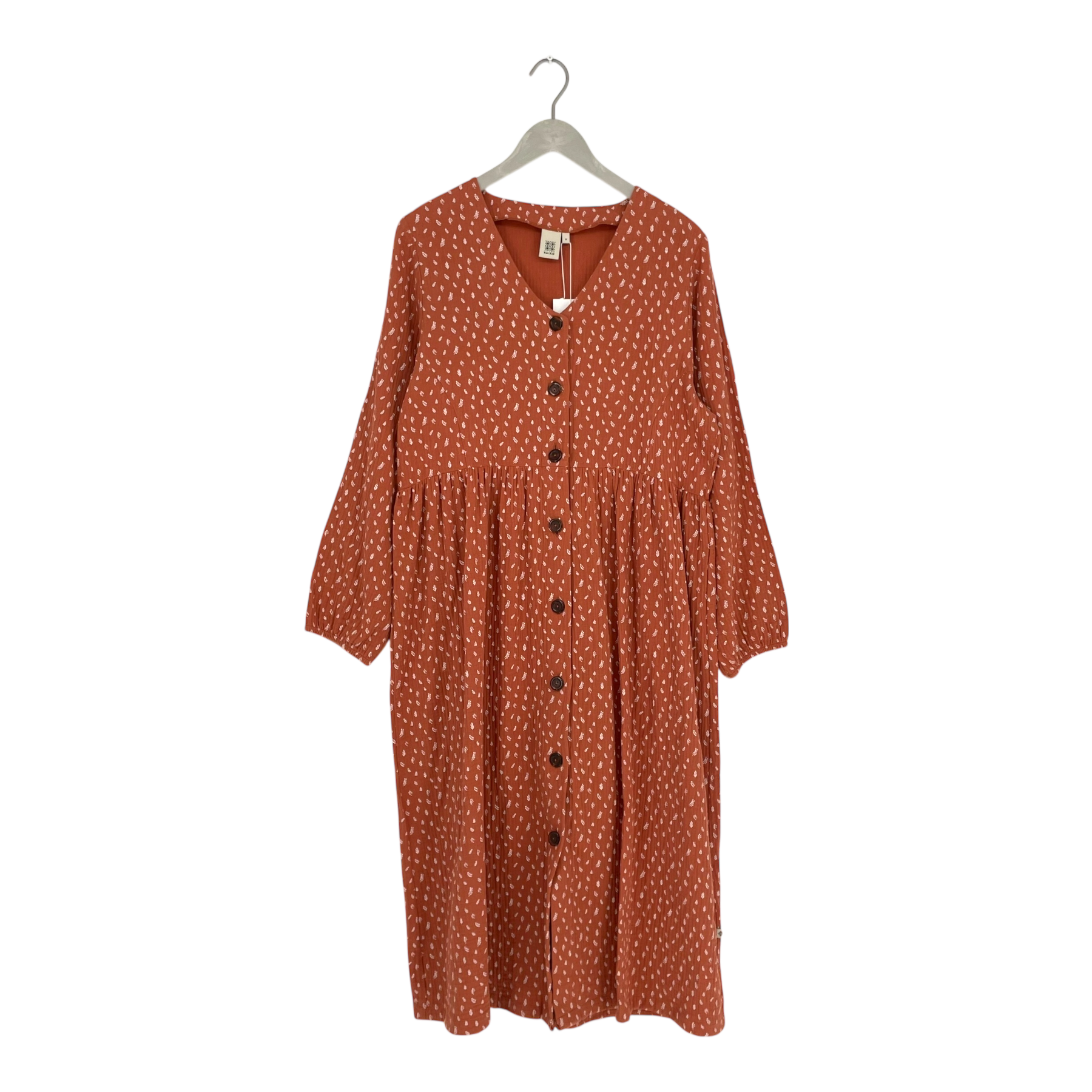 Kaiko button dress in - print. The bodice is sewn with a princess seam, and the dress has a button closure. The hem is slightly gathered on the waist, and there is elastic on the cuffs.