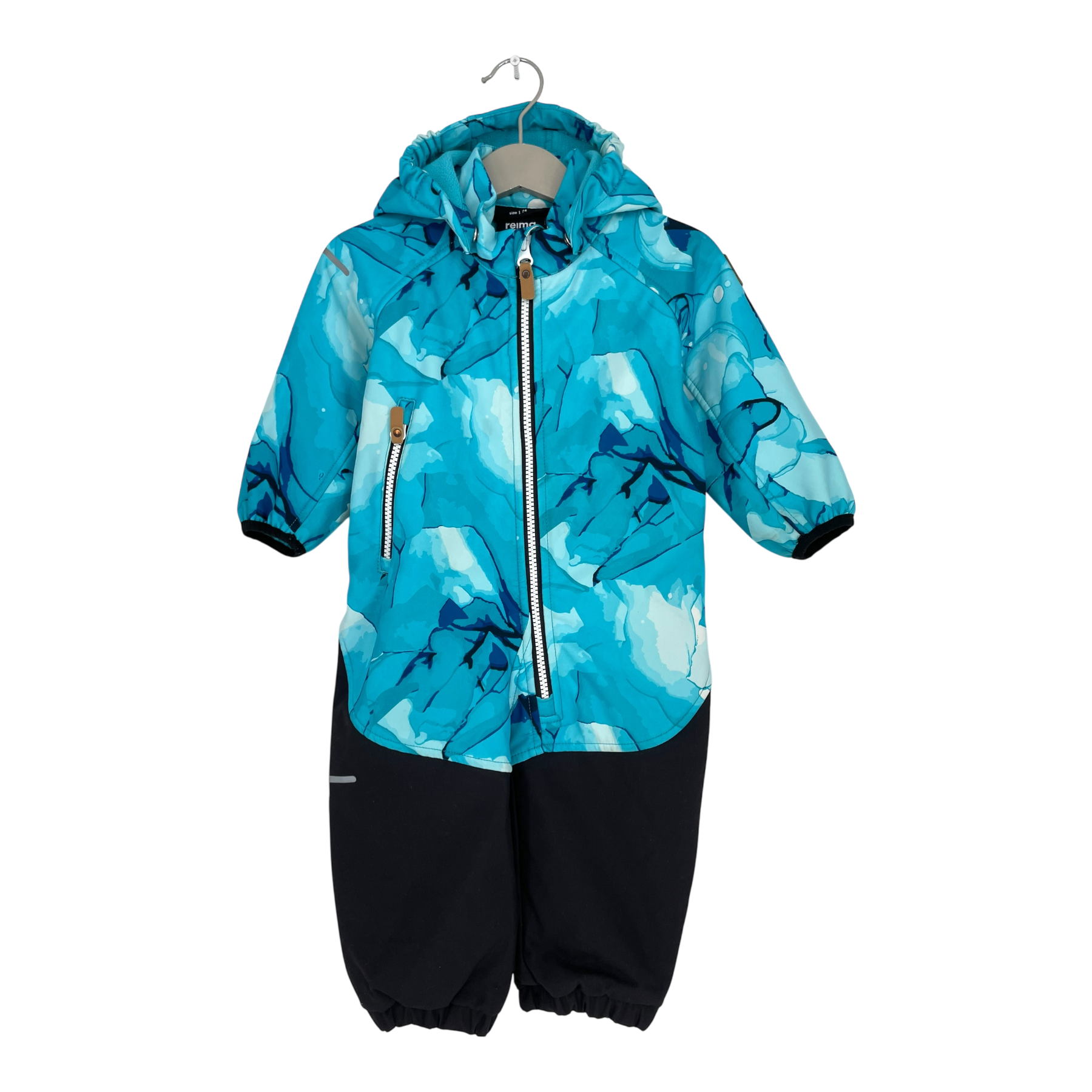 Reima Mjosa softshell midseason overall with detachable hood, one zipper pocket, and detachable foot loops. The material is originally waterproof and the bottom part is very durable.