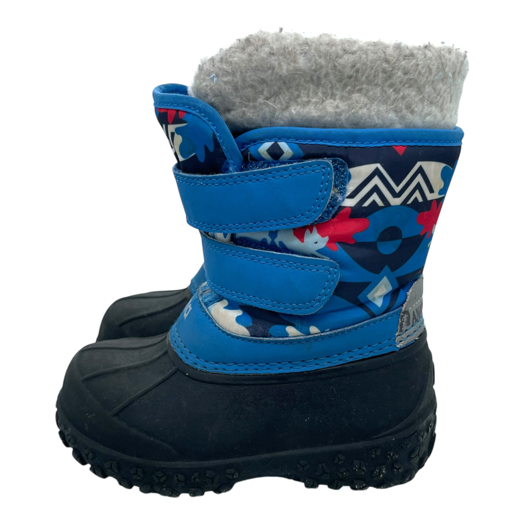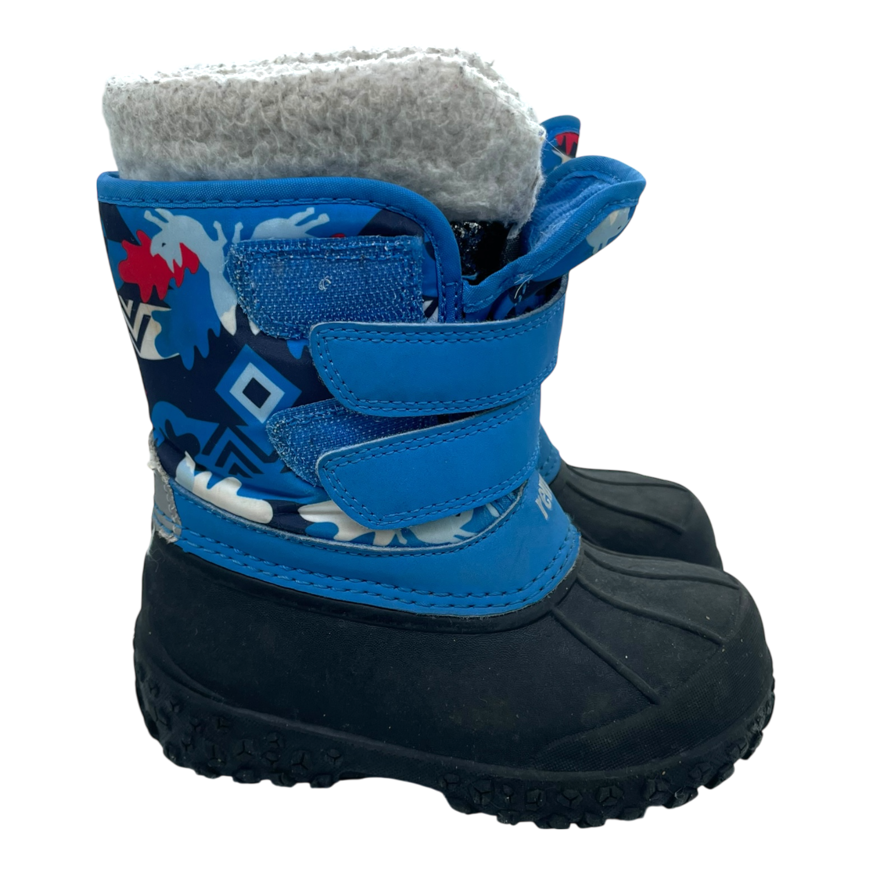 Reima Konkari winter duck boots with two velcro fastenings. Shoes have a waterproof galosh section in durable thermoplastic rubber. Protects from slush on wet days. The boots have some visible dirt and pilling of the inner lining, as shown in the pictures.