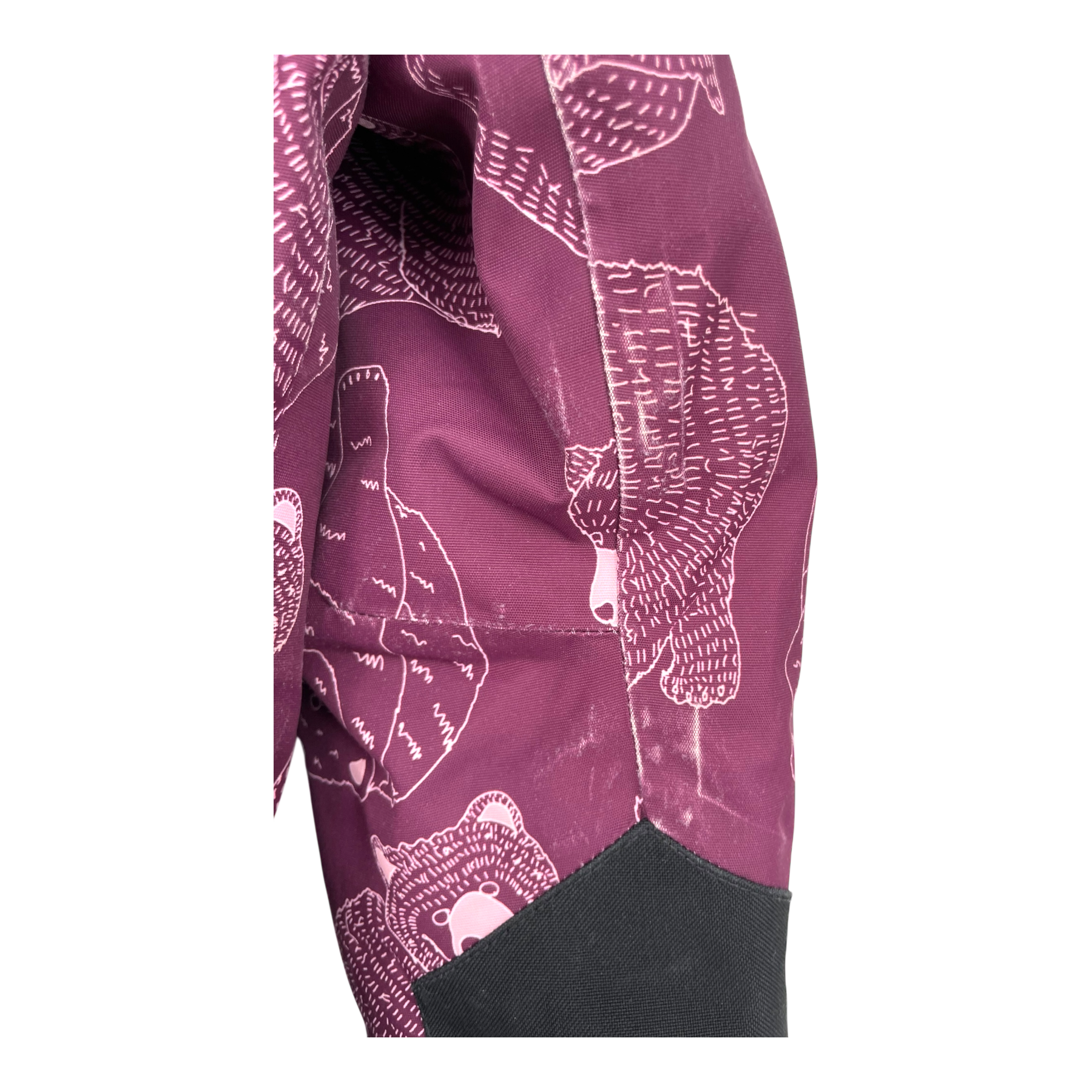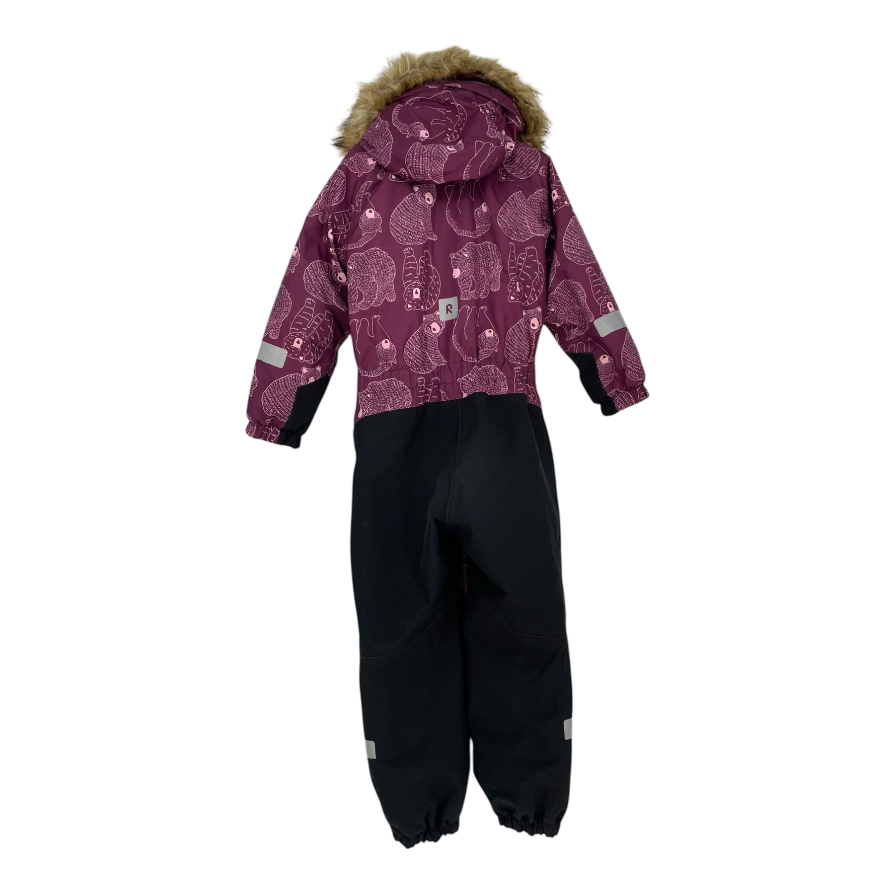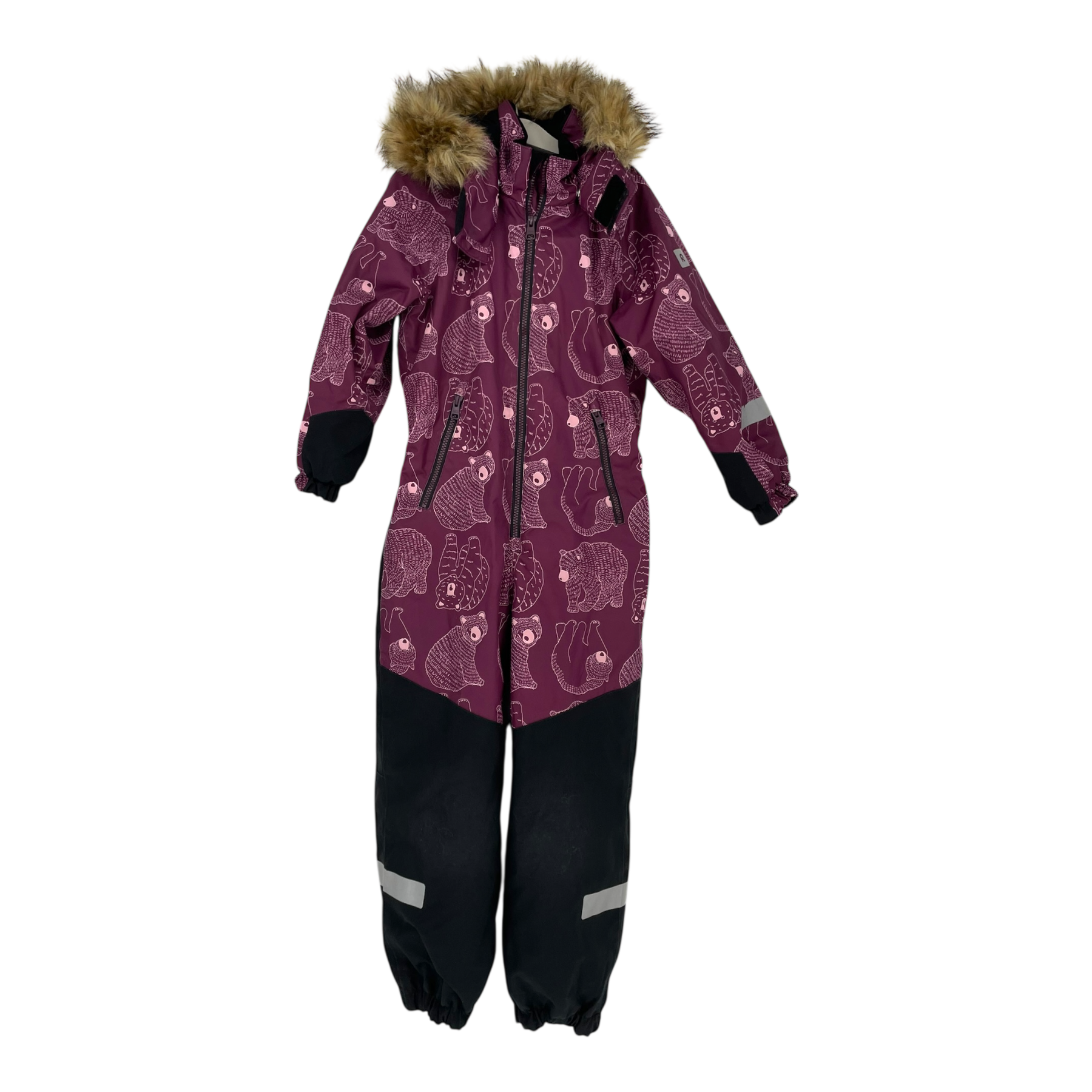 Reima Krossfjorden overall for winter. Originally waterproof and all seams are sealed. Durable material with very durable bottom part. This overall has detachable hood, elastic cuffs, two zip pockets, elastic waistband at back, detachable silicone foot loops and reflecting details.