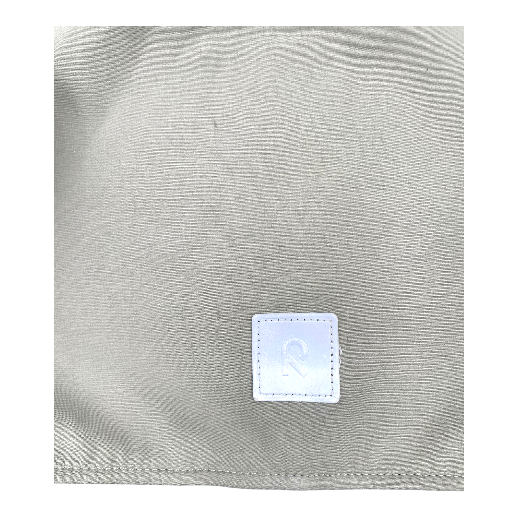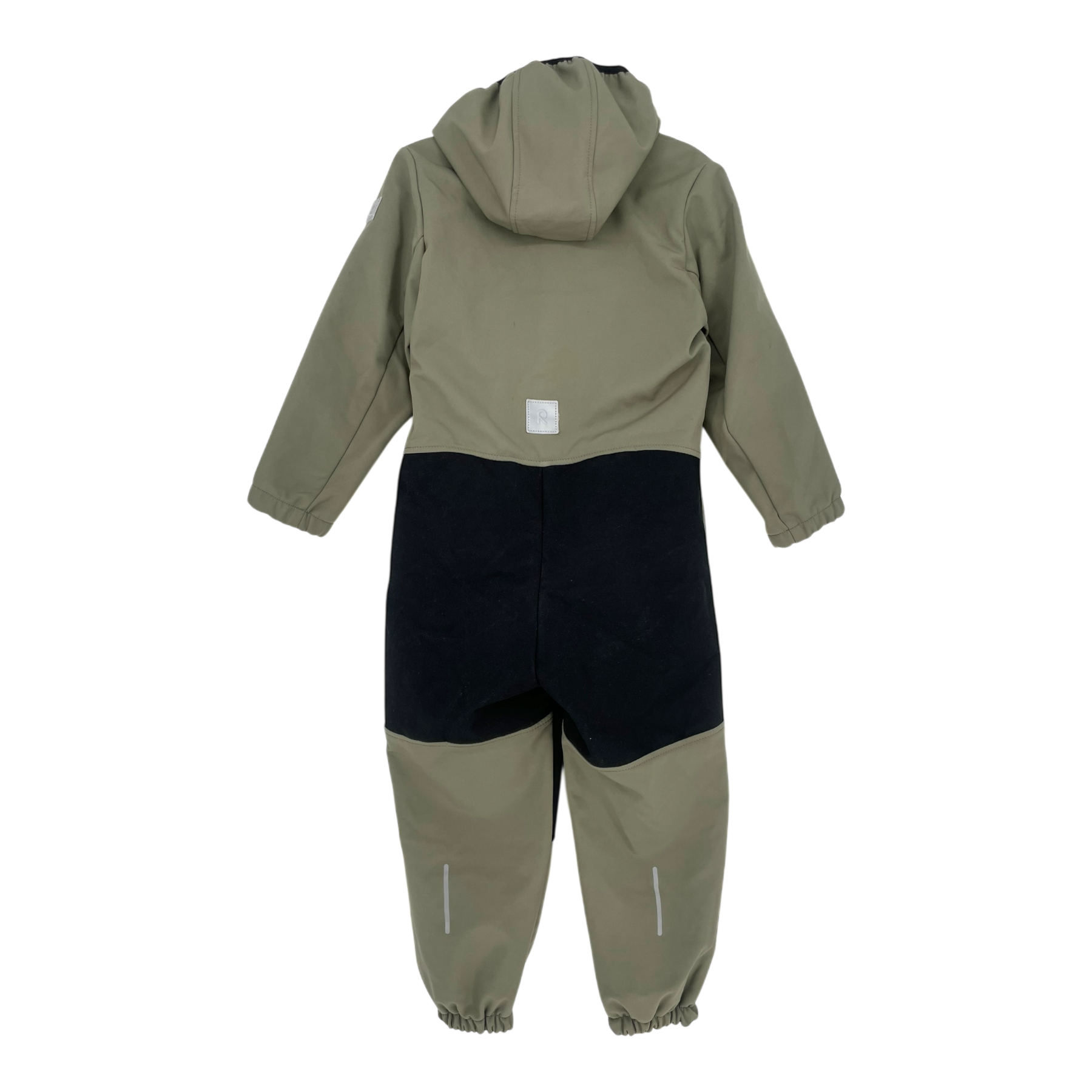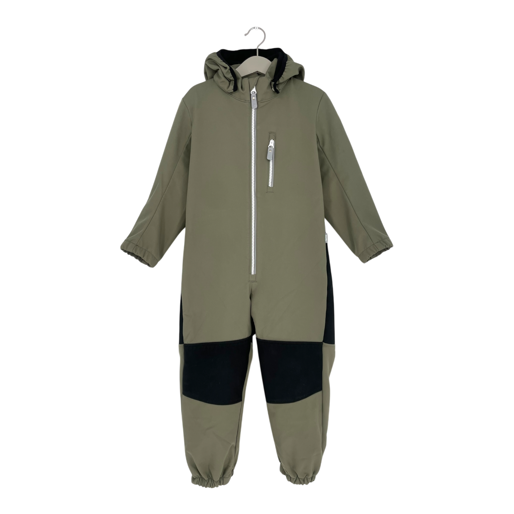 Reima Nurmes softshell midseason overall with detachable hood, a zipper pocket, and zip fastening. The surface has been treated with a water-repellent finish. Elastic cuffs at wrists and leg ends, together with durable, detachable silicone foot loops.