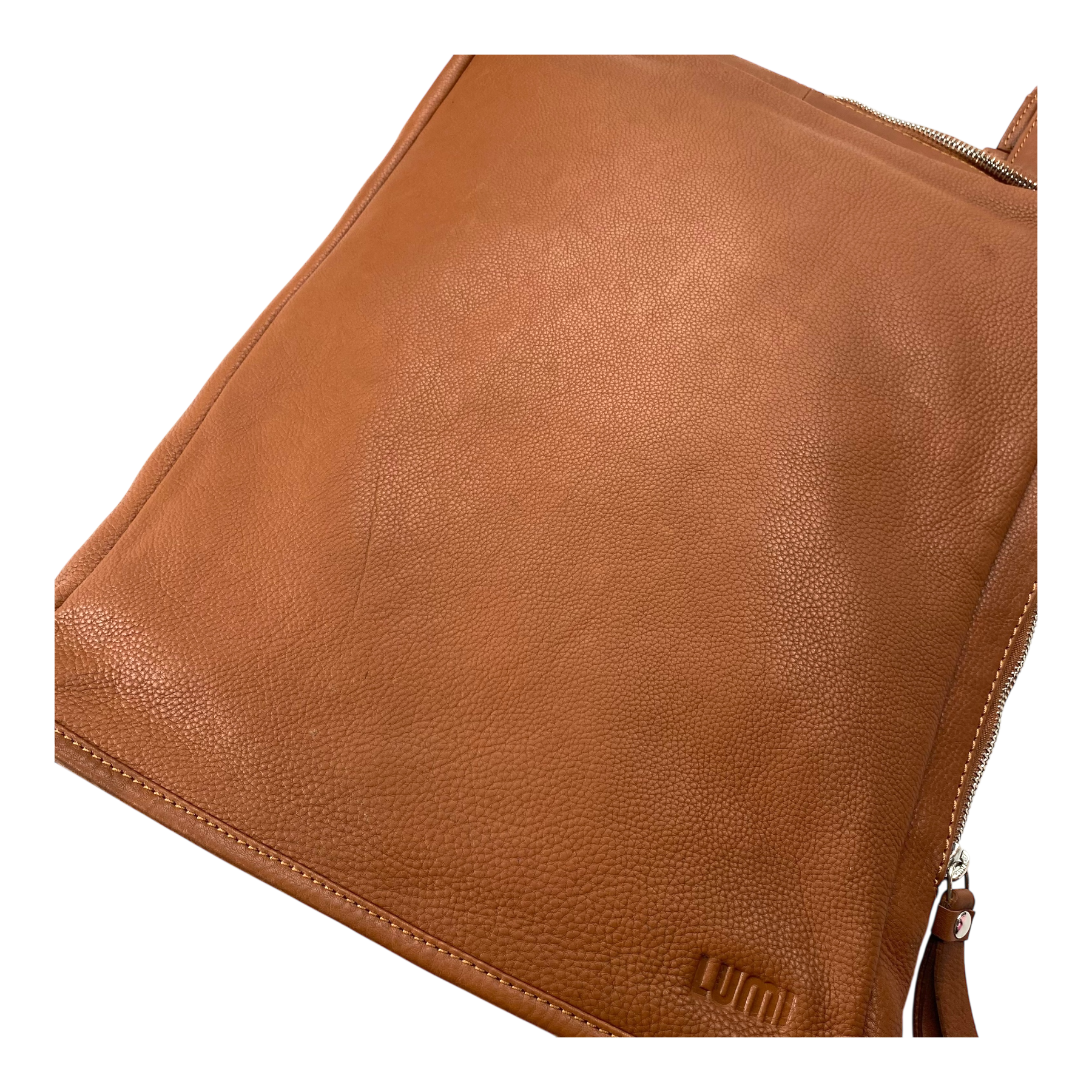 Lumi compact laptop supermarket bag that has cotton twill lining, is made out of cow hide leather and has silver hardware. Multiple pockets and key fob in the main compartment, padded laptop slide compartment plus an extra zippered pocket on the back. The main compartment has a zipper closure. Fits the daily essentials, A4+ sized documents, standard 13-15″ laptops etc.