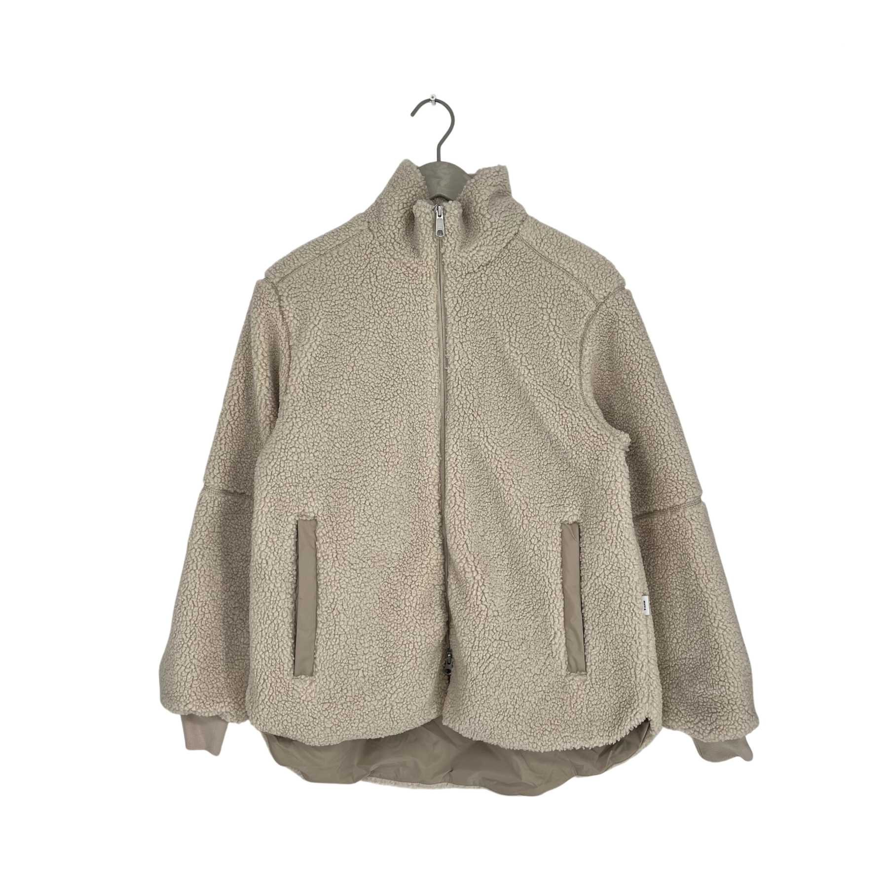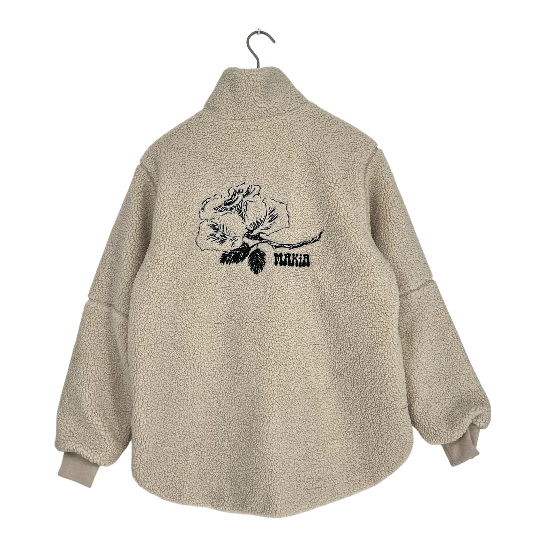 Makia Rose fleece jacket with collar and a zipper closure in the front. Rose embroidery on the back. There is a thin lining.