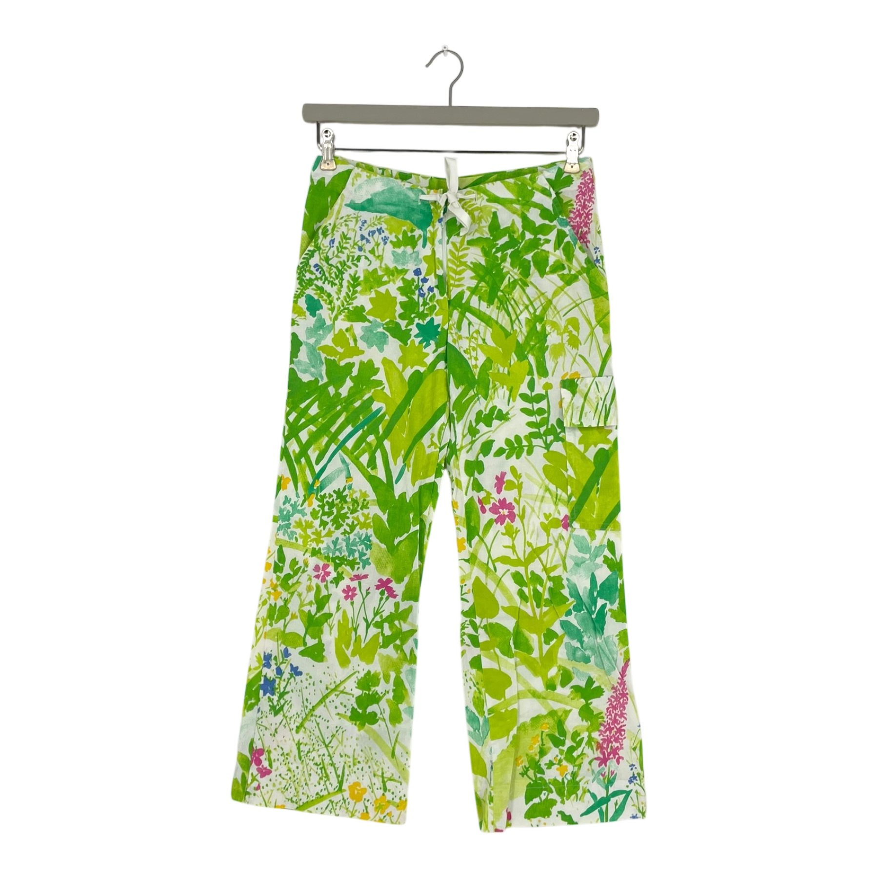 Marimekko vintage pants in bright flower print. Fabric drawstring tightening on the waist, zipper closure and two pockets. This item is a vintage item in the Marimekko size 2, which corresponds approximately to women´s size S.