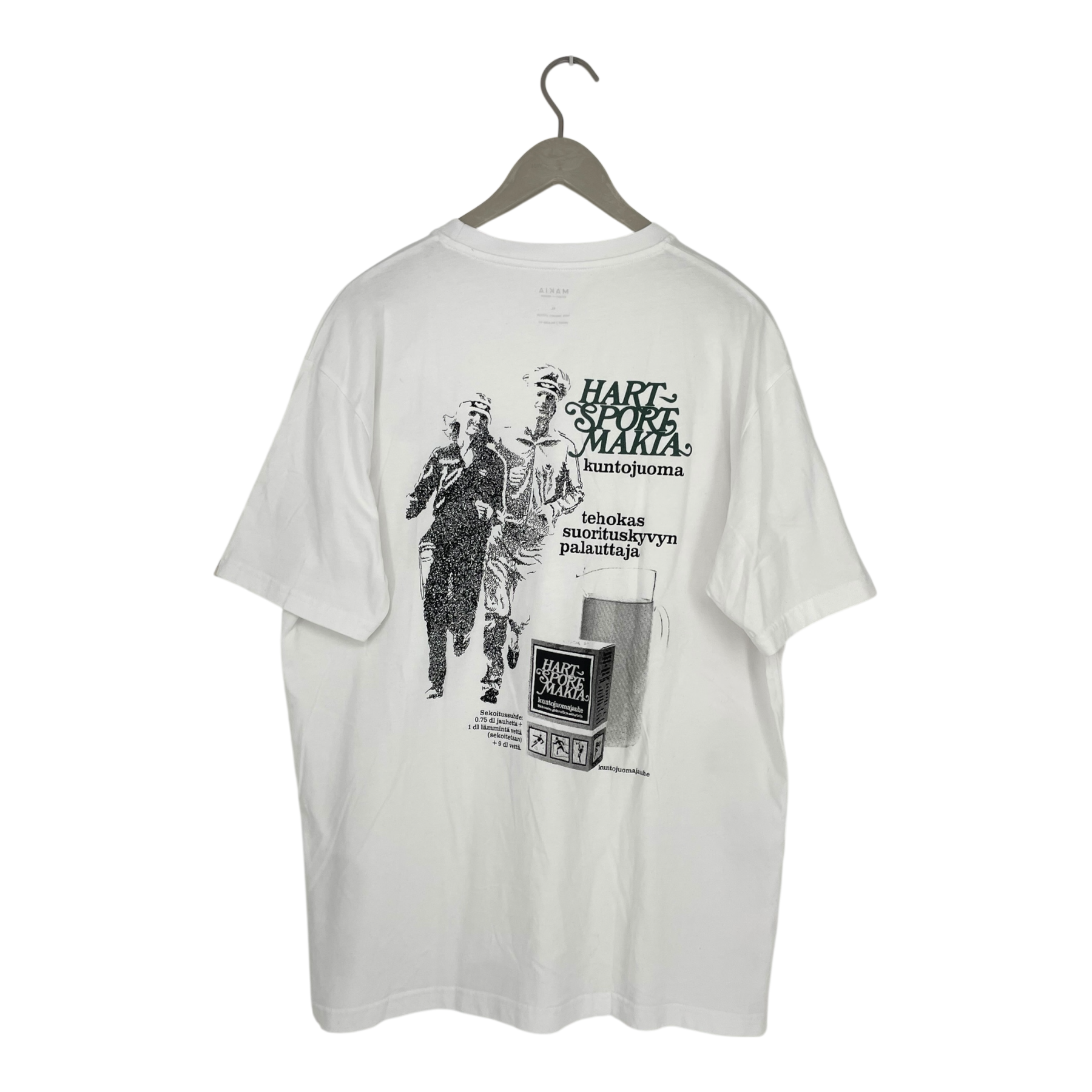 Makia t-shirt with a Hart Sport Makia logo on the front and a print on the back. Longer style.