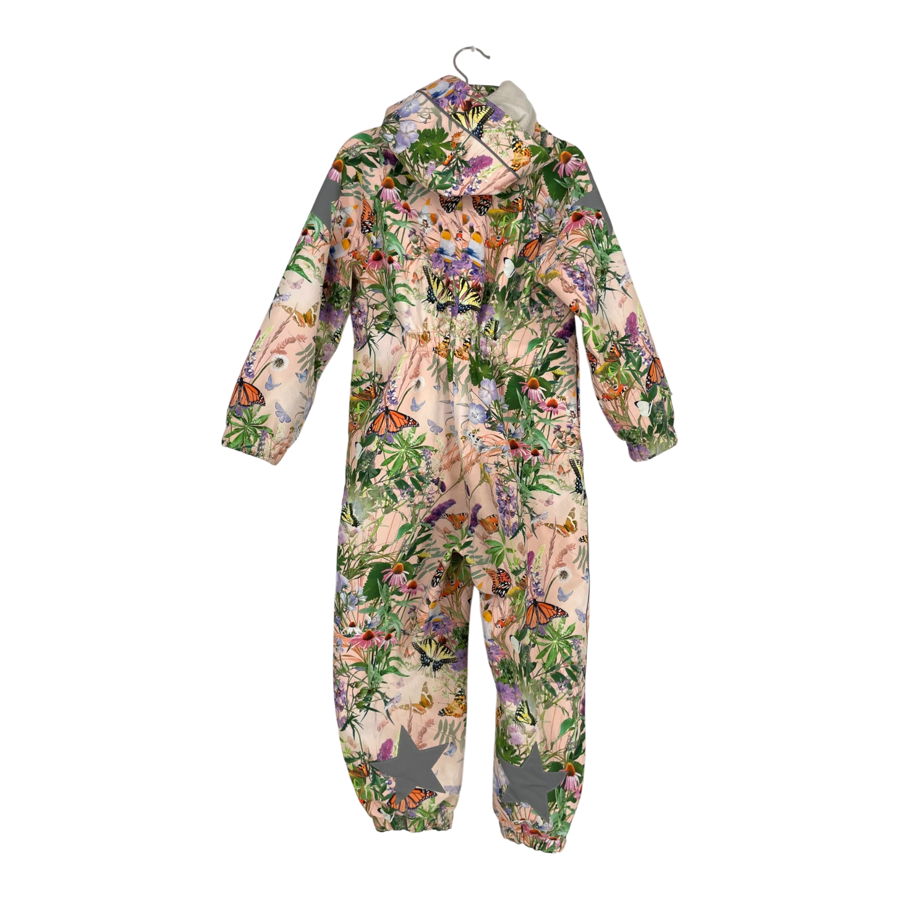 Molo polly mid-season overall. The overall has a zipper, buttons, a detachable hood, two front pockets and rubber loops which can be put under shoes. In this item the foot loops are missing. Star shaped reflectors at the back and on the side of the sleeves.