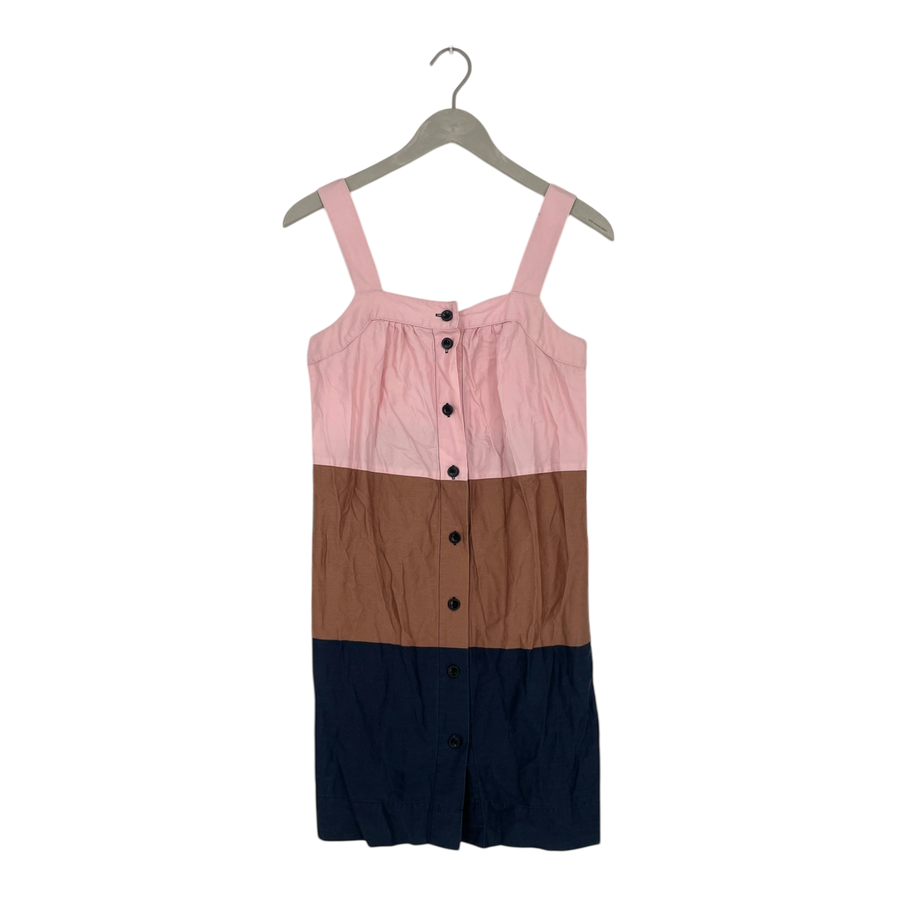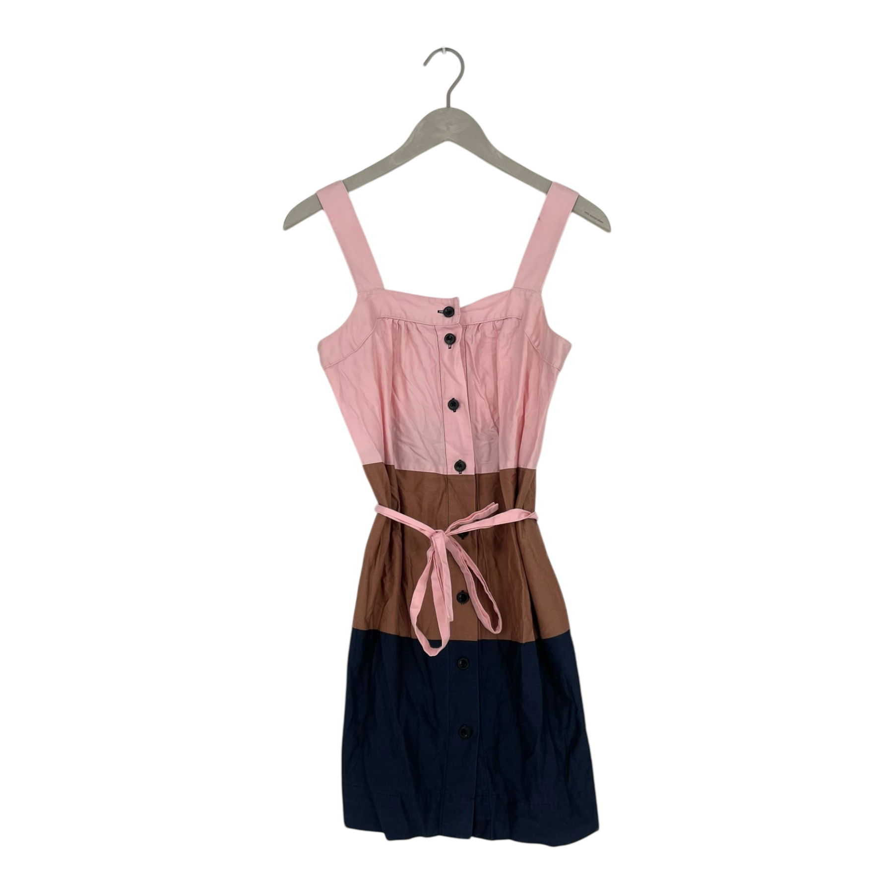 The Marimekko Raiku buttoned dress is a fresh and breezy mini dress with wide shoulder straps, elastic on the back for ease of dressing and pockets on the side seams. Removable fabric belt included. The fabric shows signs of wear and the dress is quite wrinkled. The colours have faded somewhat.