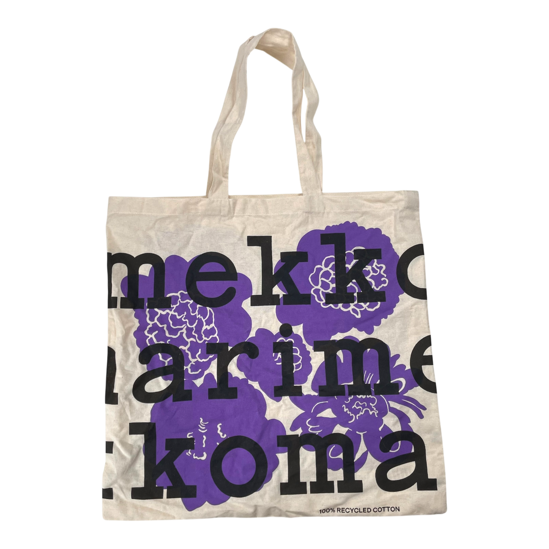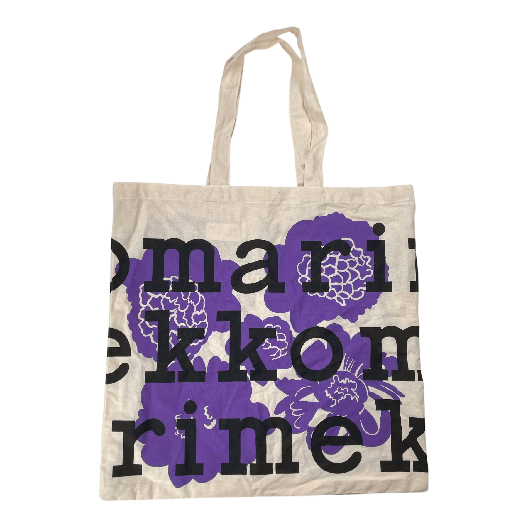 Marimekko tote shopping bag is made of lightweight cotton fabric, which features a logo pattern. The bag has two handles.