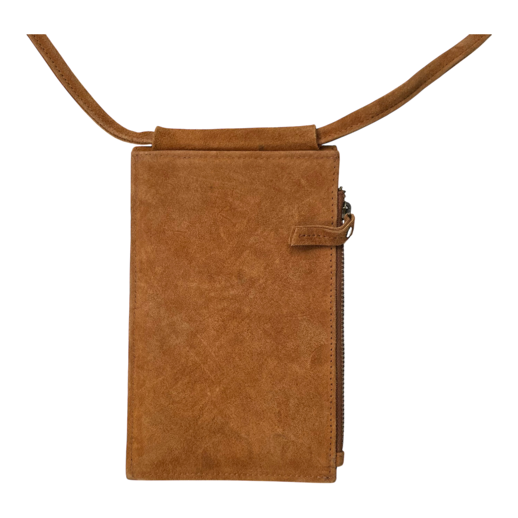 Holzrichter Berlin suede leather phone pocket with adjustable shoulder strap. The bag can be worn as a crossbody.