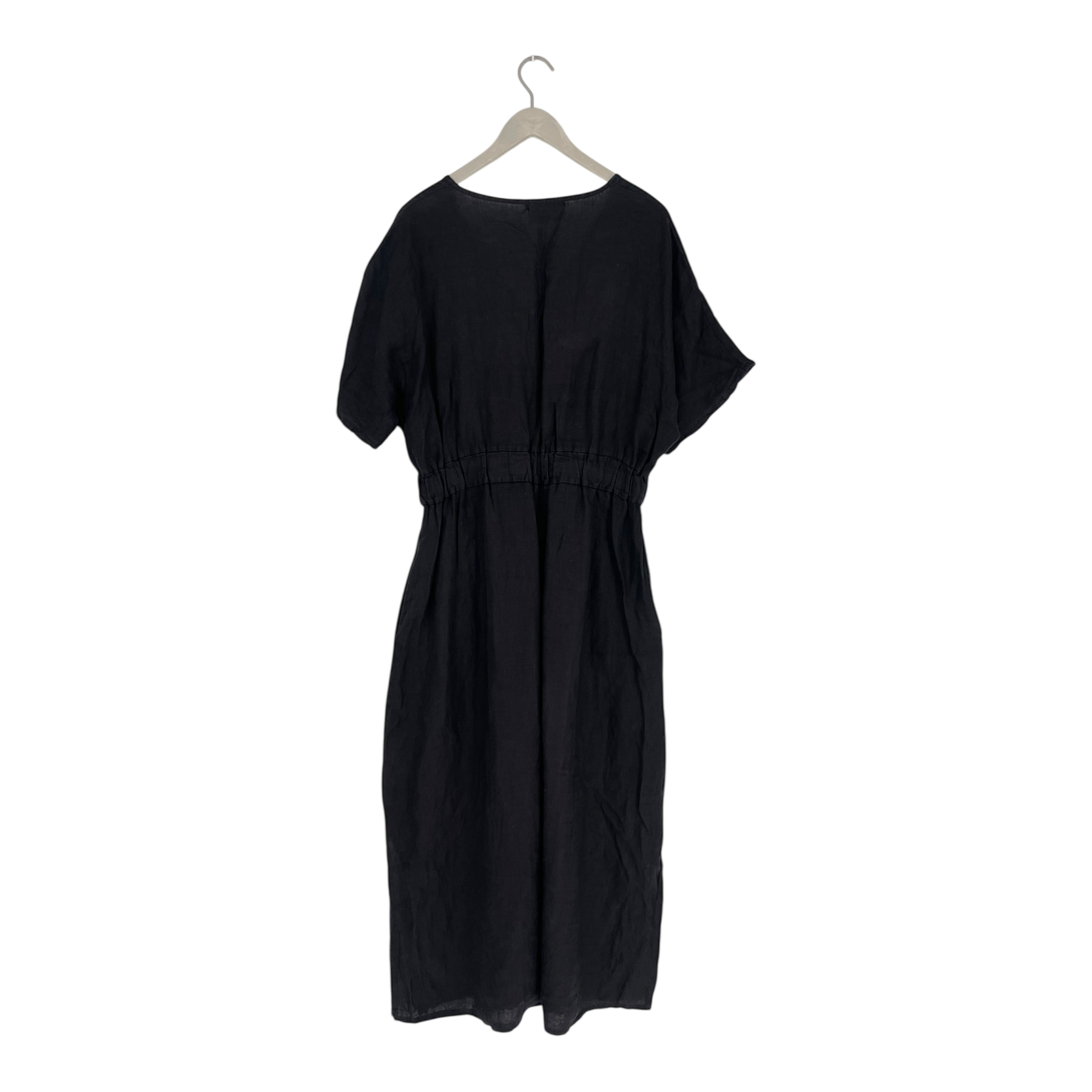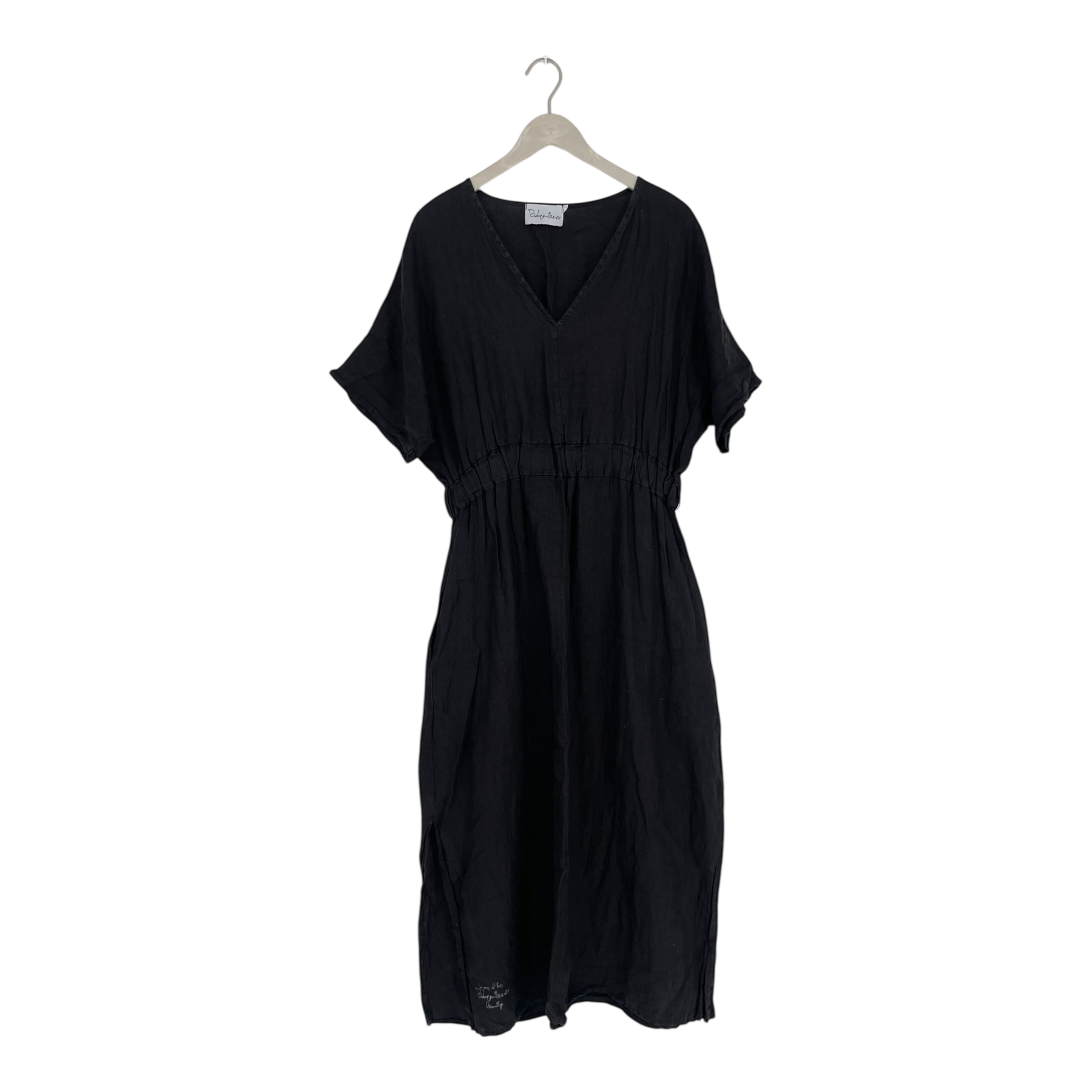 Bypias Bohemiana linen dress with a v-neckline, an elastic waistline and two pockets on the sides.