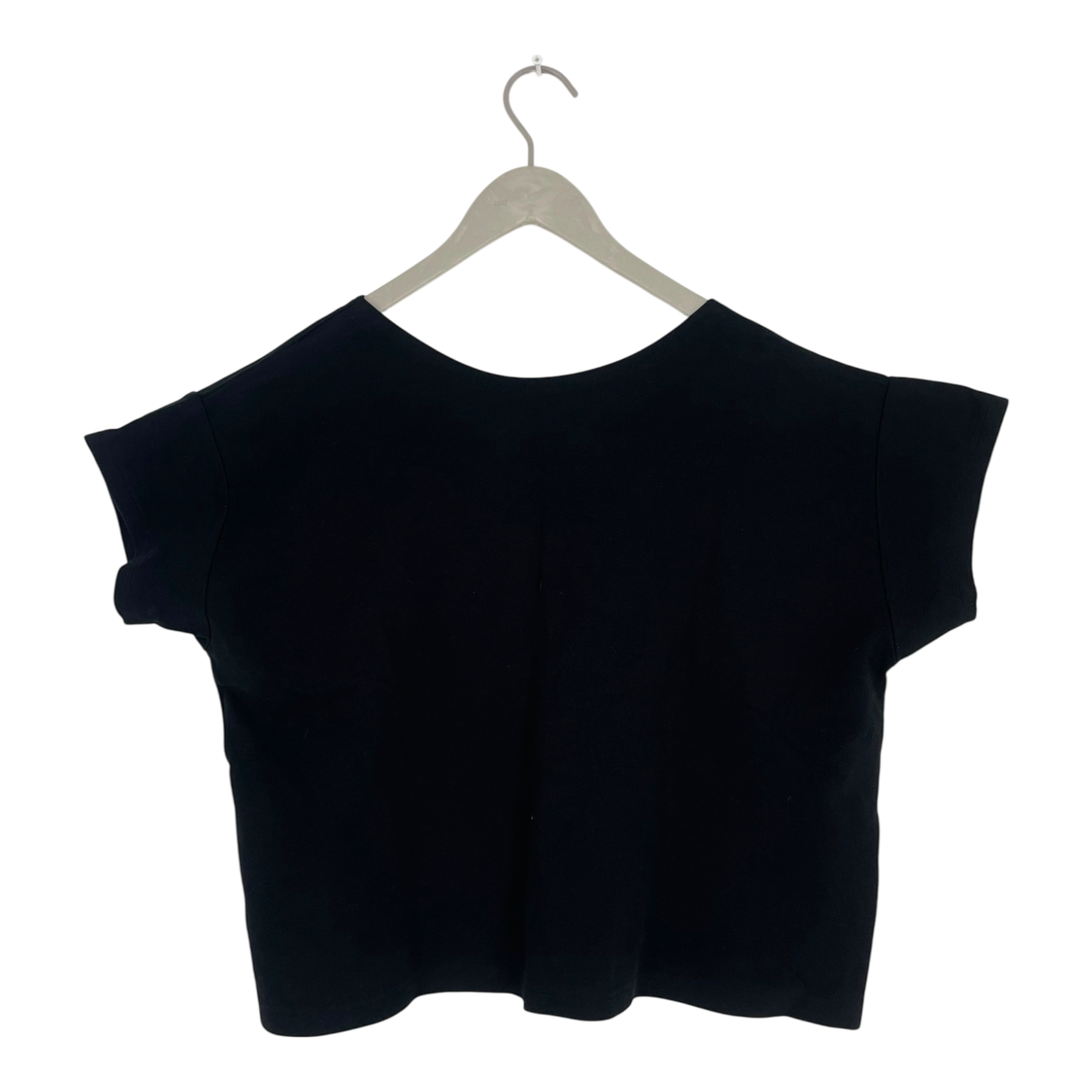 Aarre button top. This short-sleeved top features a v-neckline and a relaxed, boxy silhouette. The item can be worn in two ways: with the buttons on the front or in the back.