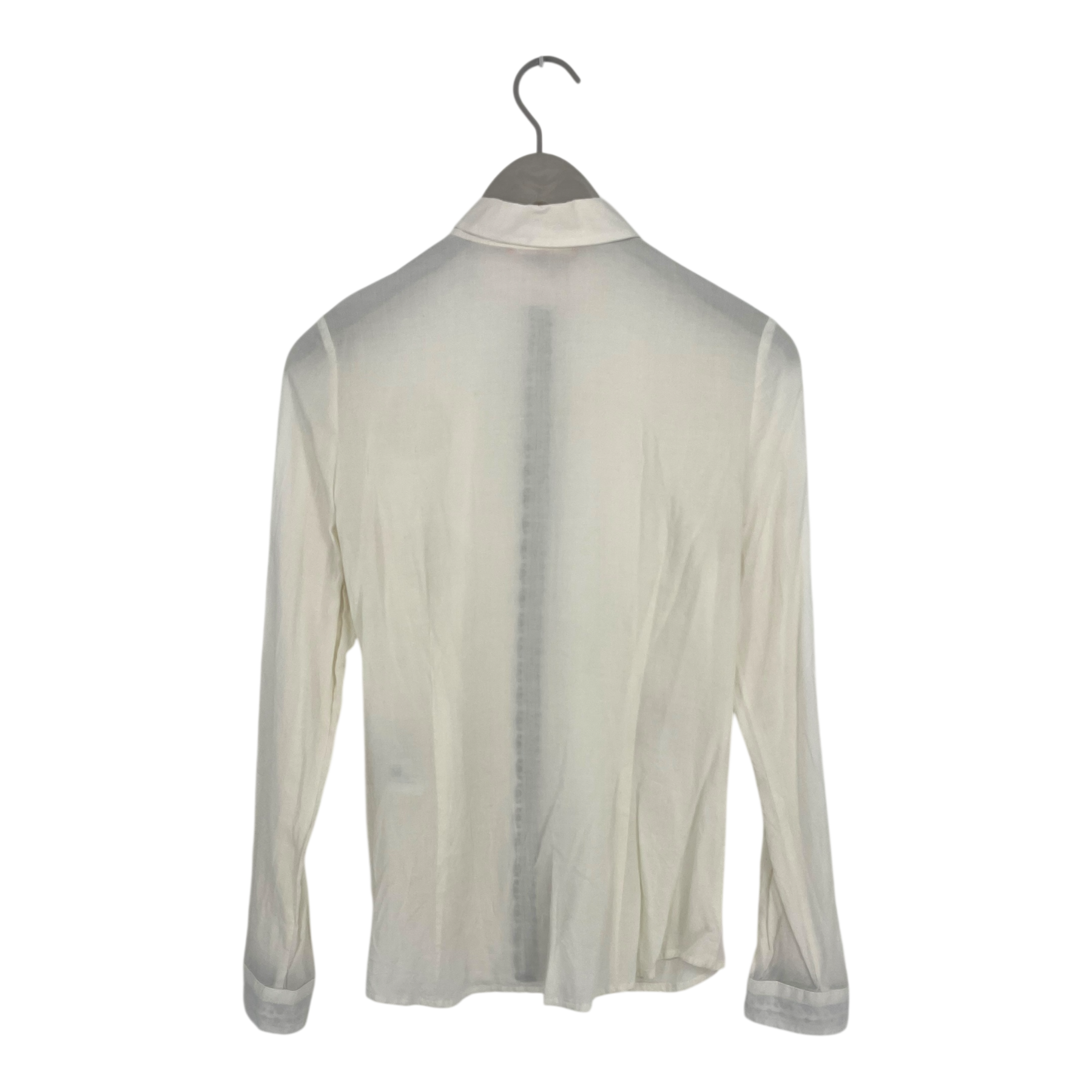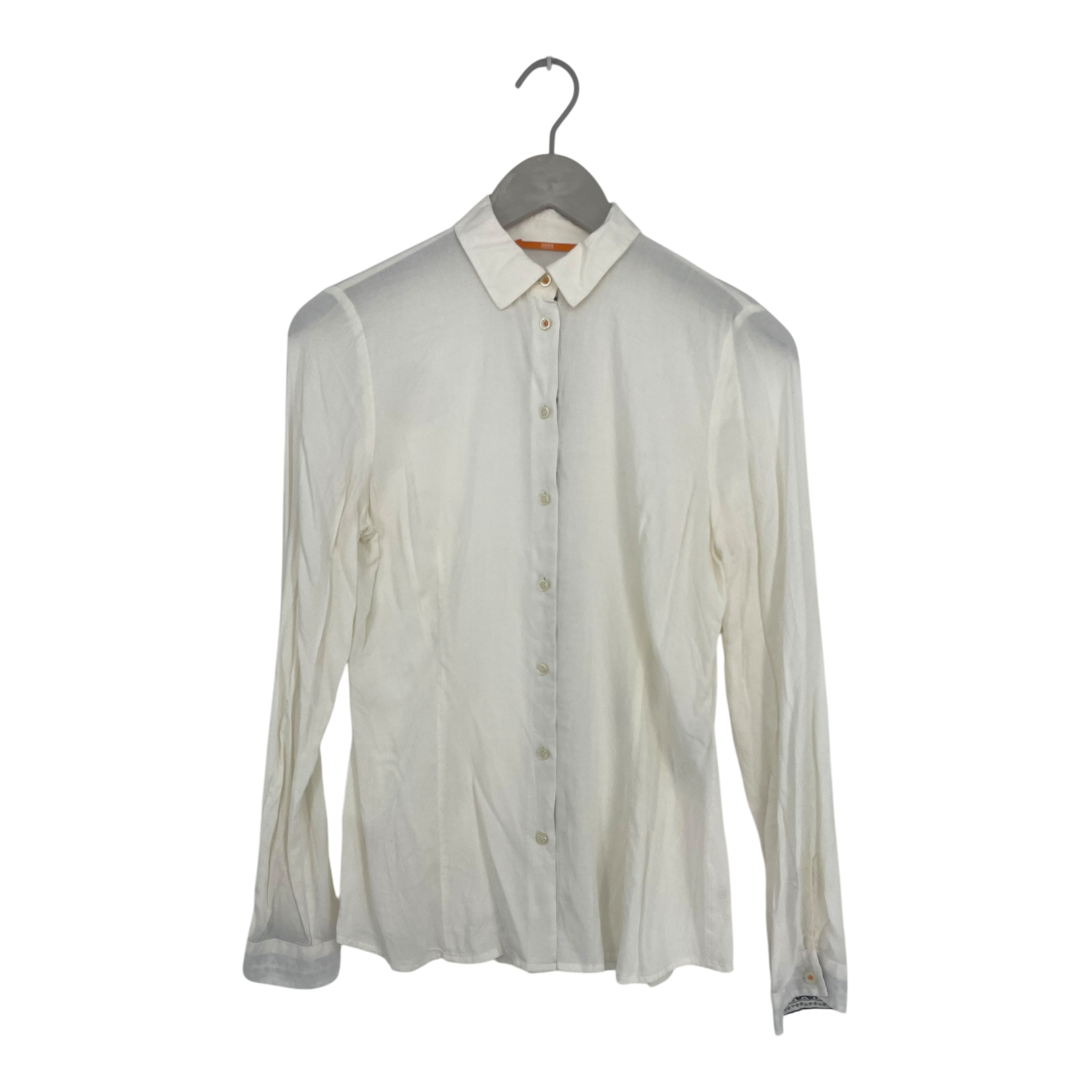 Hugo Boss women's shirt with front buttons and black details on the sleeves and button placket.