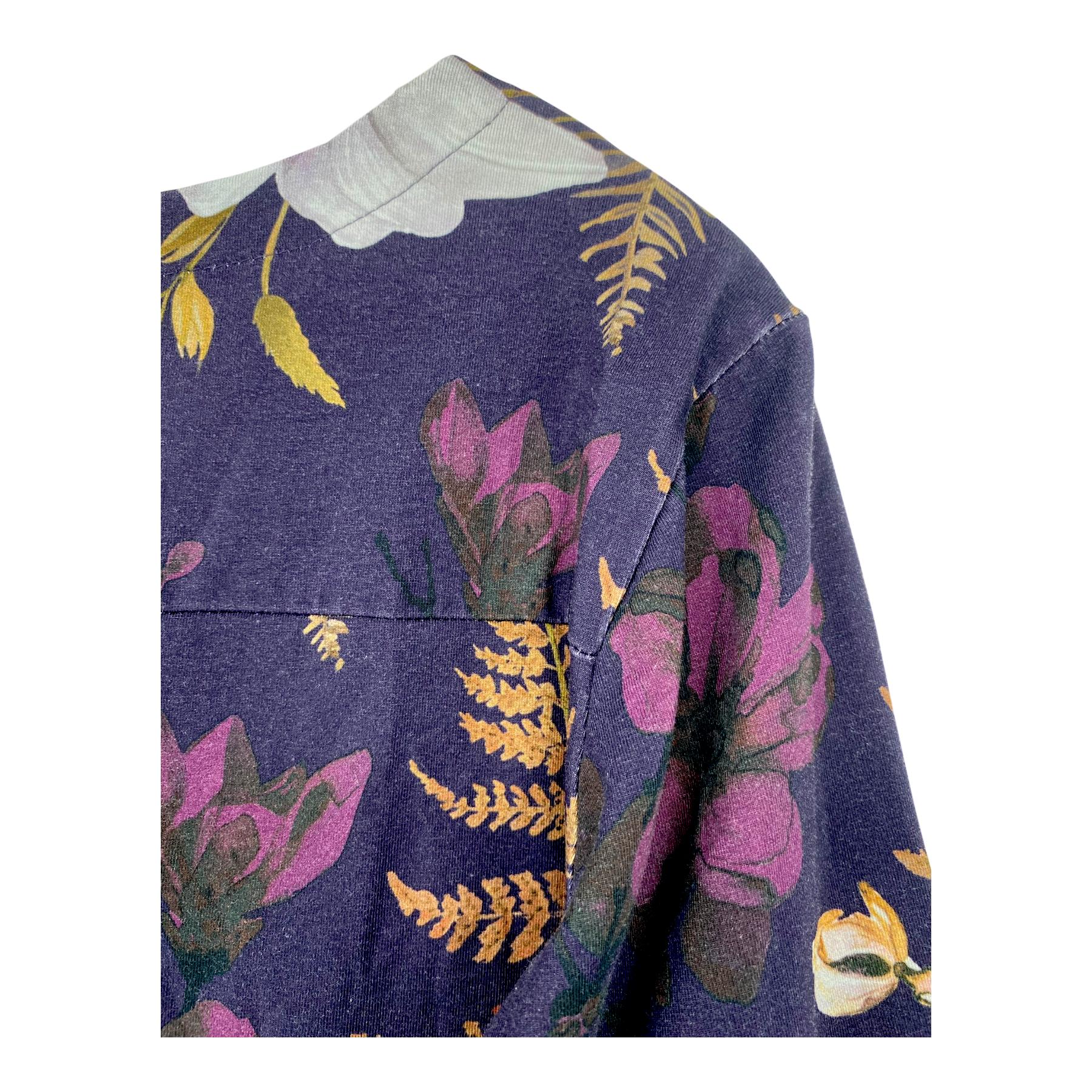 Nakoa Vera shirt in Secret lily print with 2/3 sleeves, V-neck, and slits on sides. The item is quite worn from the wash and shows signs of wear especially in the armpits.