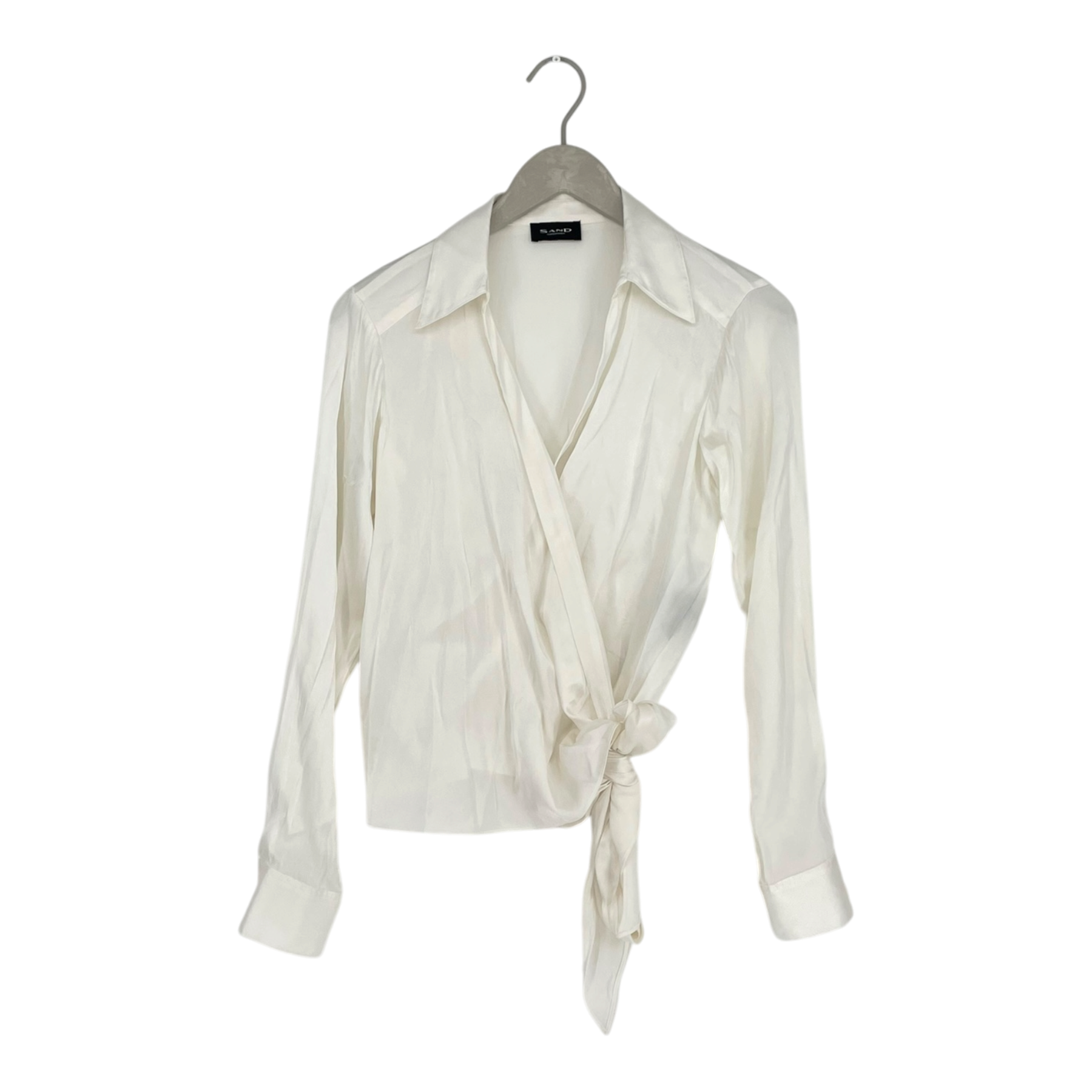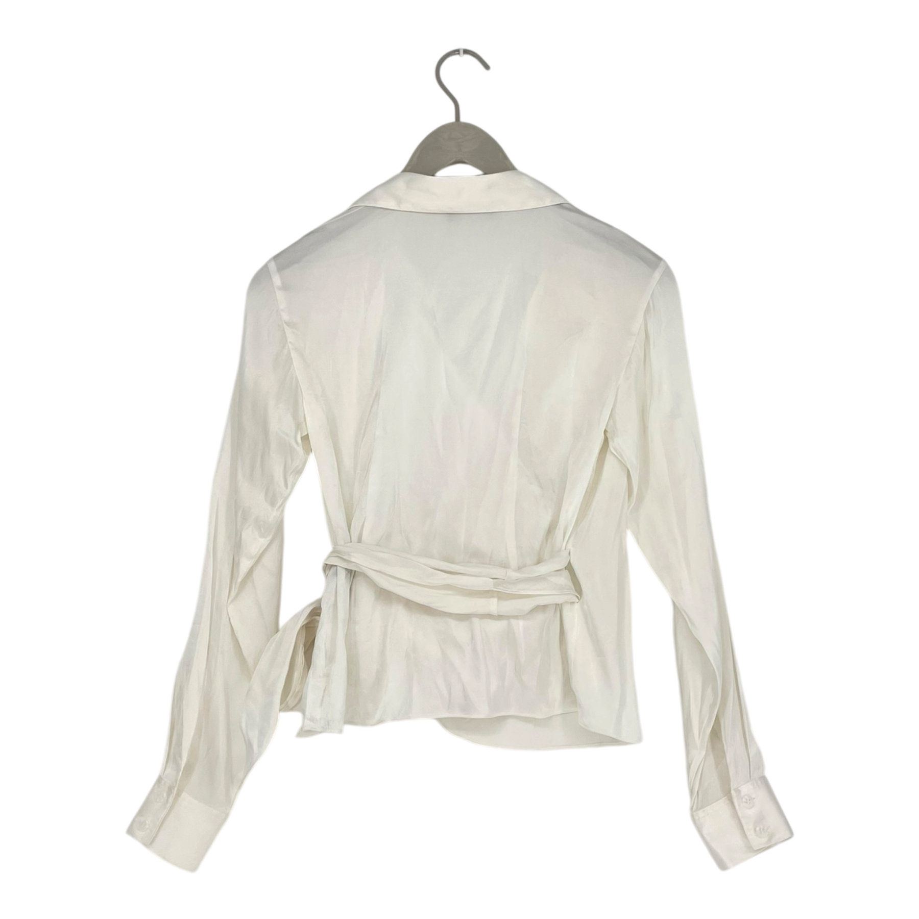 Sand wrap shirt. This long-sleeved shirt features a collared neckline and a wrap front design with a side tie closure.