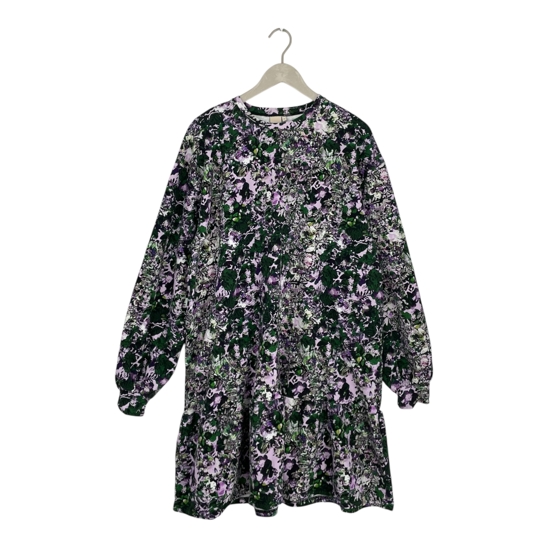 Kaiko Ruffle sweatshirt dress in flower print. The jersey dress has oversize fit, a dropped shoulder, long sleeves, and playful frill in the hem.