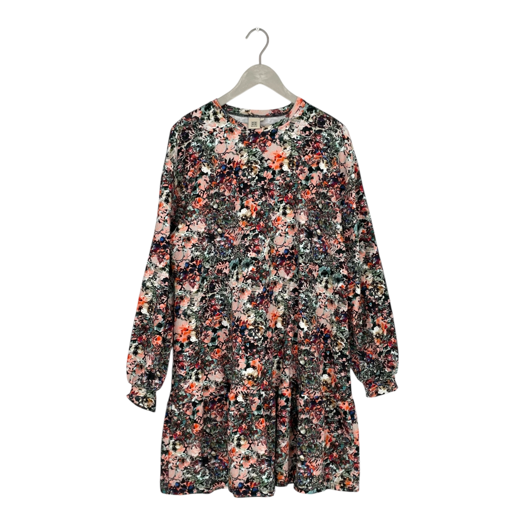 Kaiko Ruffle sweatshirt dress in flower print. The jersey dress has oversize fit, a dropped shoulder, long sleeves, and playful frill in the hem.