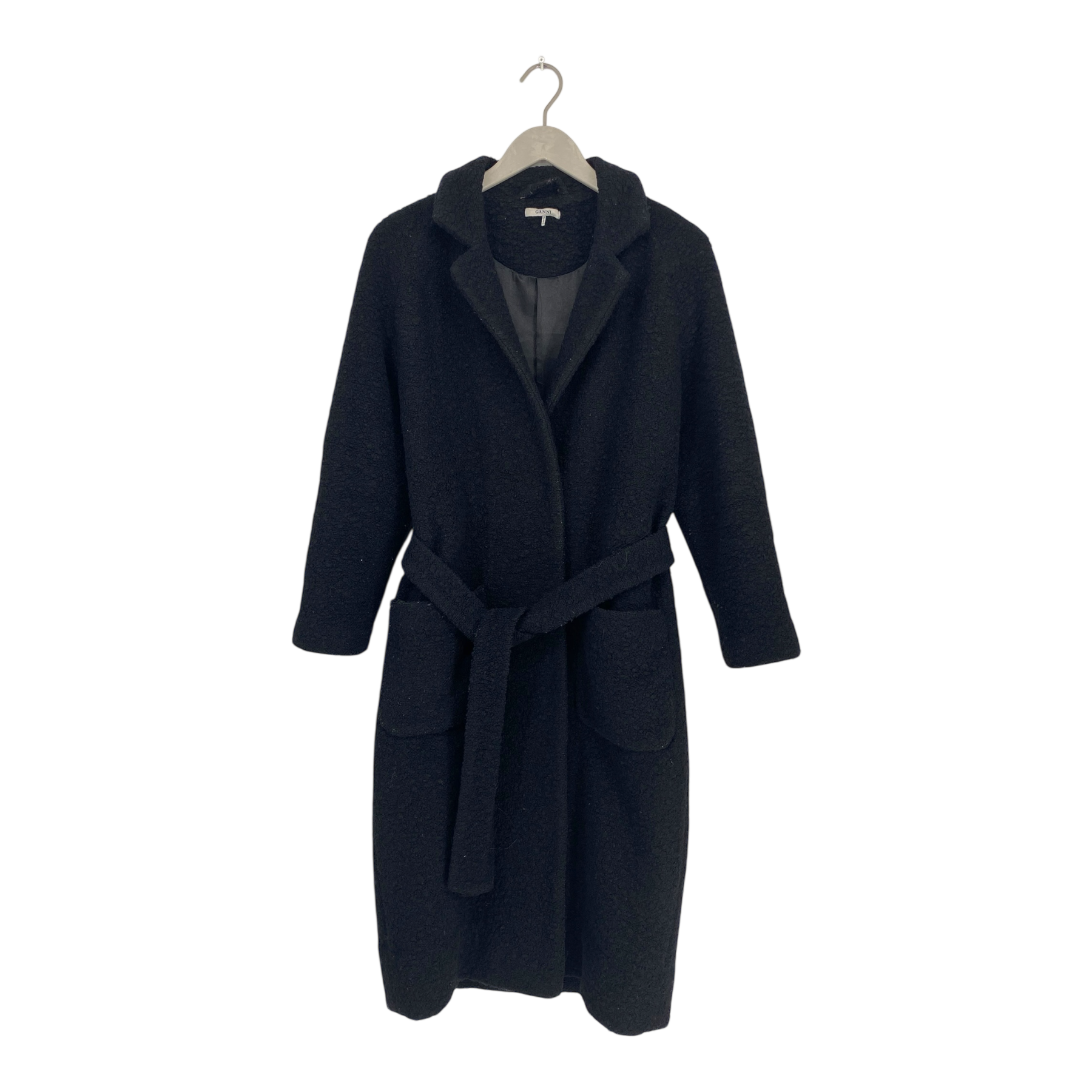 Ganni women's mid-length wool coat with buttons, belt, and open pockets.