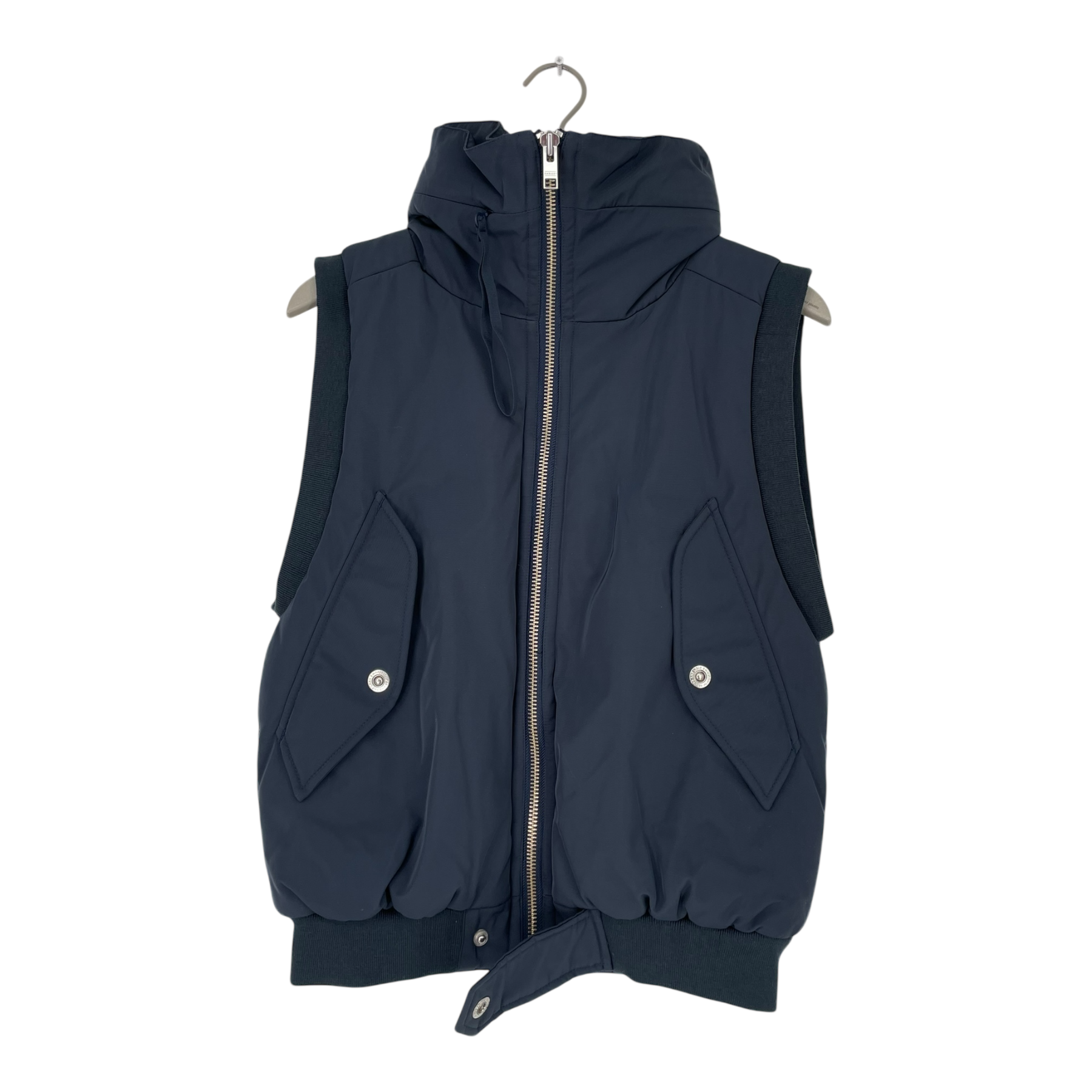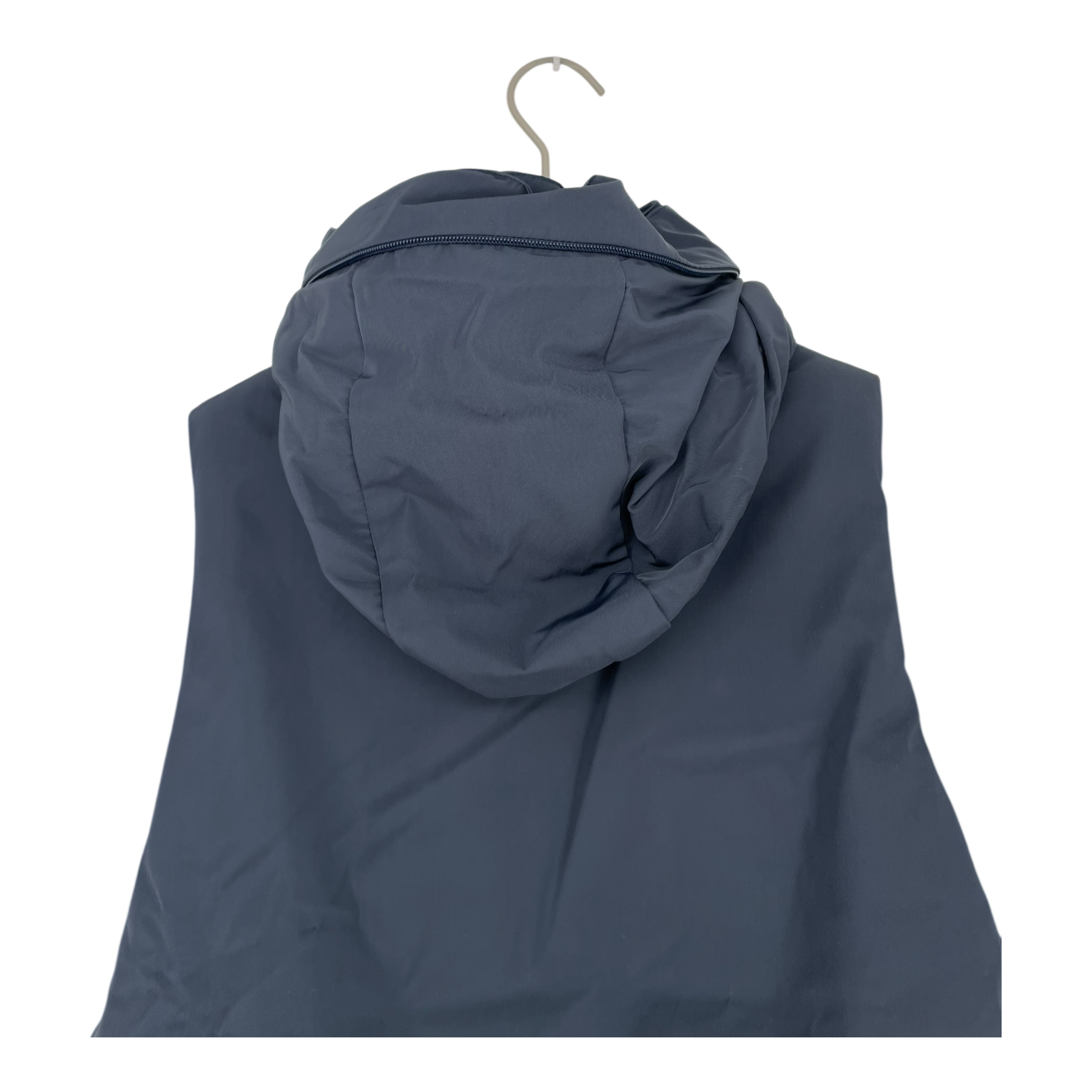 Embassy of Bricks and Logs Bordeaux bomber style vest with a hood that can be hidden, large pockets on the sides, a two way zipper and a smooth satin lining.