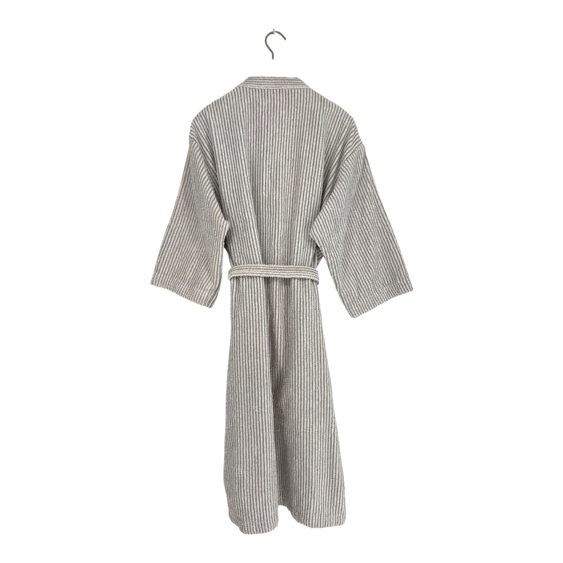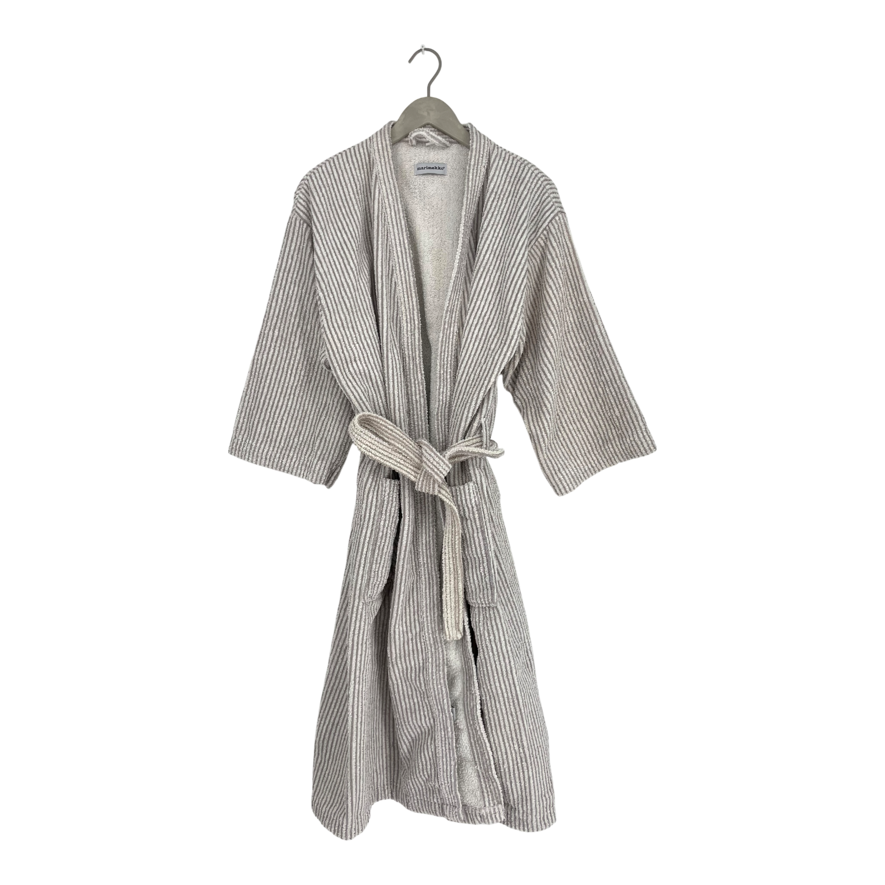 Marimekko ilta bathrobe with a removable belt. The sleeves are loose and dropped from the shoulders. The fabric shows signs of wear and there are some pulls of thread on the seams.