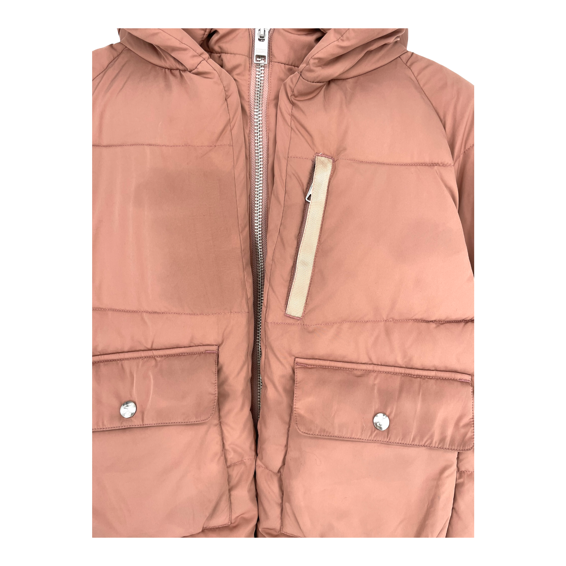 This jacket has a few stains on the front. They are much less noticeable in natural daylight than under the studio lighting used for the photos.