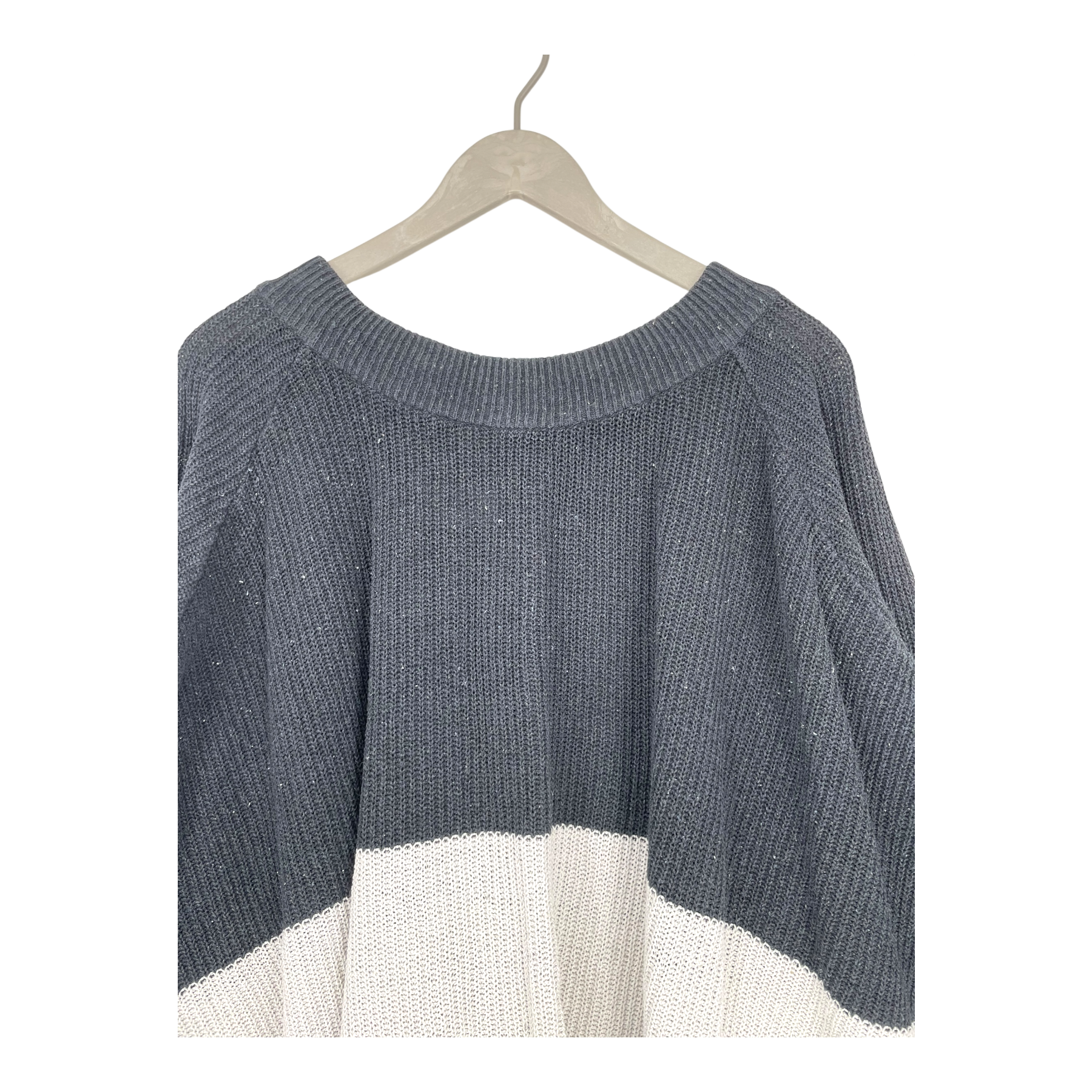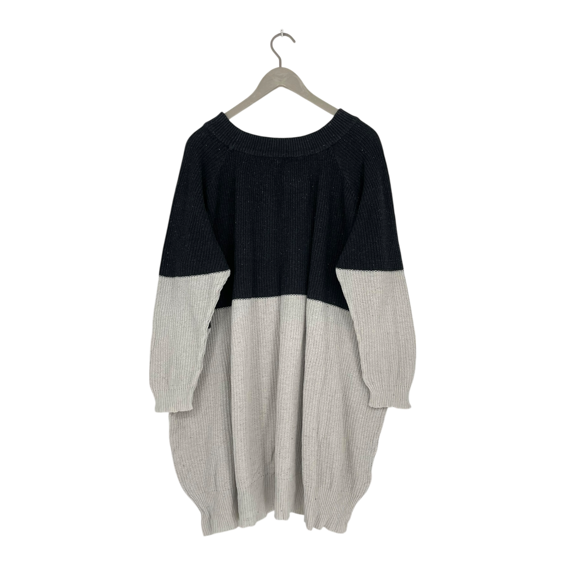 Papu women's knitted dress in black and white. The item is made from recycled cotton which makes the color and surface uneven. This item shows signs of wear on the surface, especially in the wash label and collar and it is hardened from the wash.