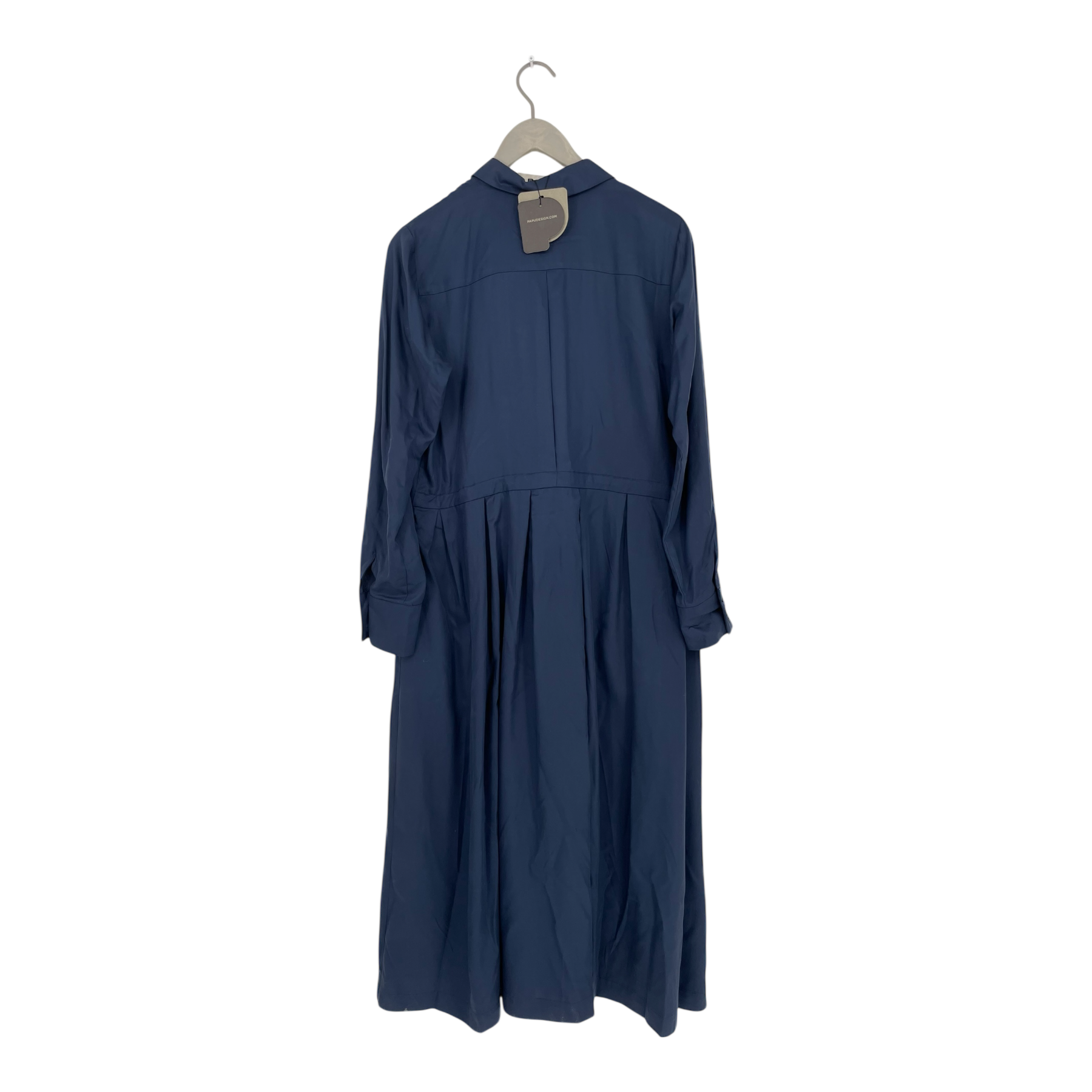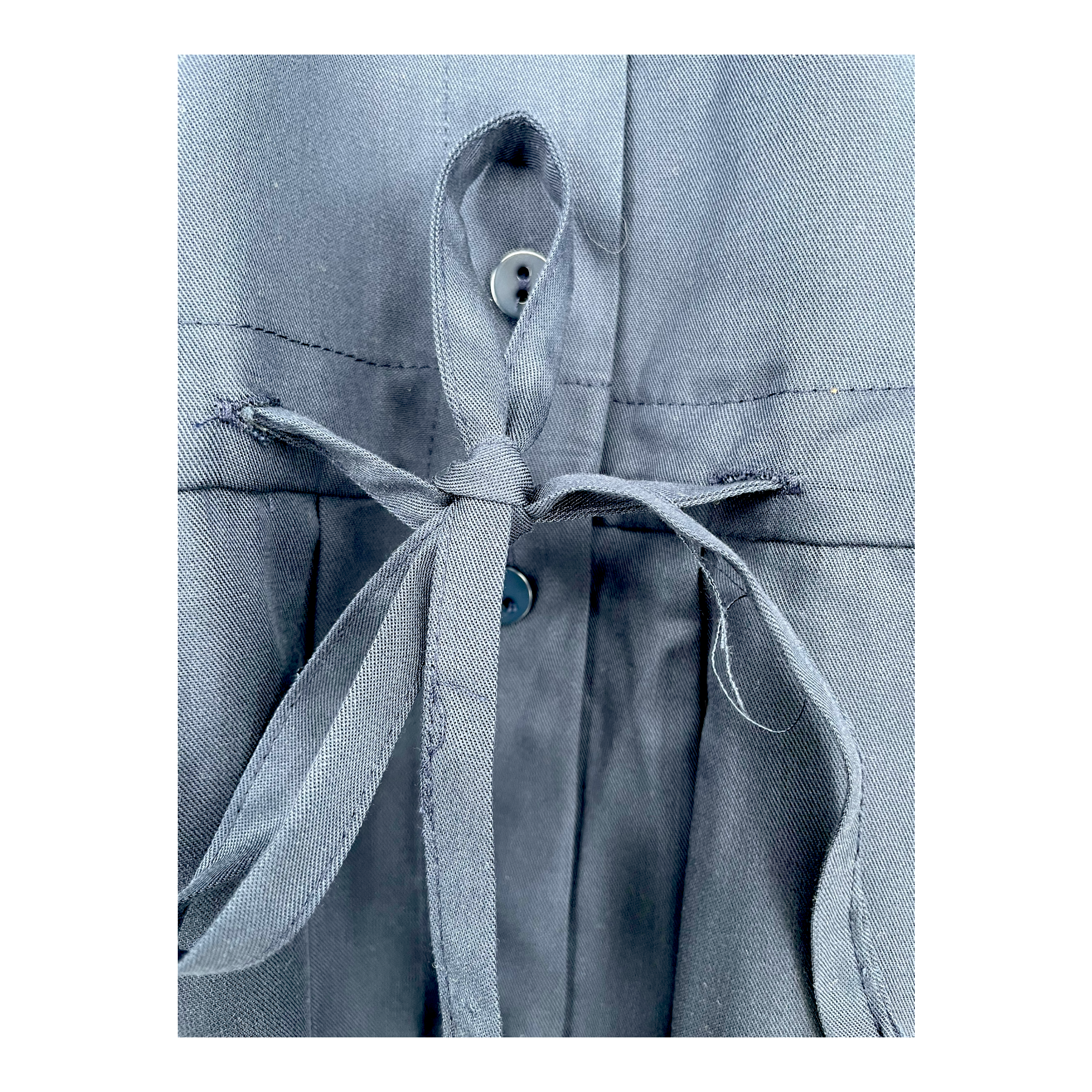Papu Swing dress in dark blue. The Swing dress has buttons down the front, long sleeves and drawstring closure on the waist. There are some threads loose on the ends of the drawstrings, but the item is otherwise good as new.