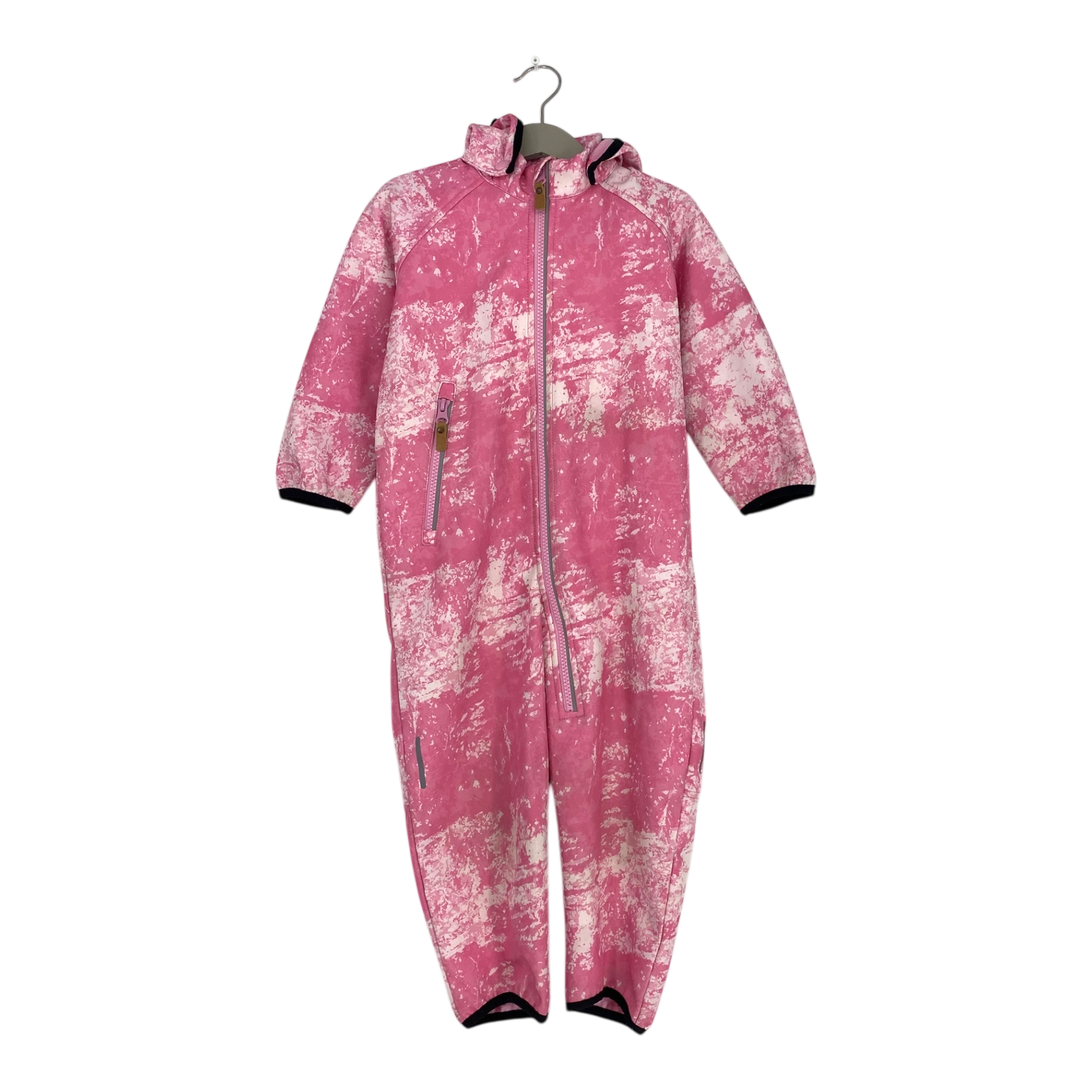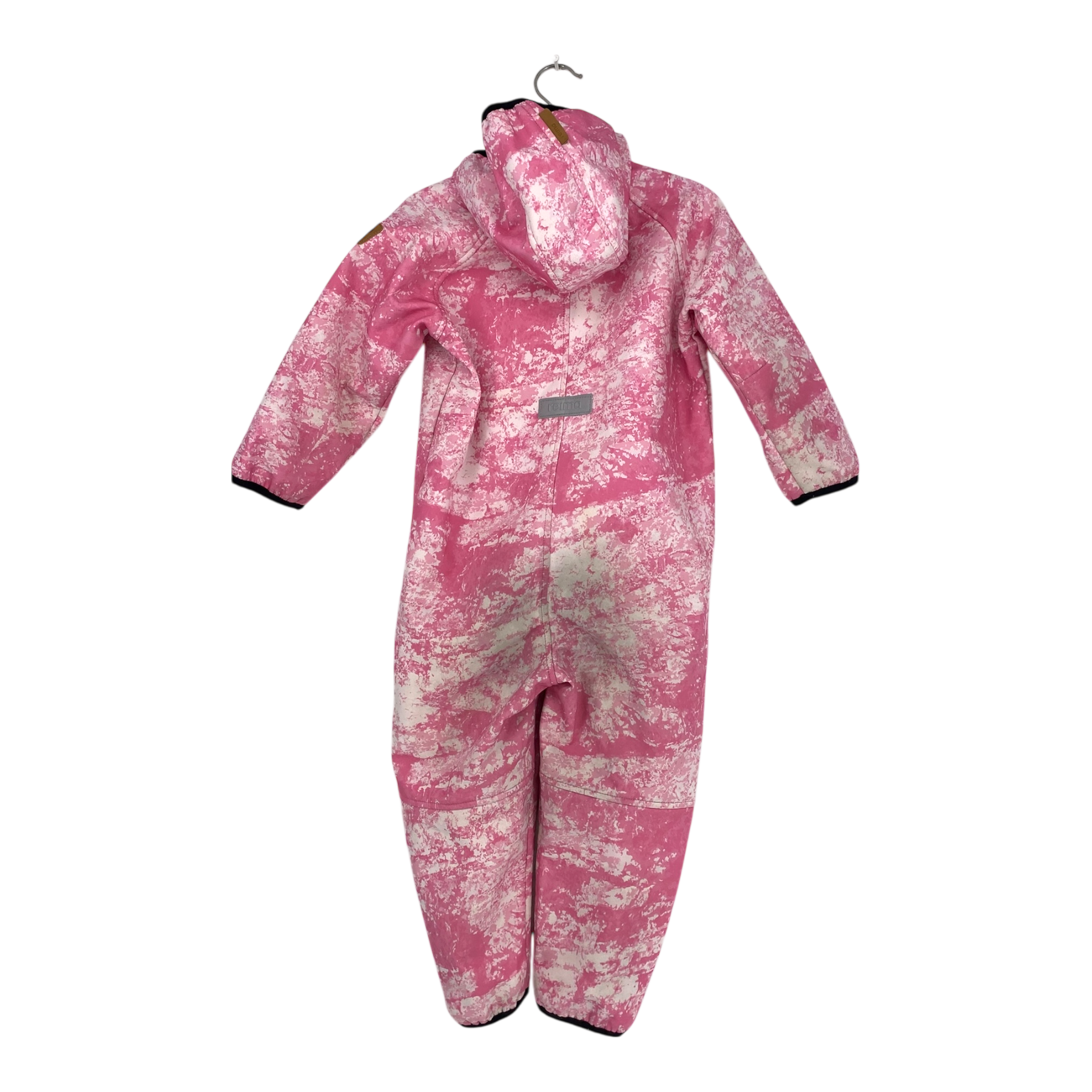 Reima Kotilo softshell midseason overall with durable reinforcements and fleece on reverse. Originally the surface has been treated with water-repellent finish. Elastic cuffs at wrists and leg ends together with the detachable hood, a zipper pocket and zipper fastening in the front.