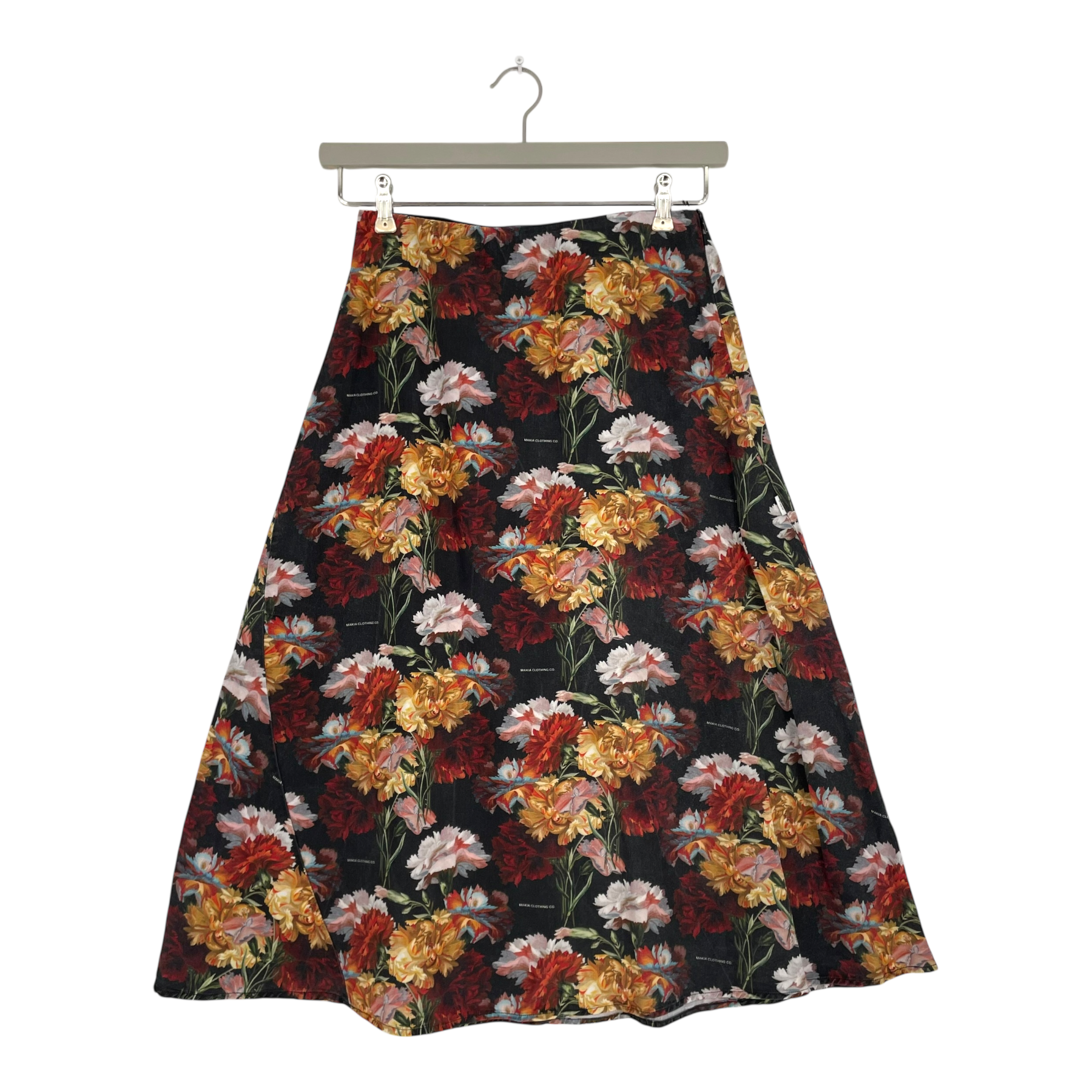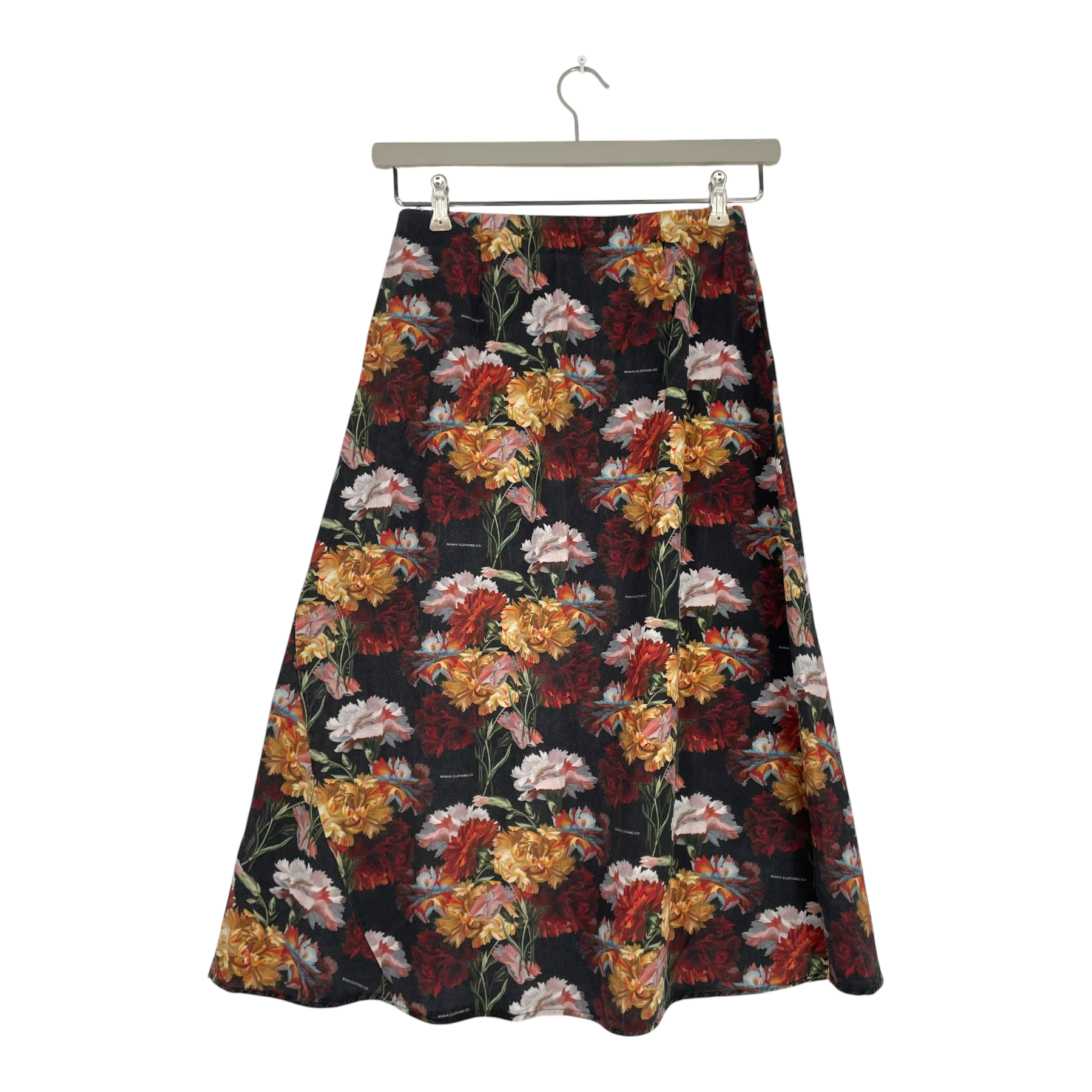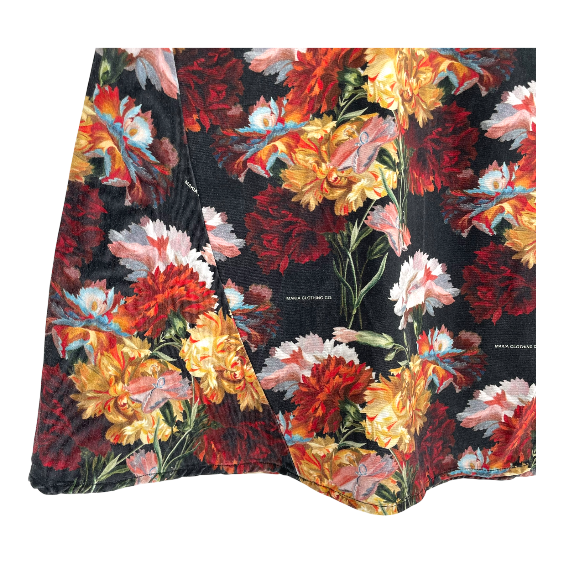 Makia Wave skirt has a fit-and-fluted silhouette with a curved side seam. Hidden zipper on side and hidden elastic band on waist. Unlined.