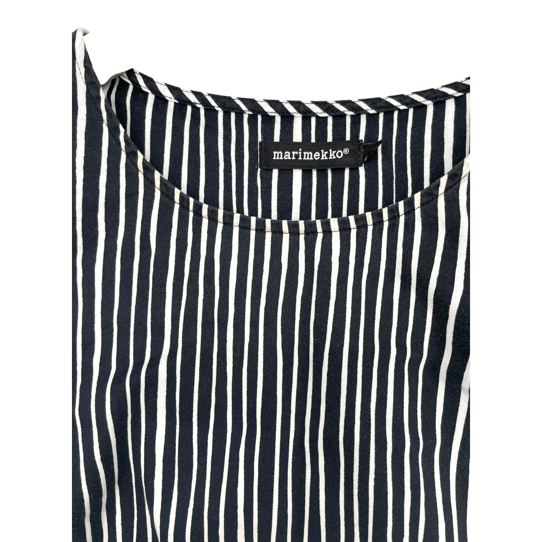 Marimekko Plyymi top. The top has some staining on the neckline as well as wear on the surface of the fabric.