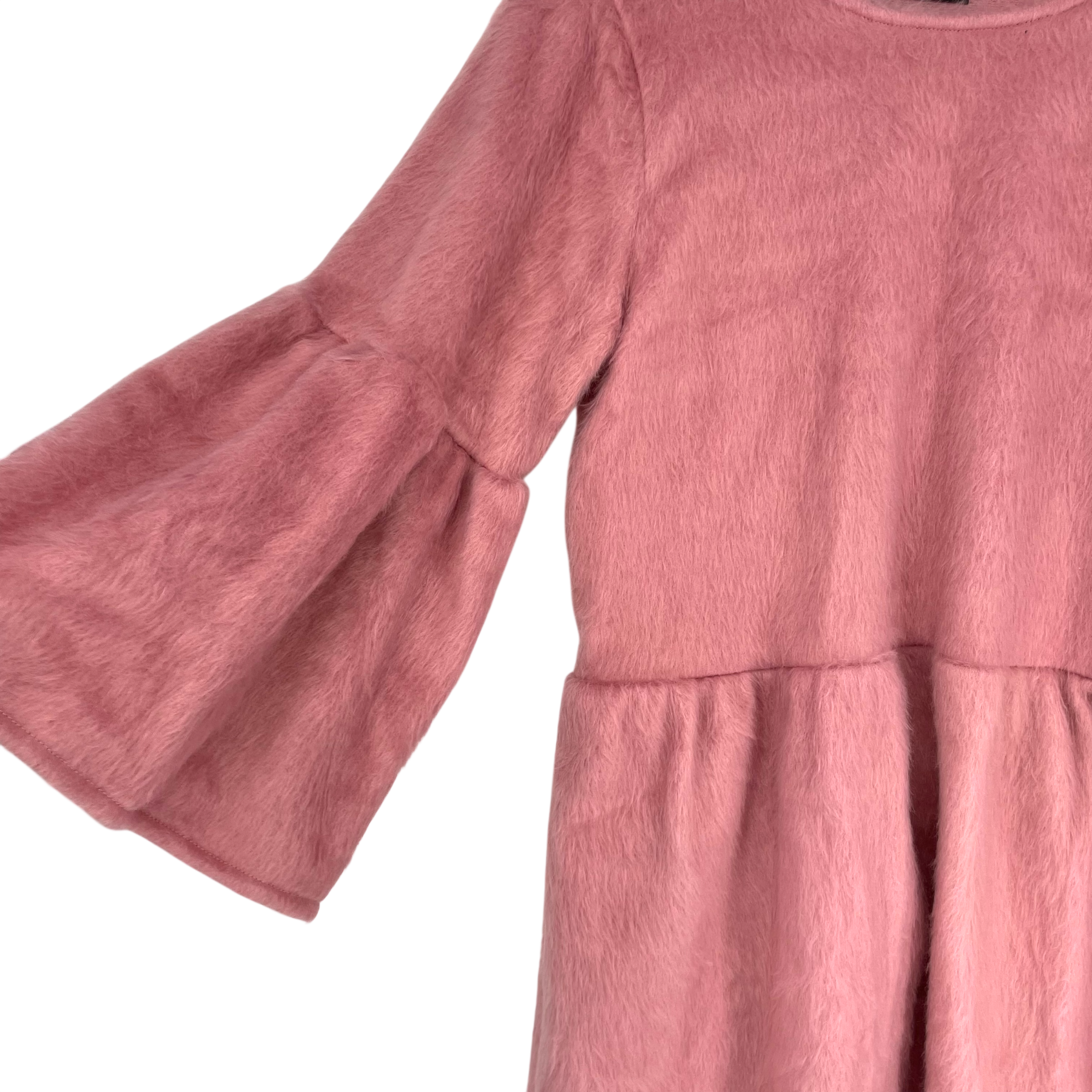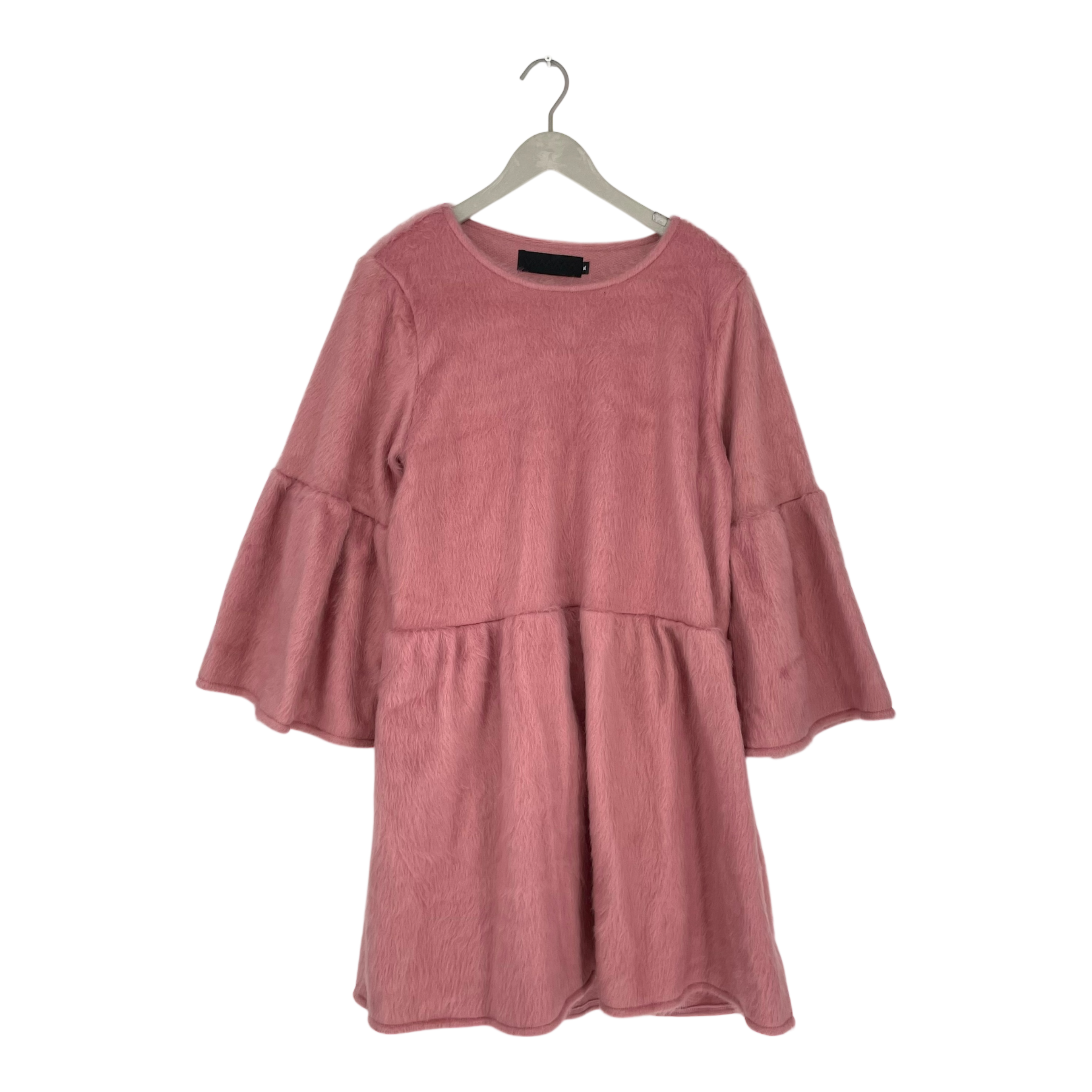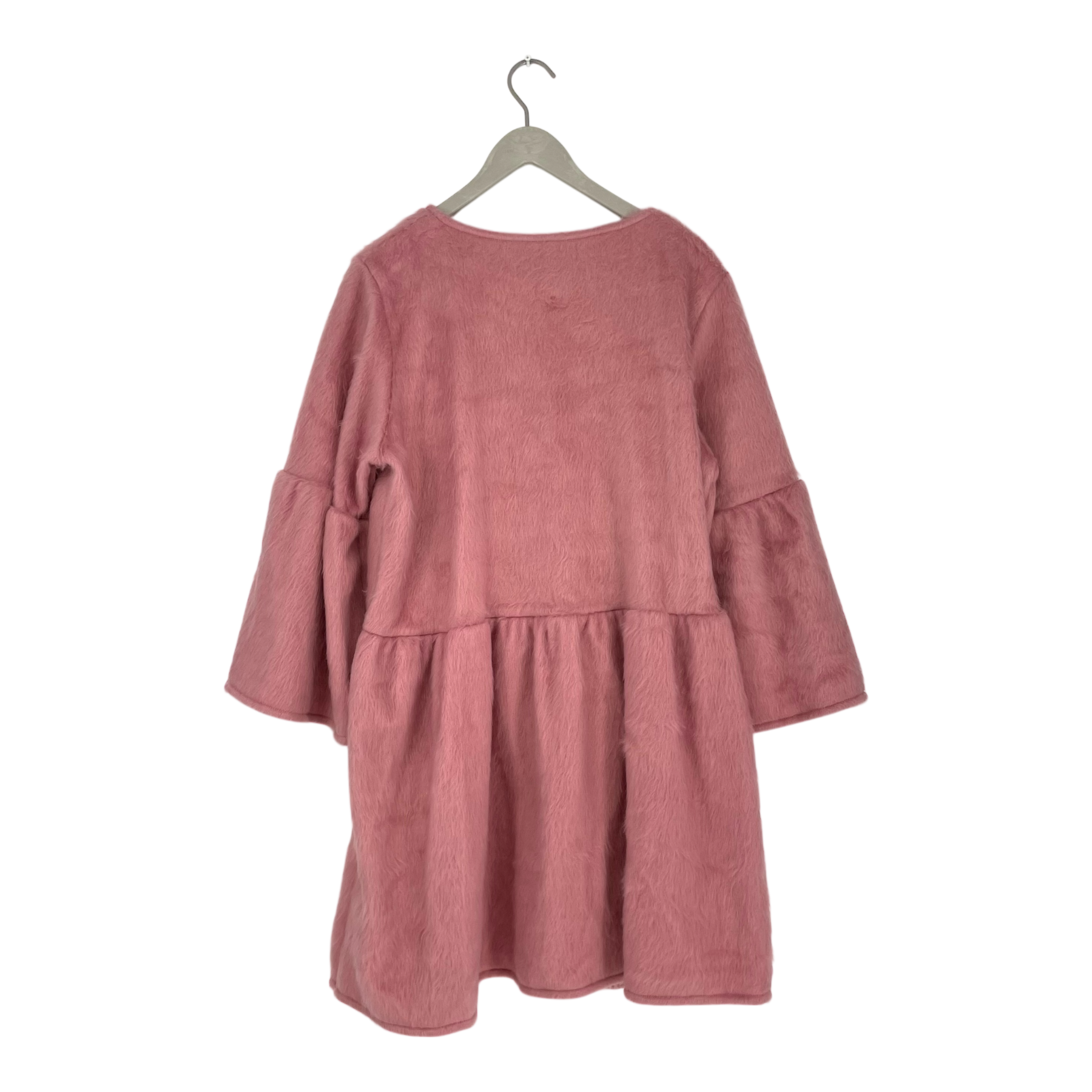 Vimma Kukka dress in a pink, fuzzy textured material. The dress features a round neckline, a dropped waistline, and flared bell sleeves.
