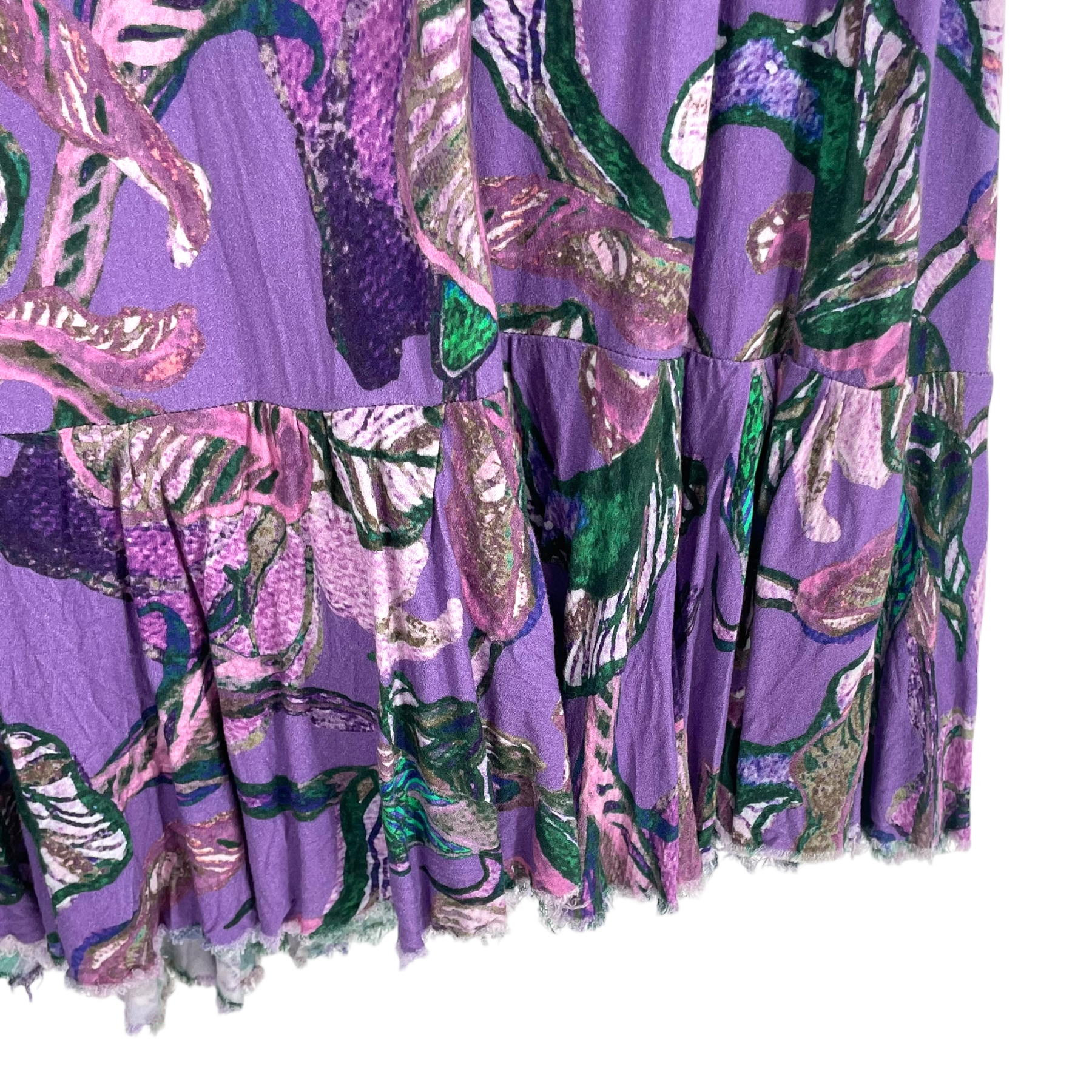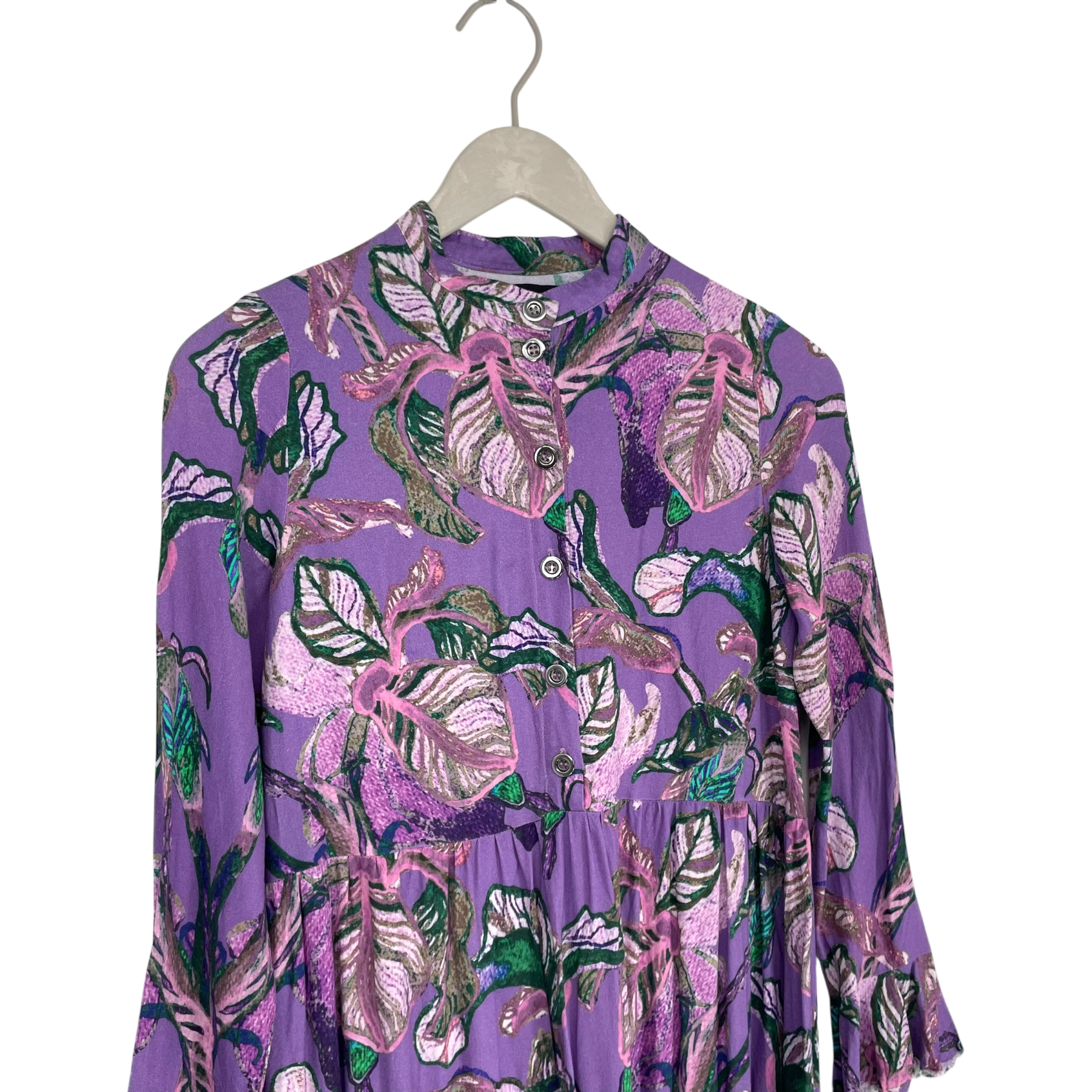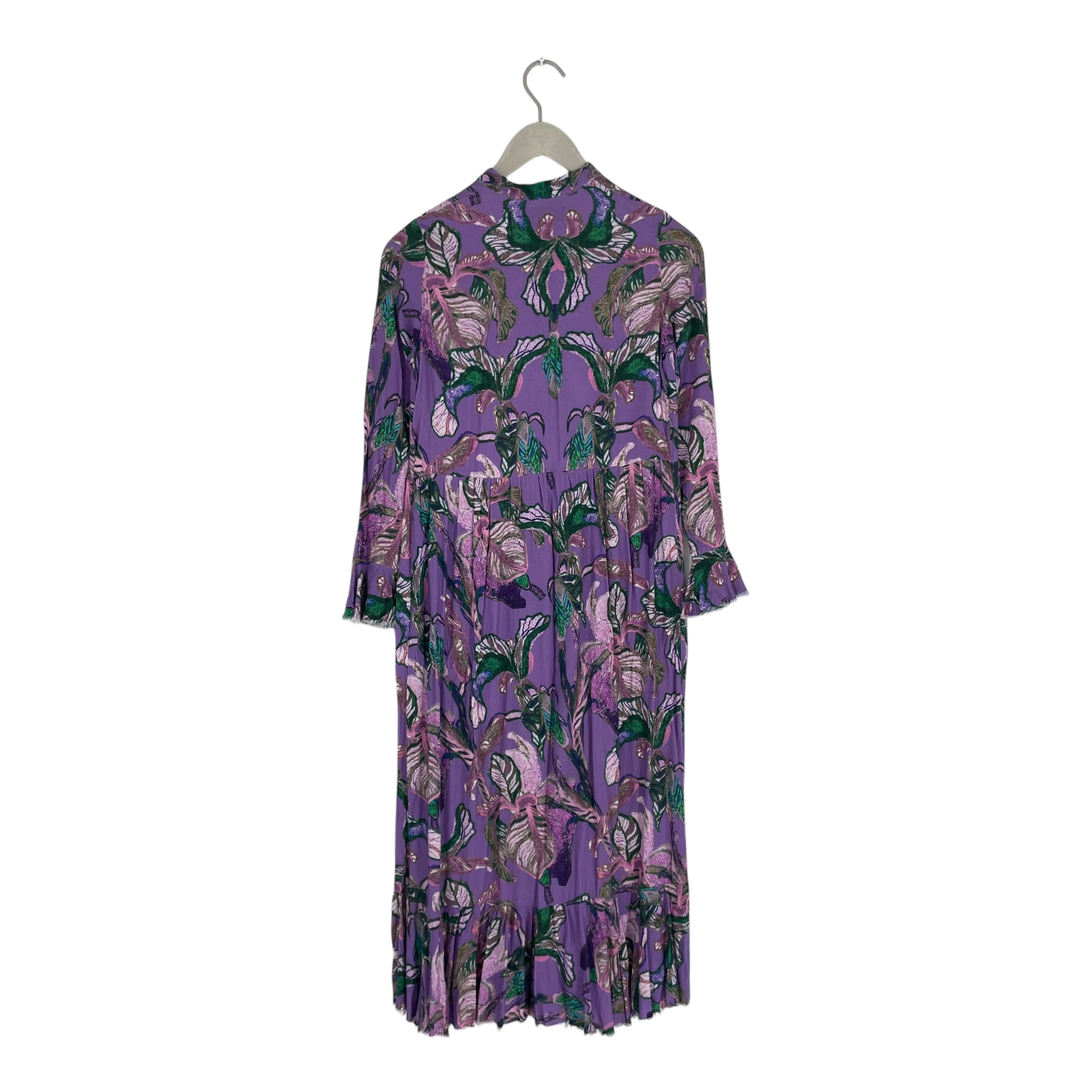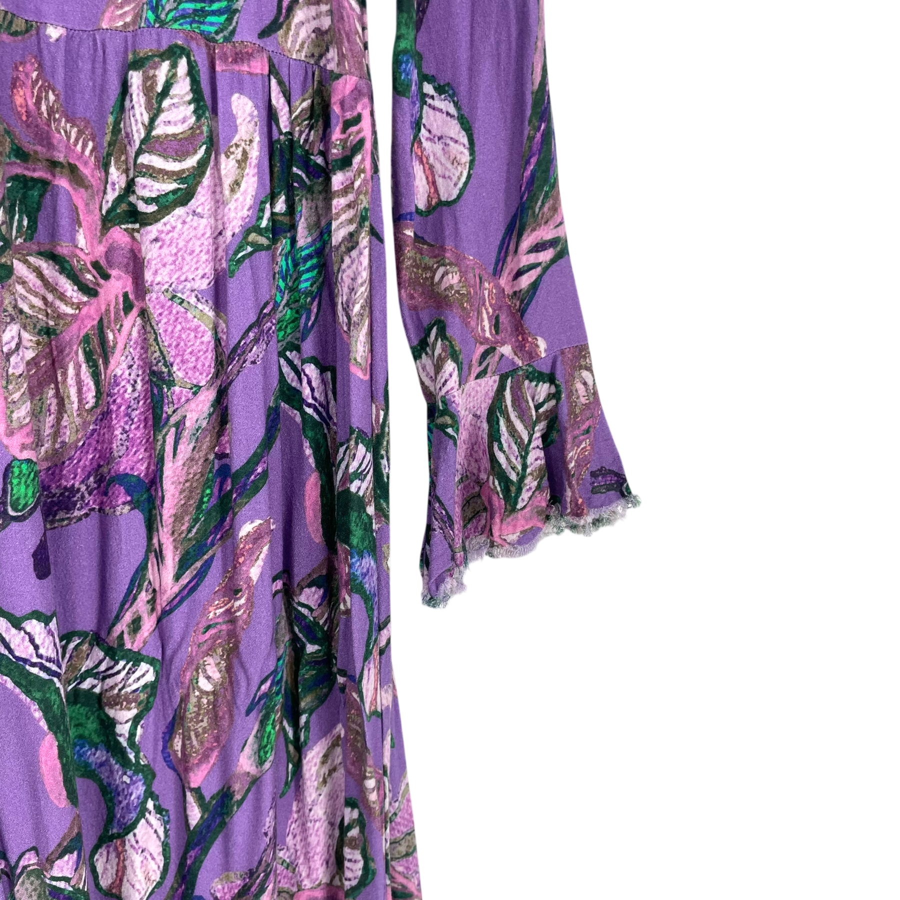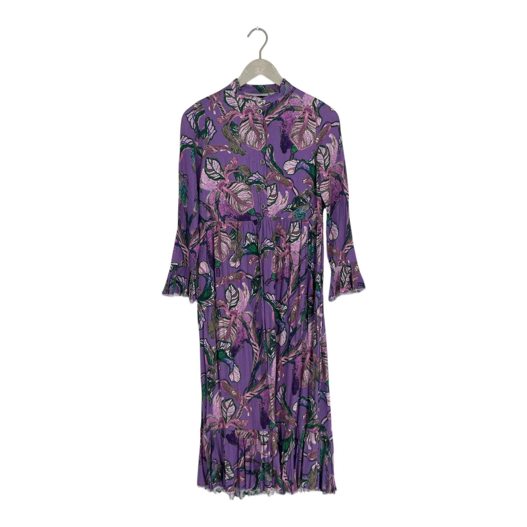 Vimma long woven Tuuva dress. This midi dress features a purple base with a multi-colored leaf print. It is designed with a high collar, a button-front bodice, long sleeves with flared cuffs, and a tiered hem. The fabric has frayed ends on purpose on the cuffs and on the hemline.