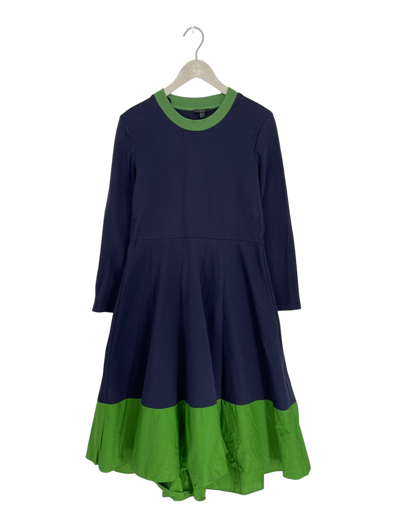 COS long-sleeved jersey dress with woven hem. The dress has round neck and A-lined bottom part.
