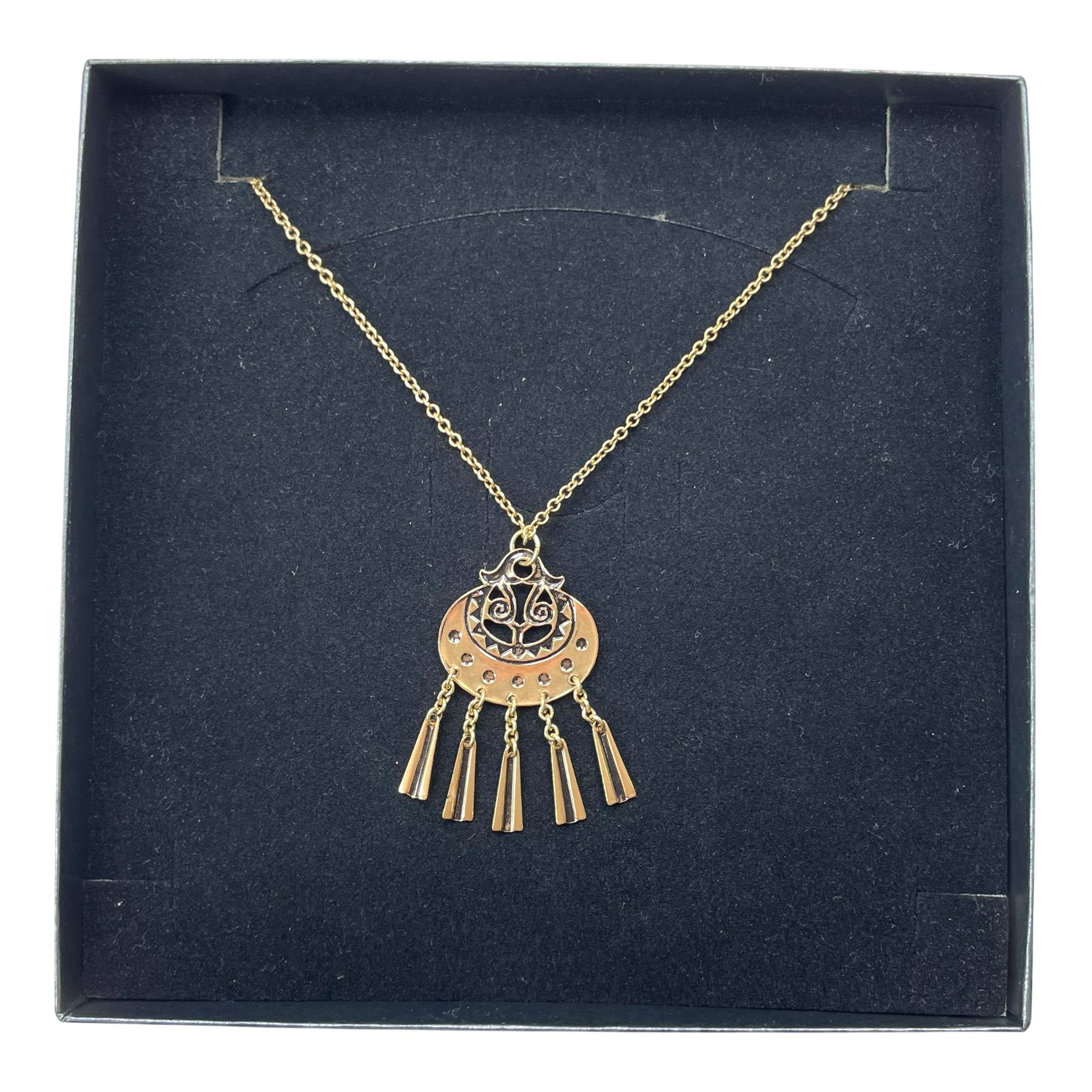 Kalevala Koru Kuutar pendant small, Moon goddess, necklace. The spiral motifs on this bronze pendant symbolize the circle of life, and the little tinkling charms cast out evil spirits. Anchor chain.