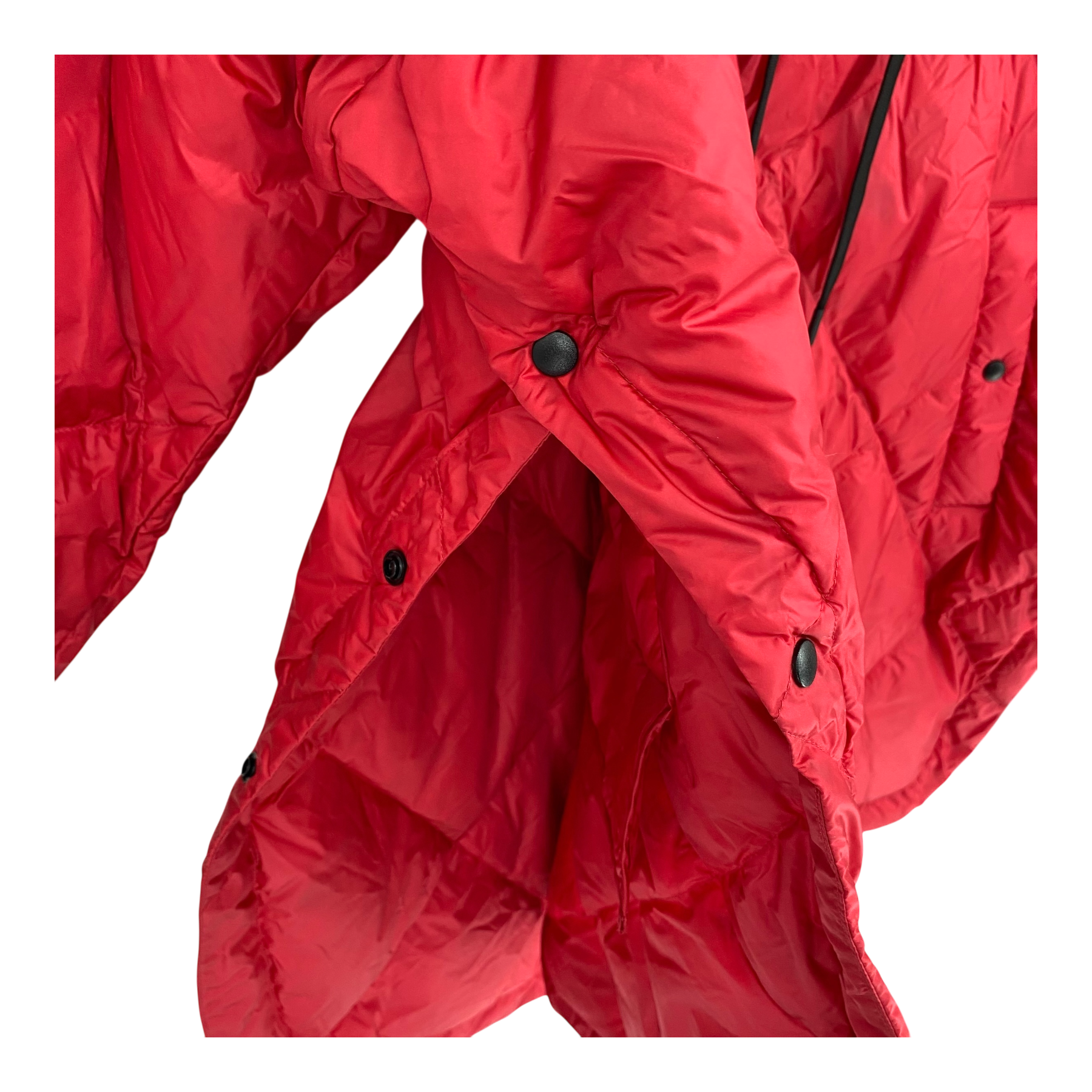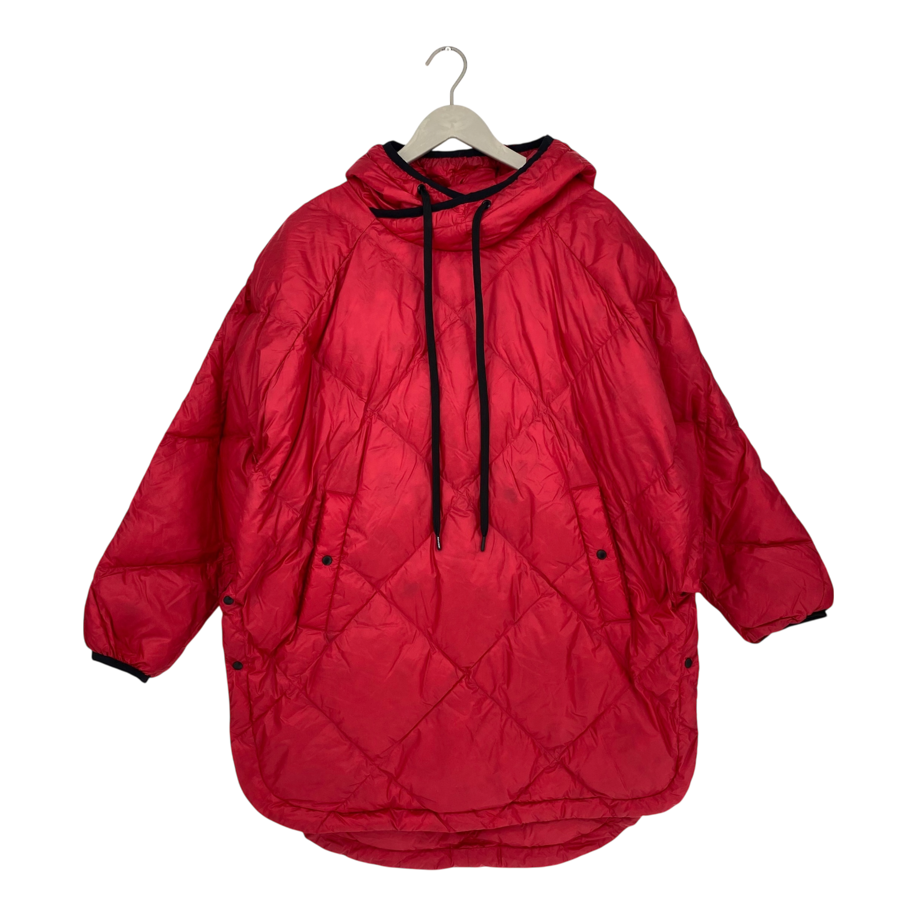 Joutsen Velho down anorak provides warmth, comfort, and versatility. This soft and multifunctional garment blends the best elements of a poncho, anorak, and jacket. It offers protection both on city streets and during outdoor adventures, as well as at rest stops. The unisex design adapts to the wearer's needs, and the side snap buttons add flexibility for various uses. Thanks to its adjustable fit, the hood sits snugly like a hat. The roomy neckline allows for easy layering – you can slip the Velho over another jacket for added warmth, but it works just as well on its own.