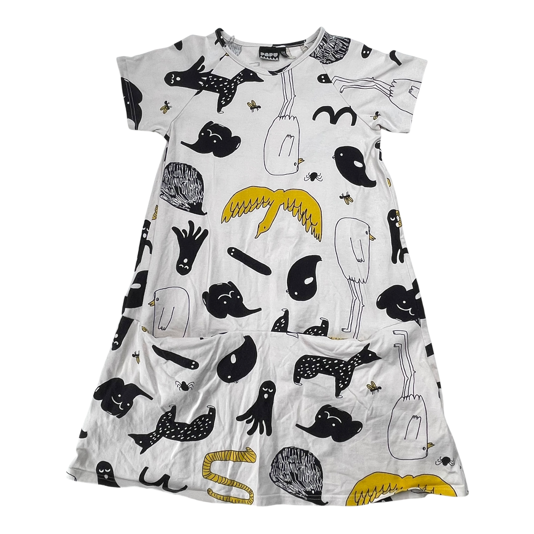 Papu dress with two front pockets in a bird print.
