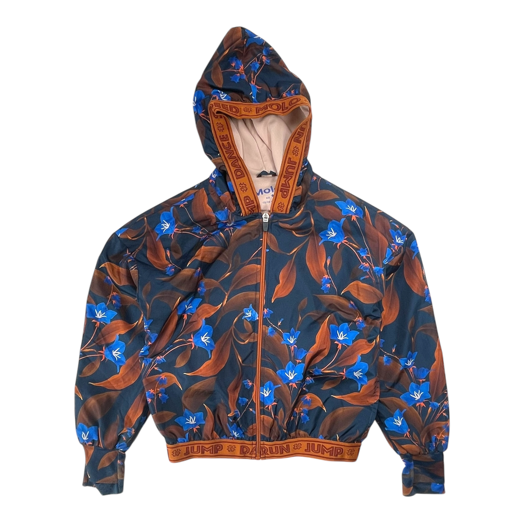 Molo Ophelia is a roomy sports jacket in blue flower print. The jacket has a zip closure and a hood as well as black and white edge tape with text.