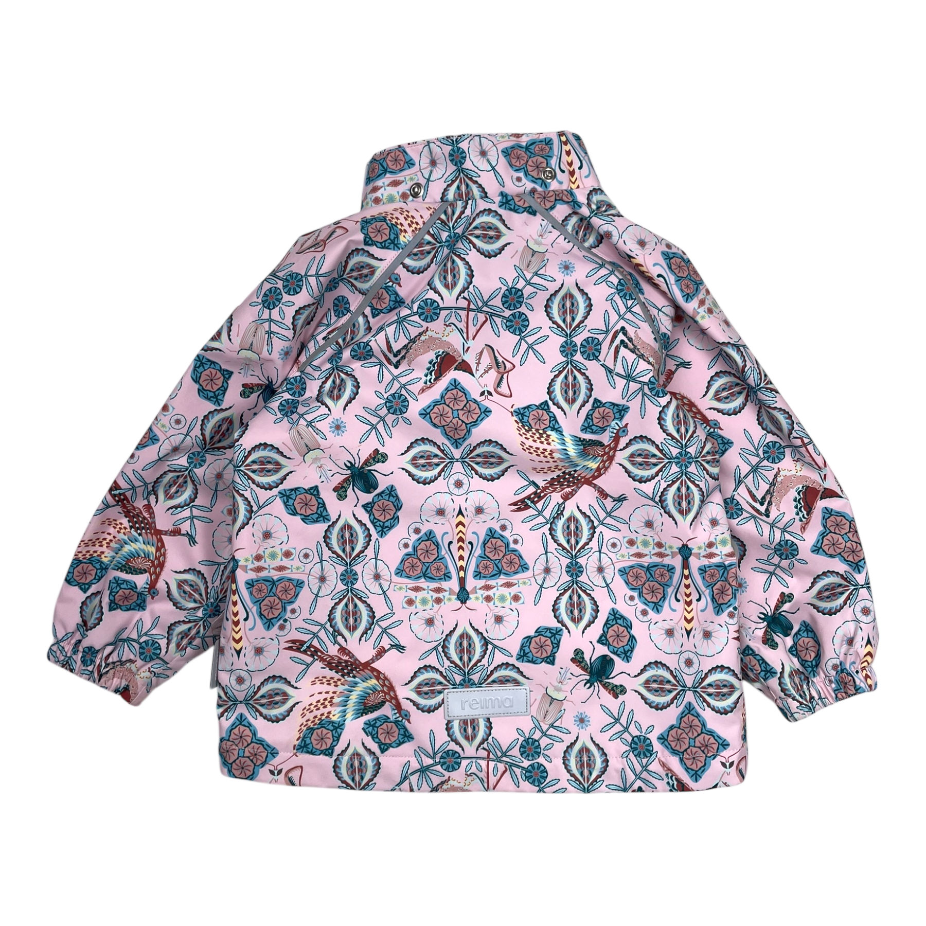 Reima Hete shell jacket in print designed by Klaus Haapaniemi. Jacket has two front pockets and a removable hood. Originally waterproof up to 10 000mm water column.