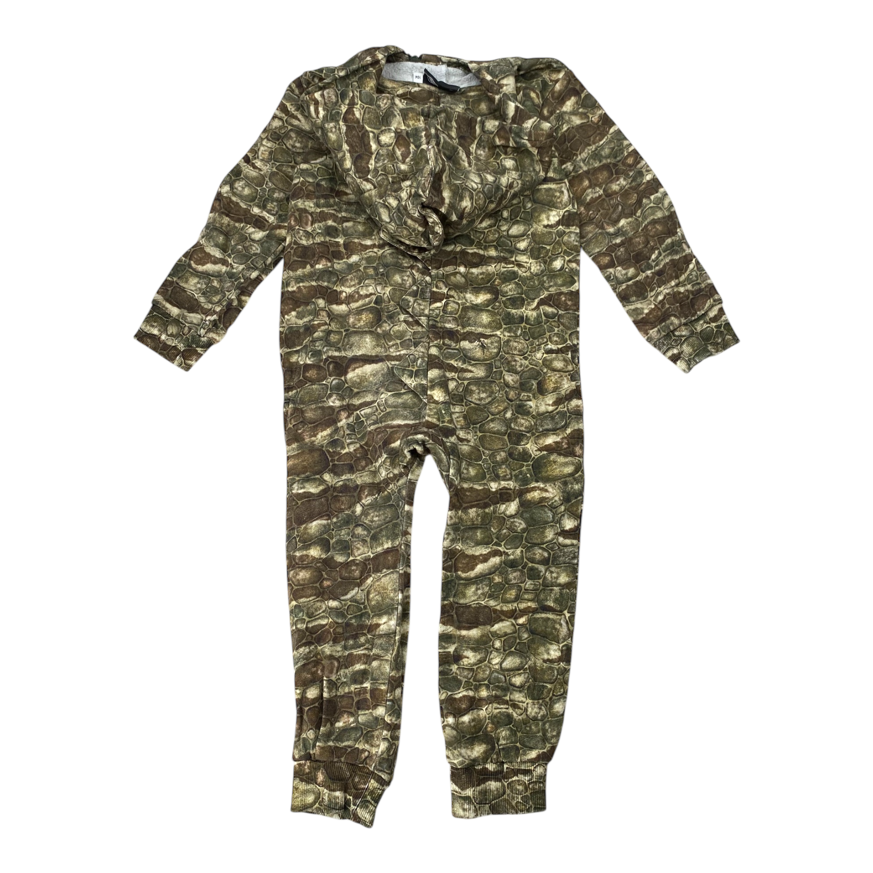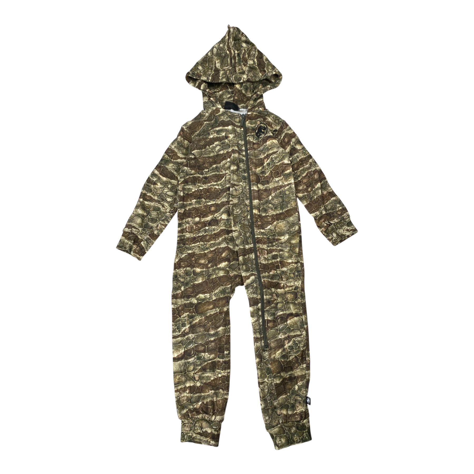 Molo jumpsuit with snap buttons on legs and on the shoulder in dinosaur print.