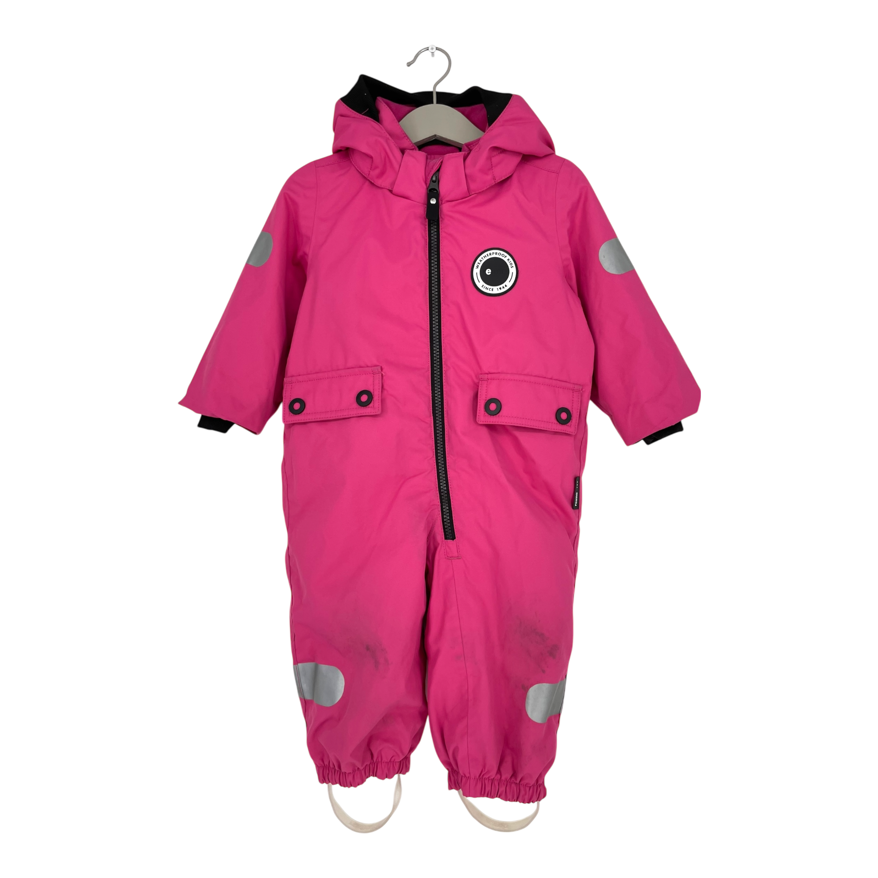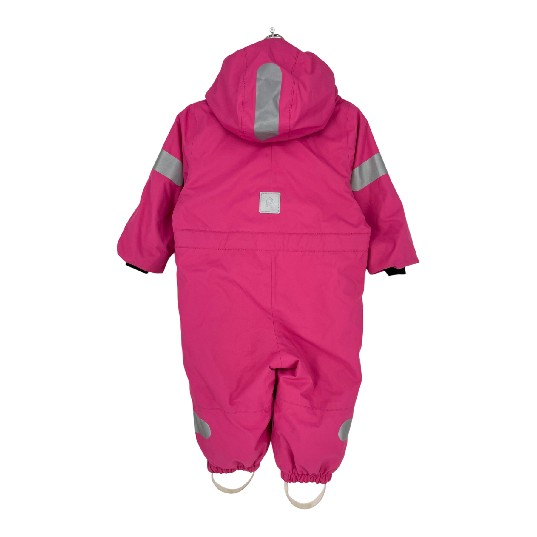 Reima Marte Mid midseason overall with detachable hood, adjustable waist, two flap pockets on the front, durable foot loops, and reflective details. The garment is originally waterproof up to 10,000mm water column, the material is dirt repellent, and all seams are sealed.
