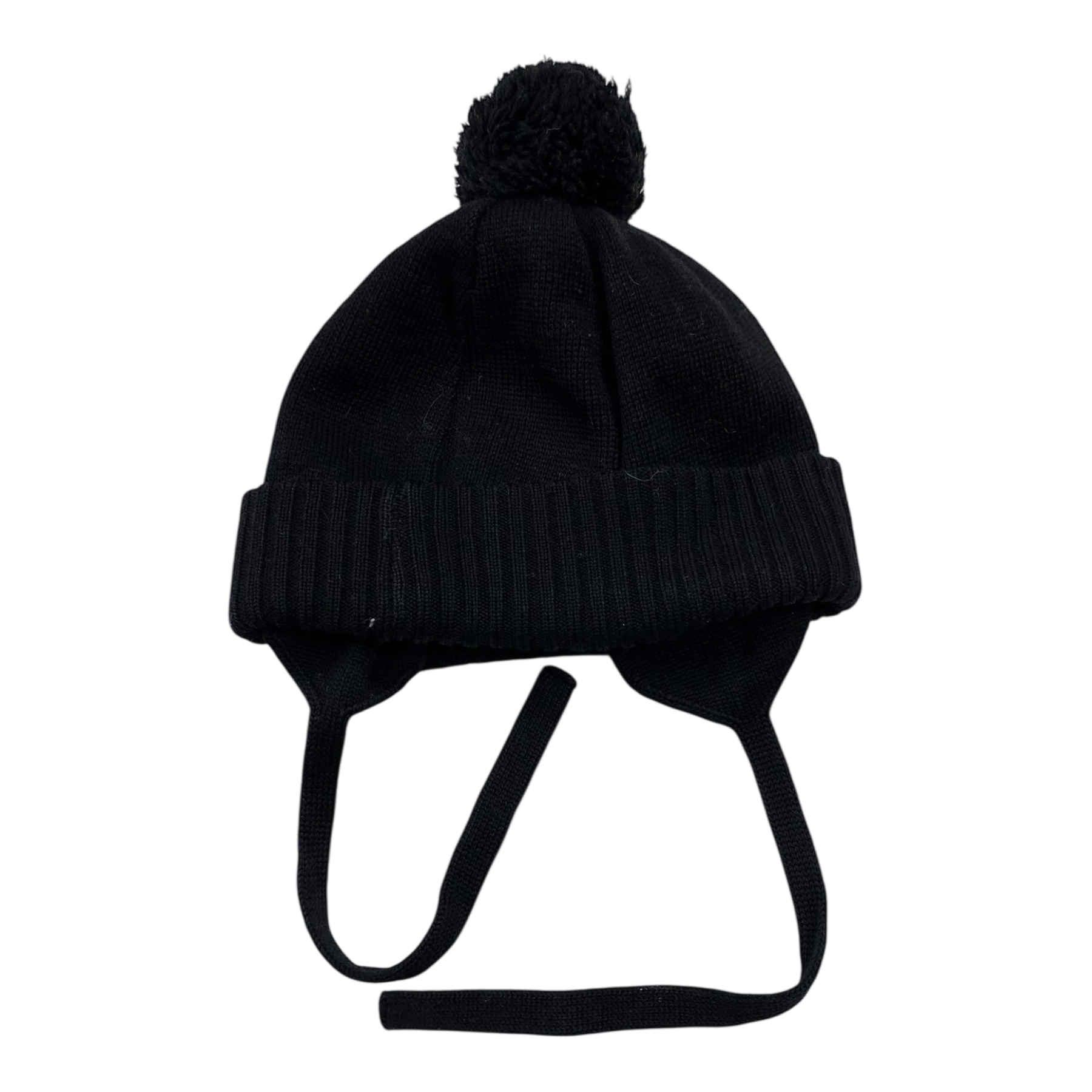 Papu knitted merino wool beanie with a pom pom on top and strings to tie with.