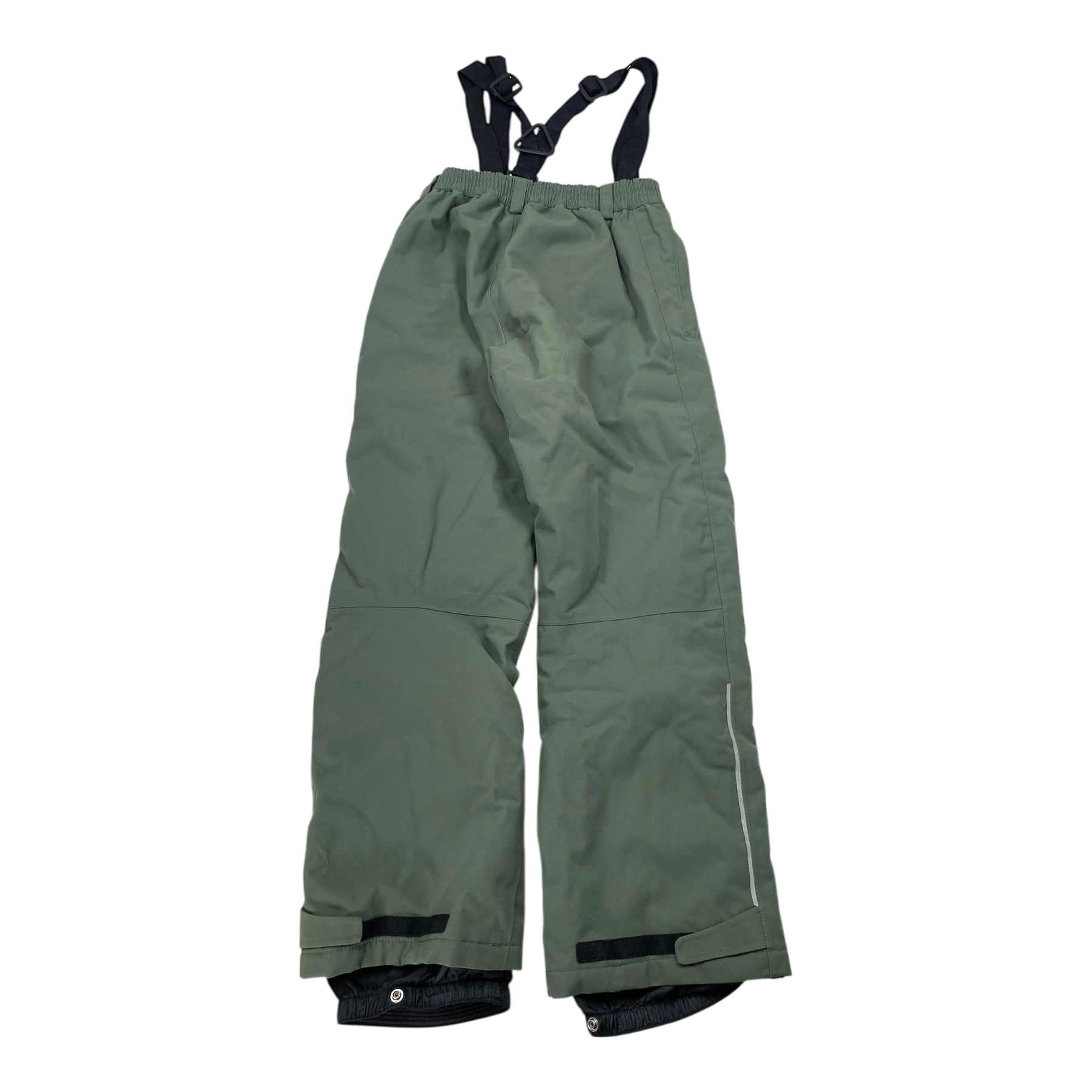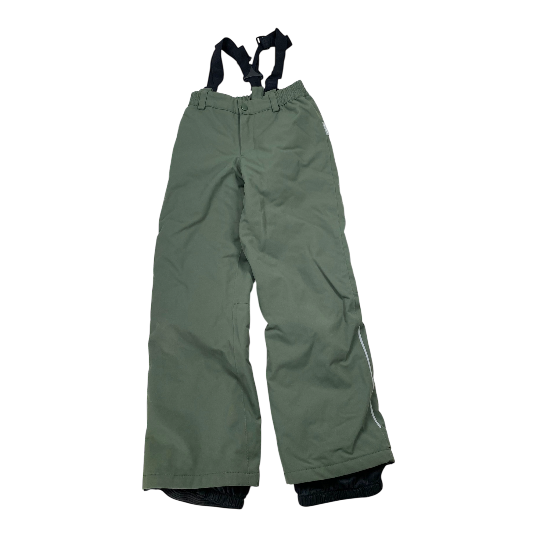 Reima Loikka outdoor pants with elastic and adjustable suspenders. Pants have a zip pocket, elastic waist, adjustable leg ends with snow locks.
