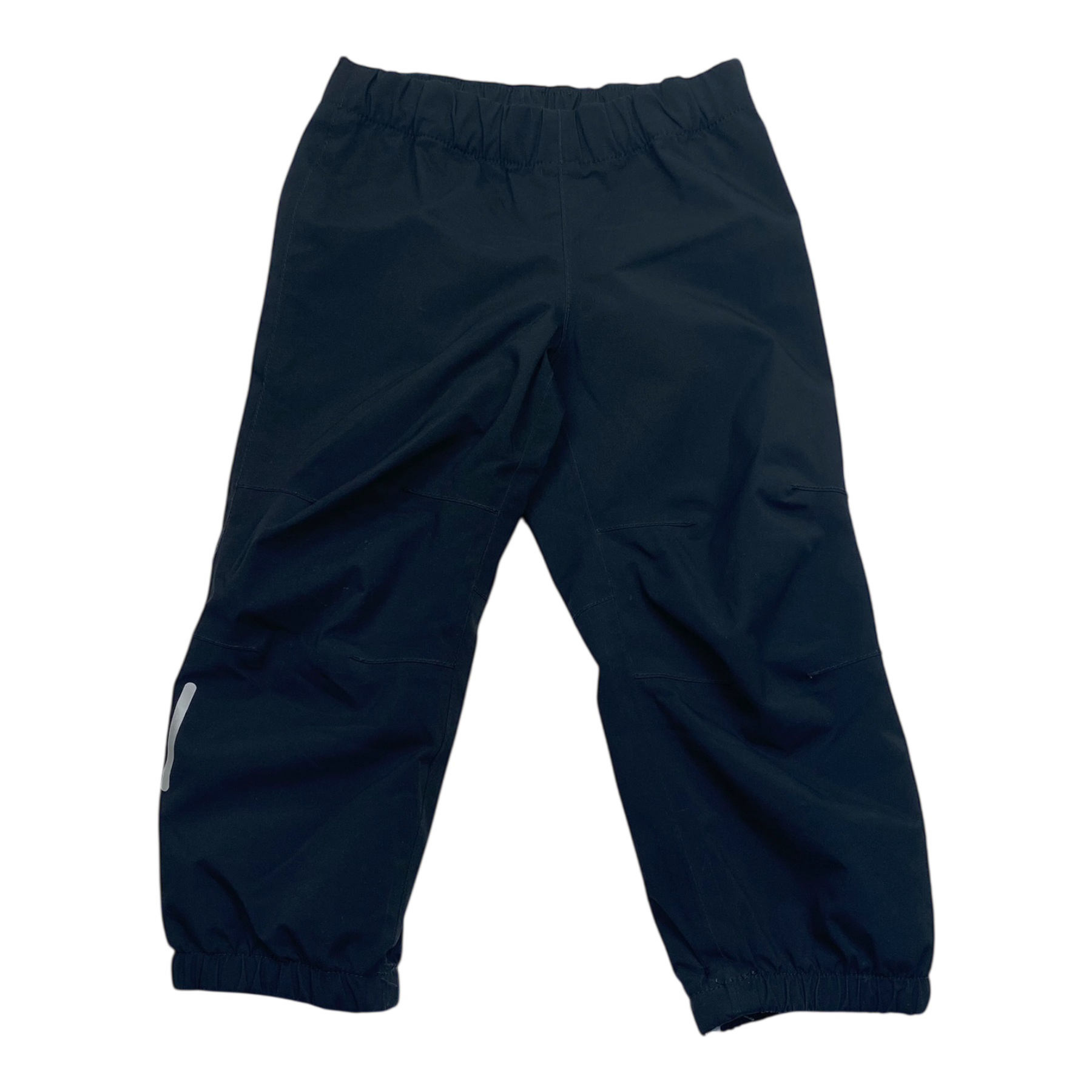 Reima Kaura midseason outdoor pants with rubber footloops. Originally waterproof up to 8000mm water column. Material is breathable. Elastic, adjustable waist and reflective details on sides.