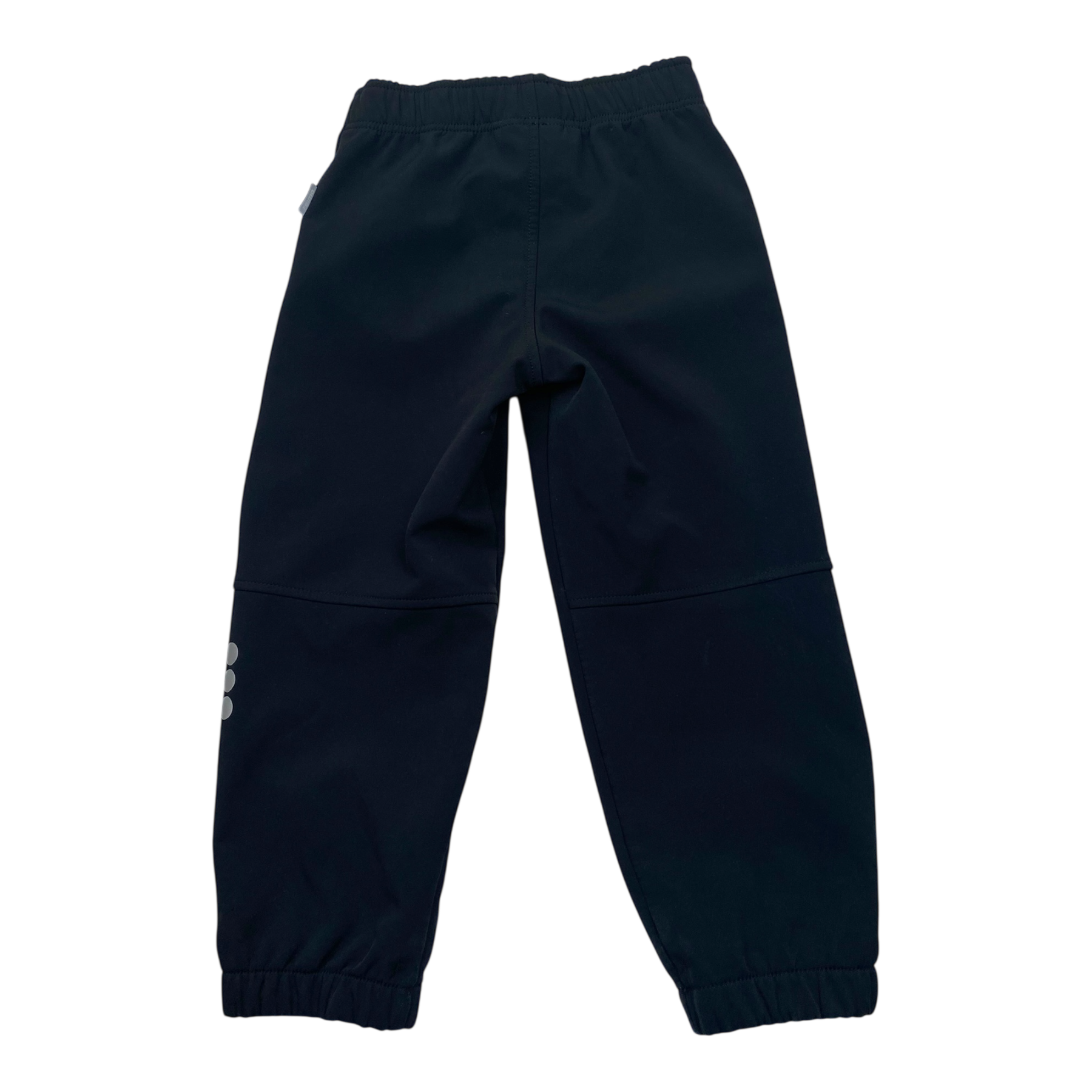 Reima Oikotie kid's outdoor softshell pants has adjustable and elastic waist. Originally waterproof up to 10 000mm water column. The fabric blocks wind outside yet breathes. The item has a small stain.