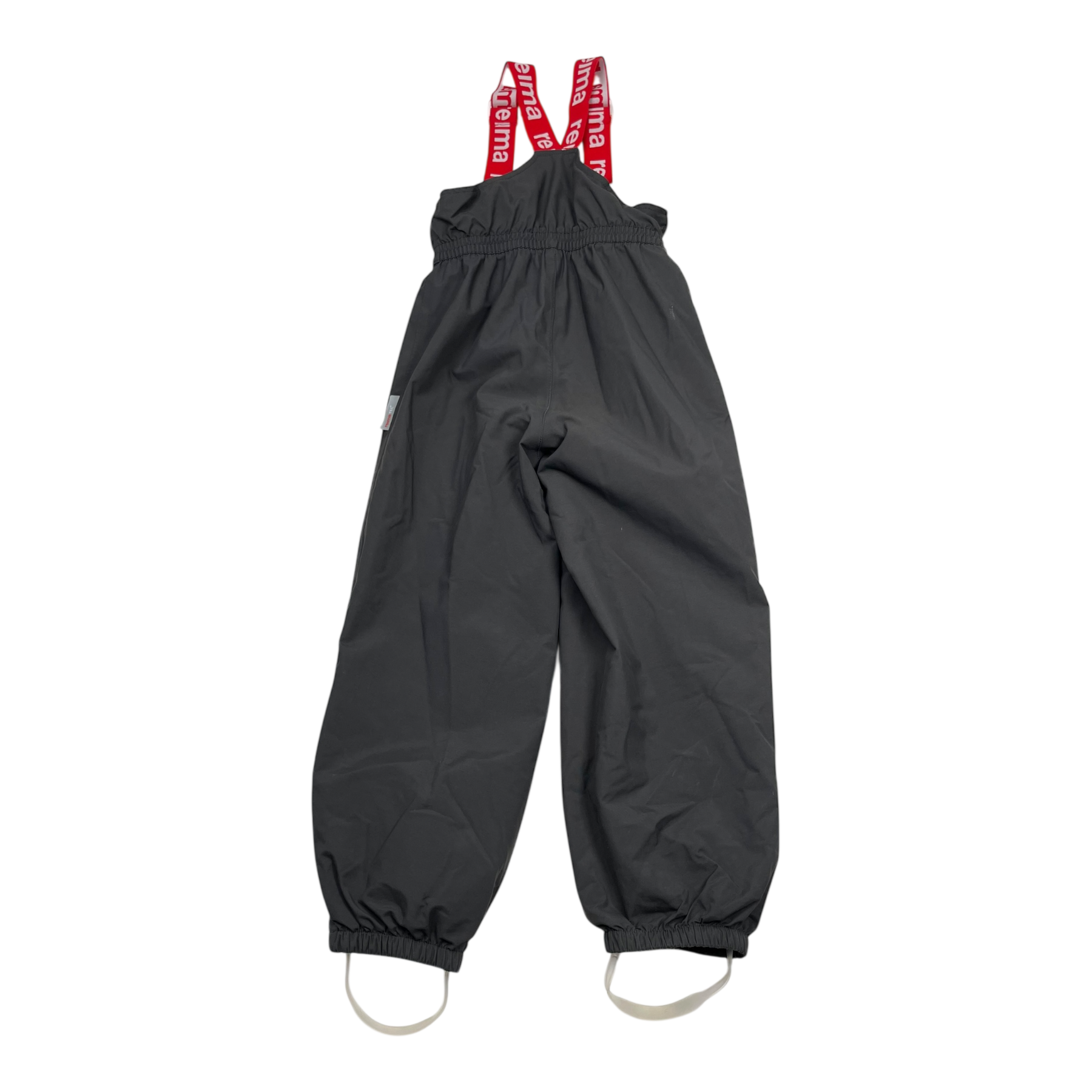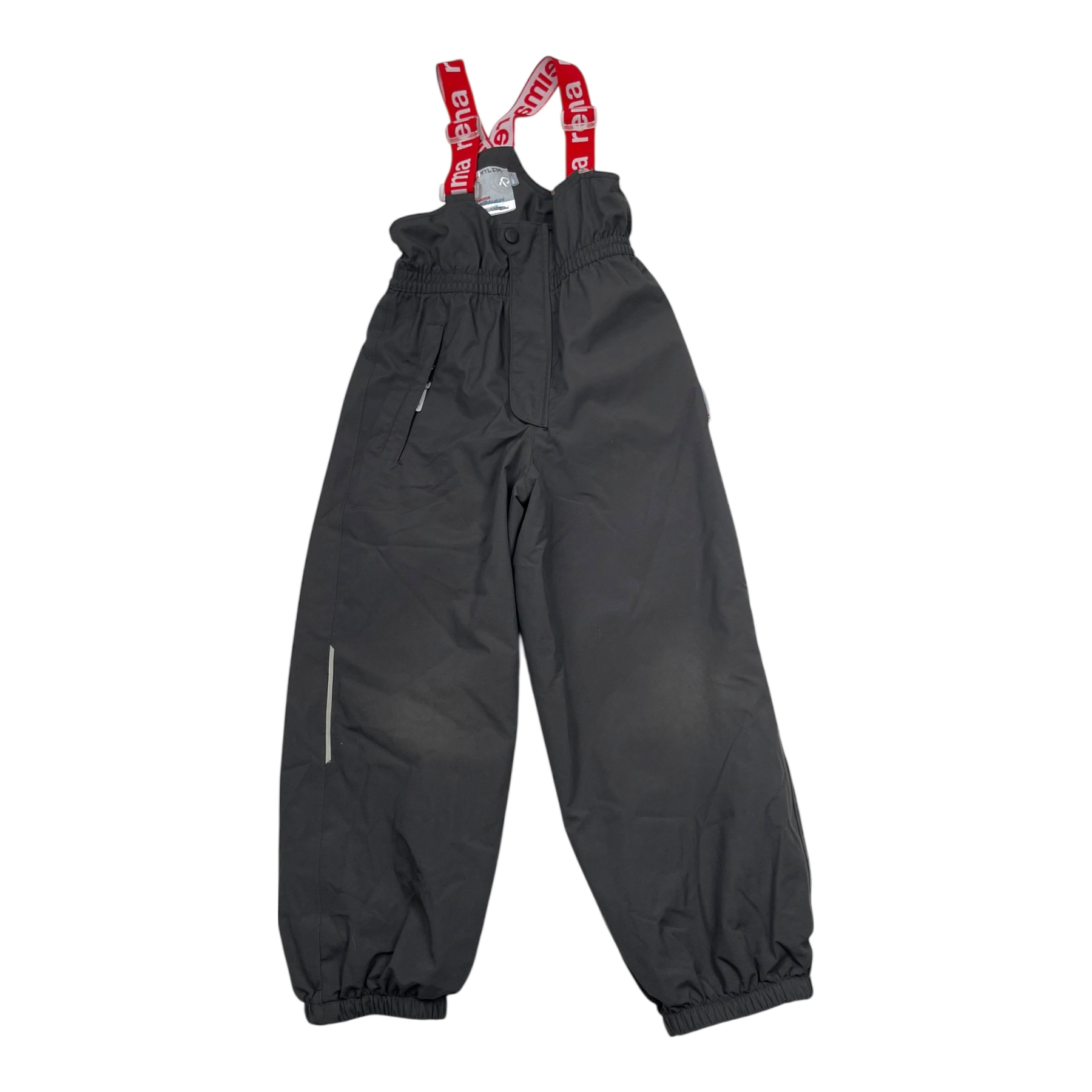 Reima Suoja outdoor pants with suspenders and a zip closure on the front. Pockets on both sides and adjustable foot loops. Pants are originally waterproof up to 10,00 water column. The material blocks the wind while still being breathable.