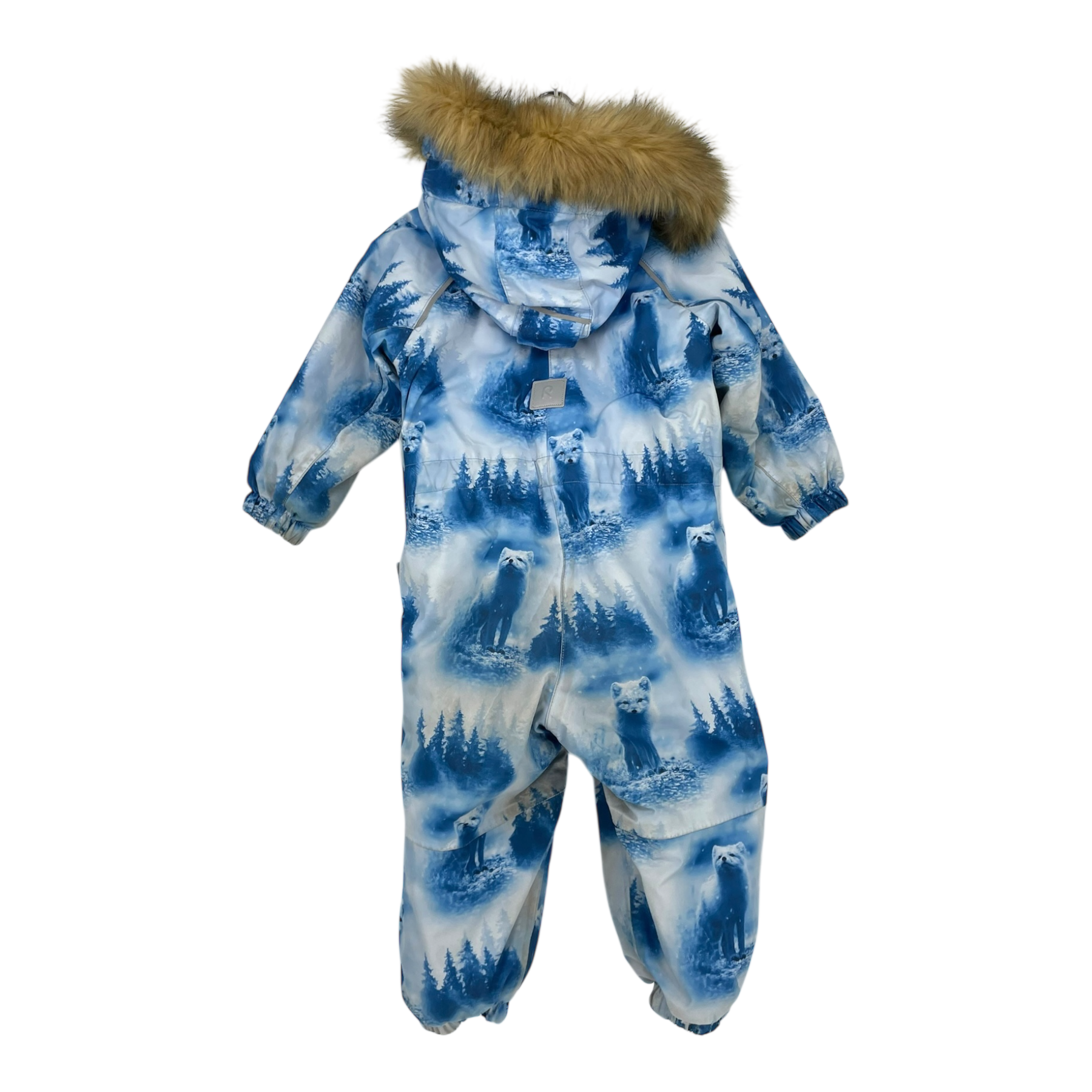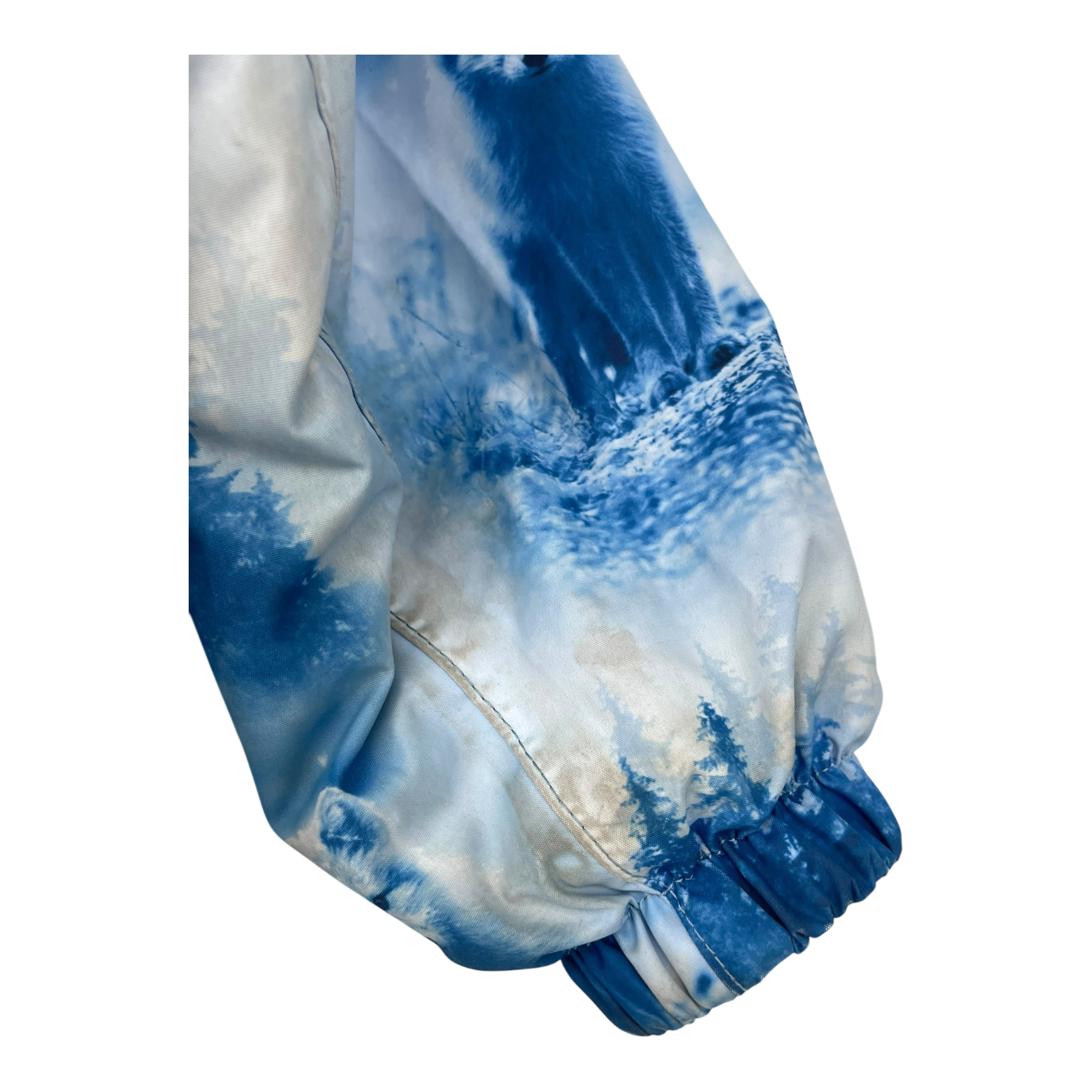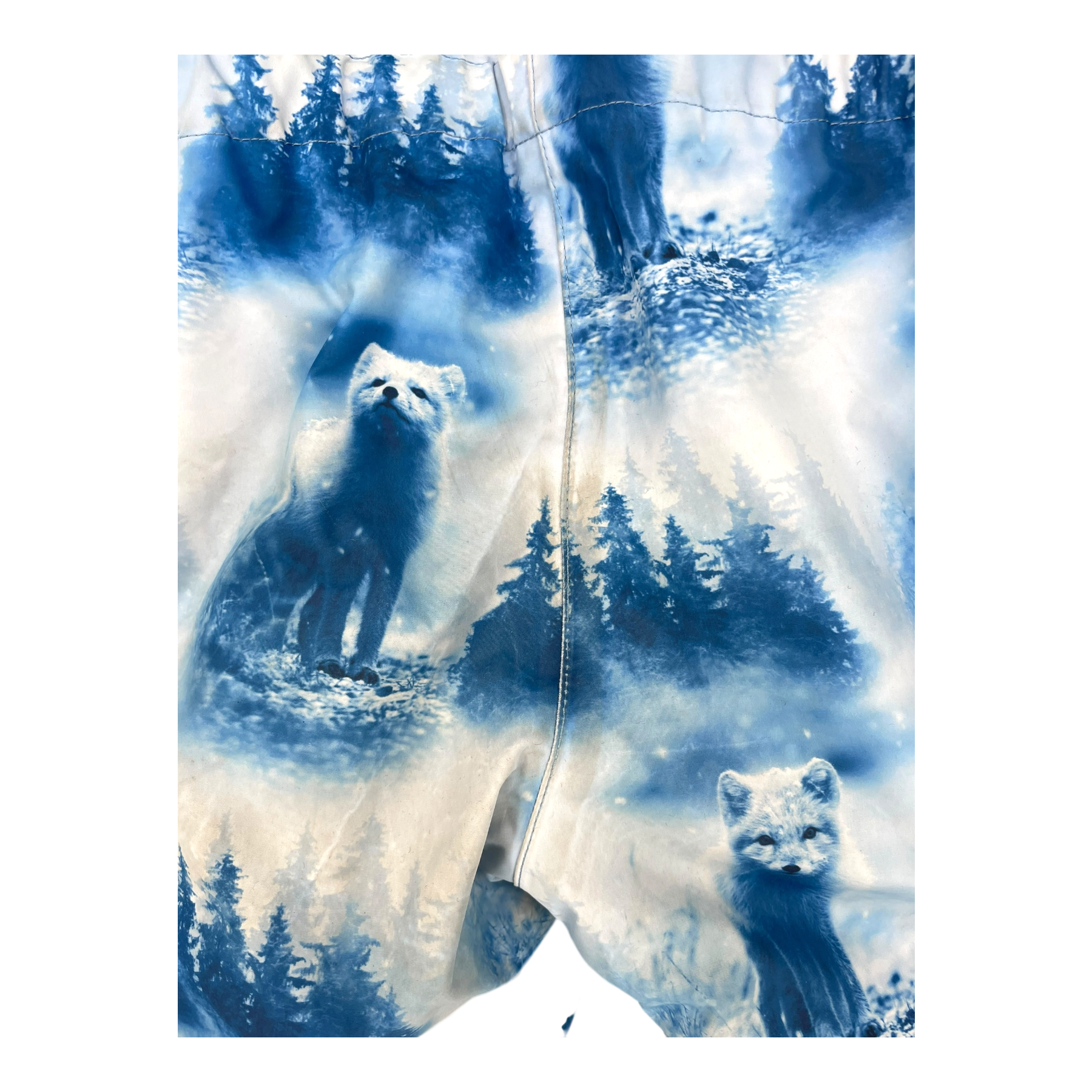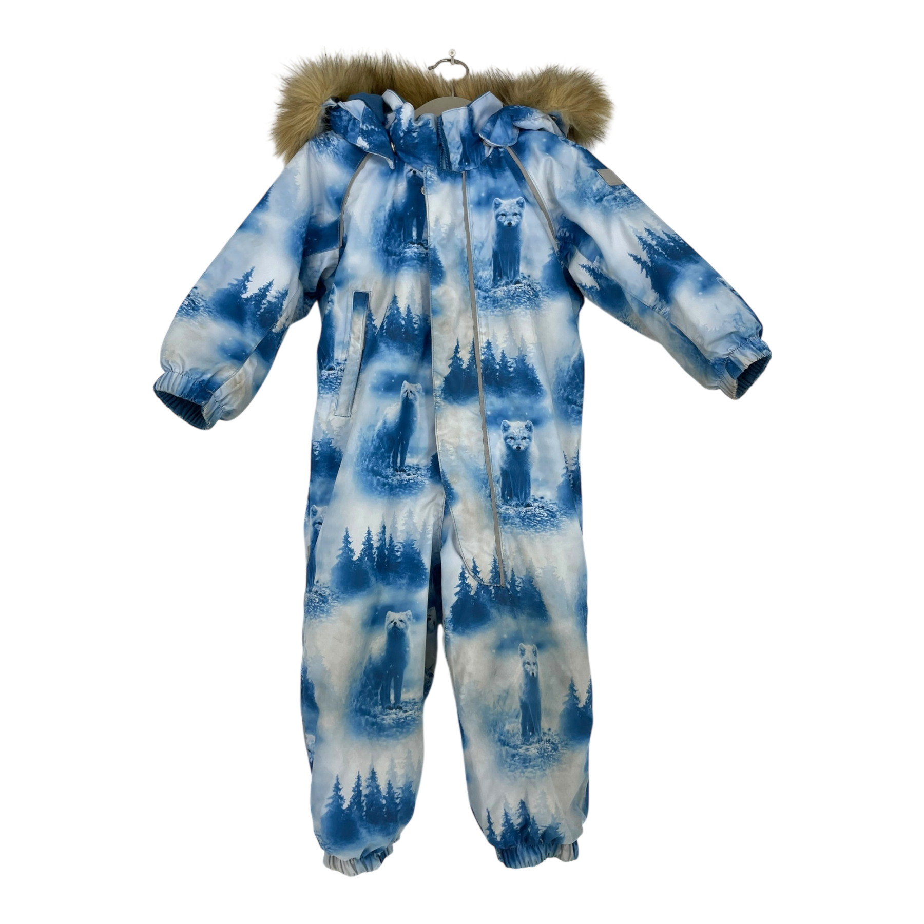 Reima Lappi overall in landscape print with detachable and adjustable hood, two front pockets, and durable silicone foot loops keep the leg ends in place, protecting ankles from moisture and the cold. The seat is insulated to keep bottoms warm and dry during cold-weather adventures.