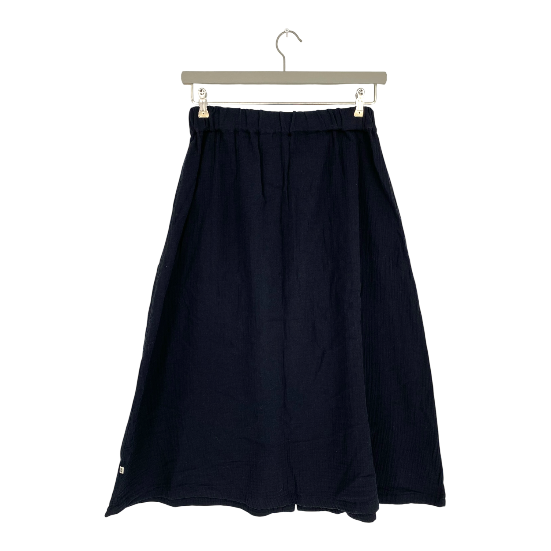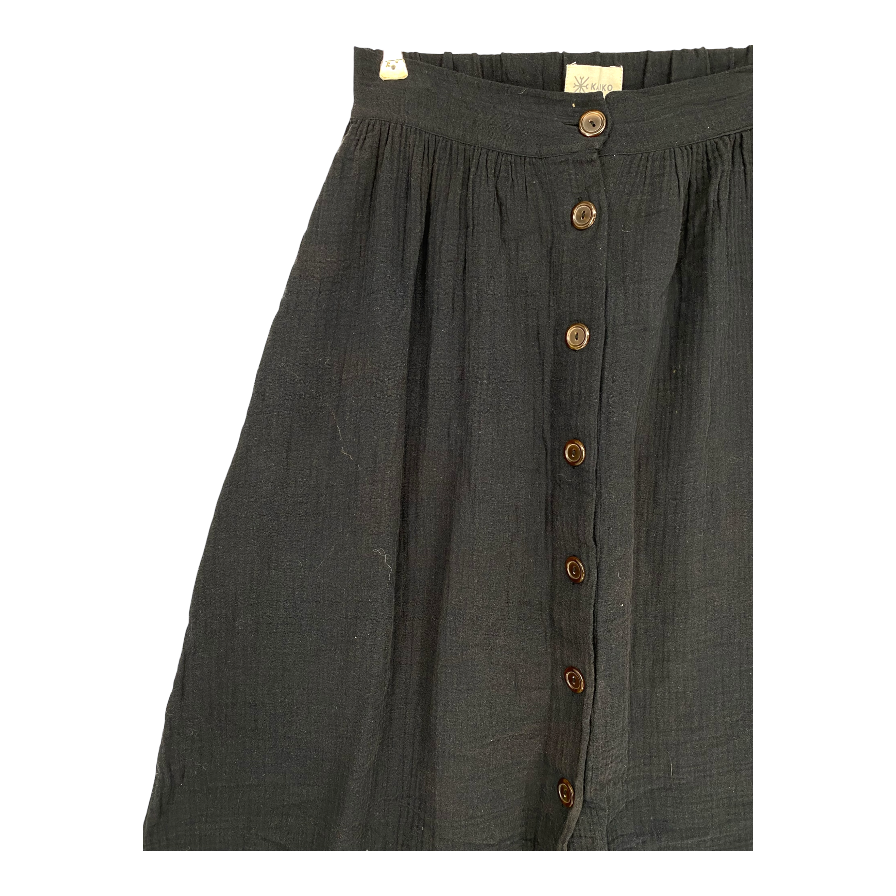 Kaiko midi-length skirt made of woven organic cotton double gauze is embellished with a row of buttons. The elastic waistband at the back makes the button skirt comfortable to wear. Double gauze does not require ironing and you can wear it straight from the clothesline. Unlined.