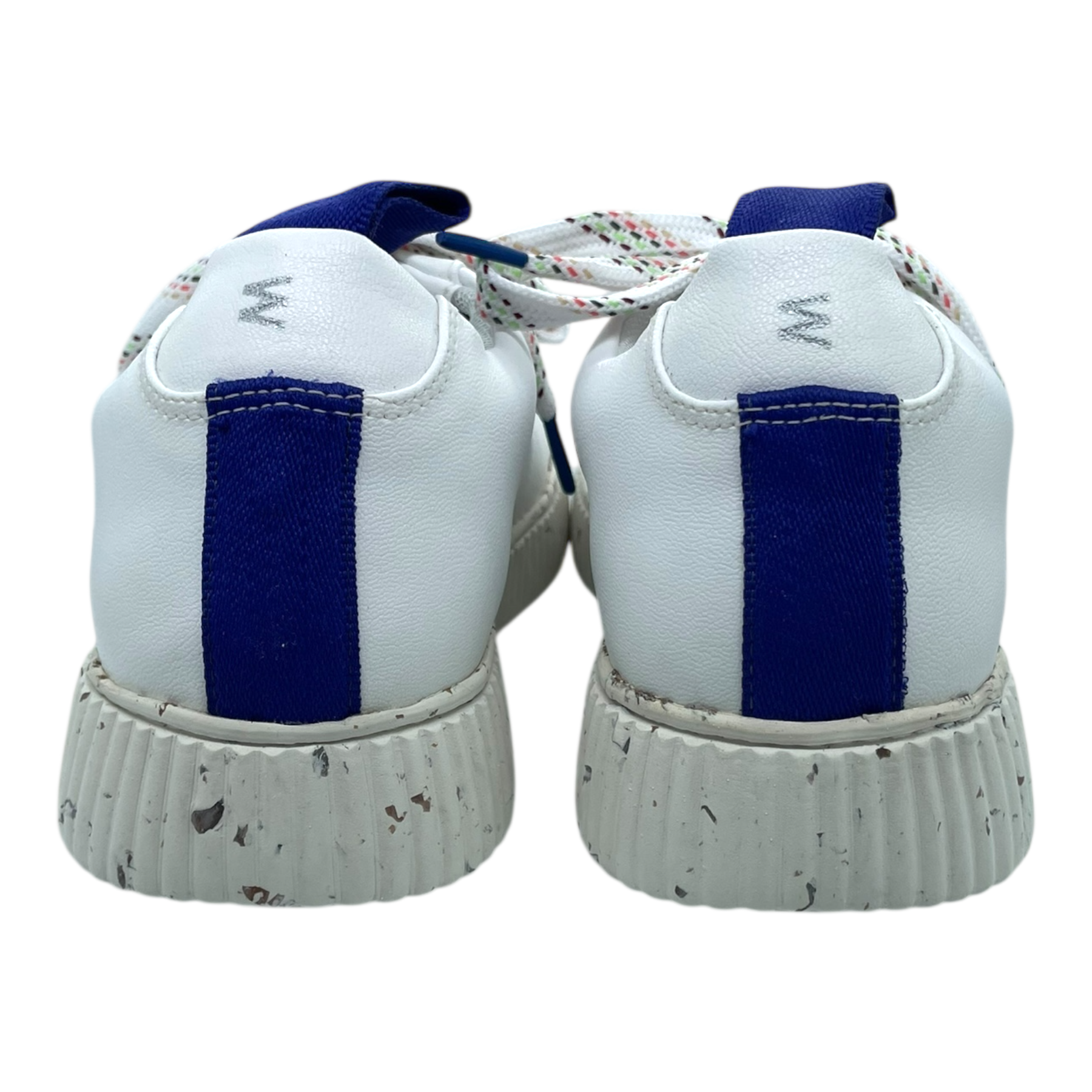 Embassy of Bricks and Logs Bedford sneakers in white vegan leather, a grainy sole and colourful laces, vegan and eco-friendly. Note there is a small pink mark on the right shoe as shown.
