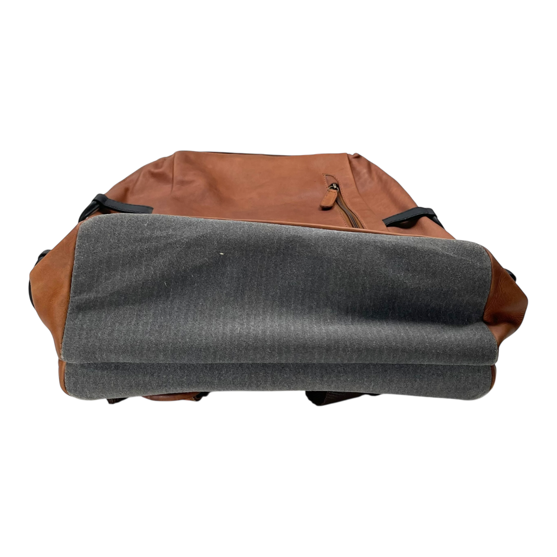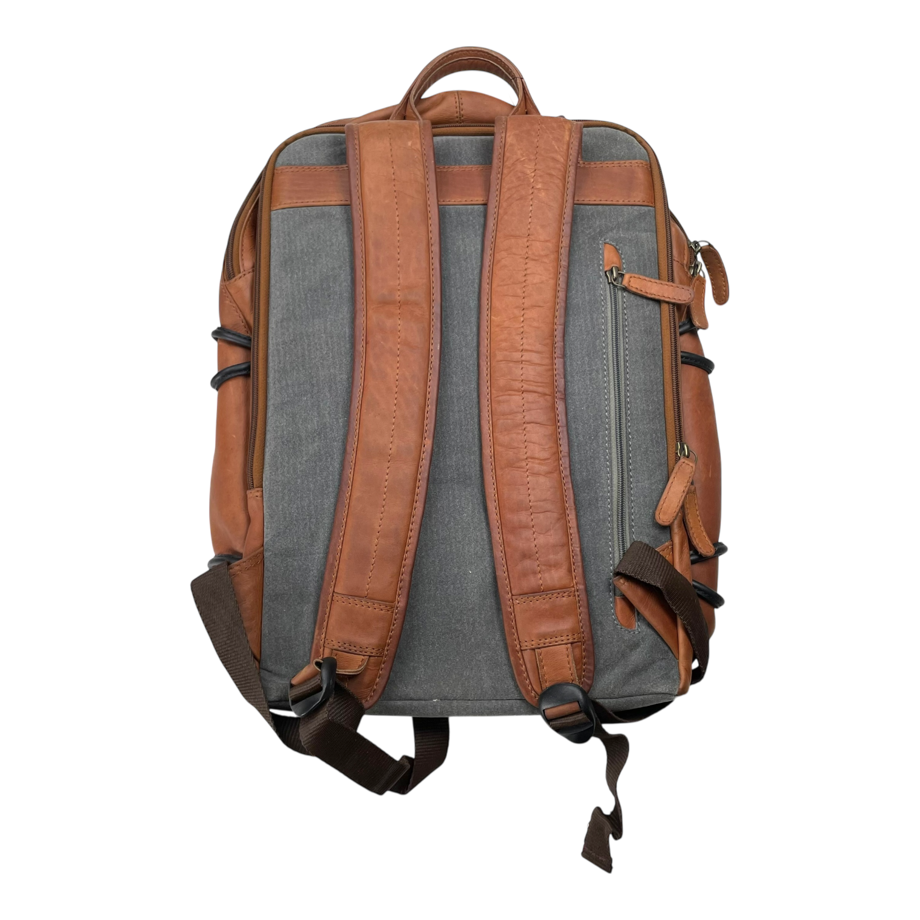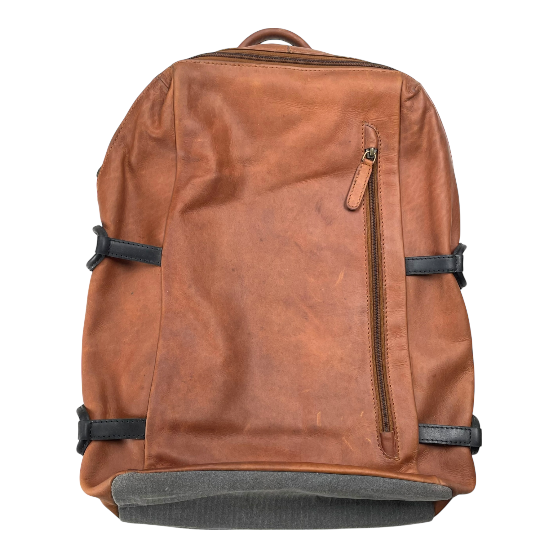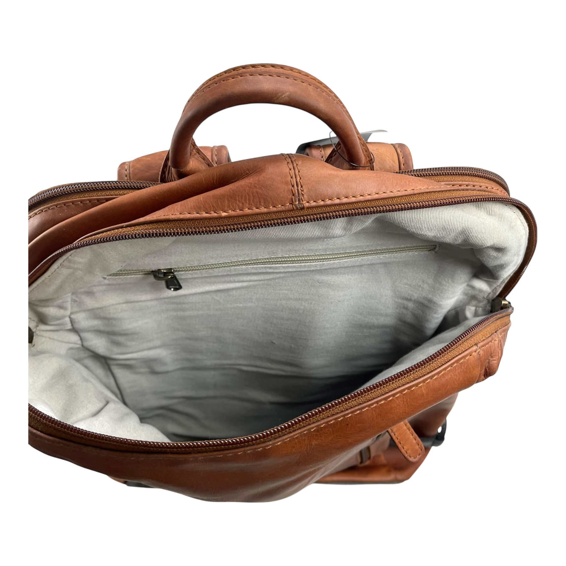 Harolds Bag backpack. There is one zipper closure main compartment and one zipper closure padded laptop compartment. There is also one zippered pocket on the front and the back. The straps are adjustable and there is one handle. Suitable for A4 documents.